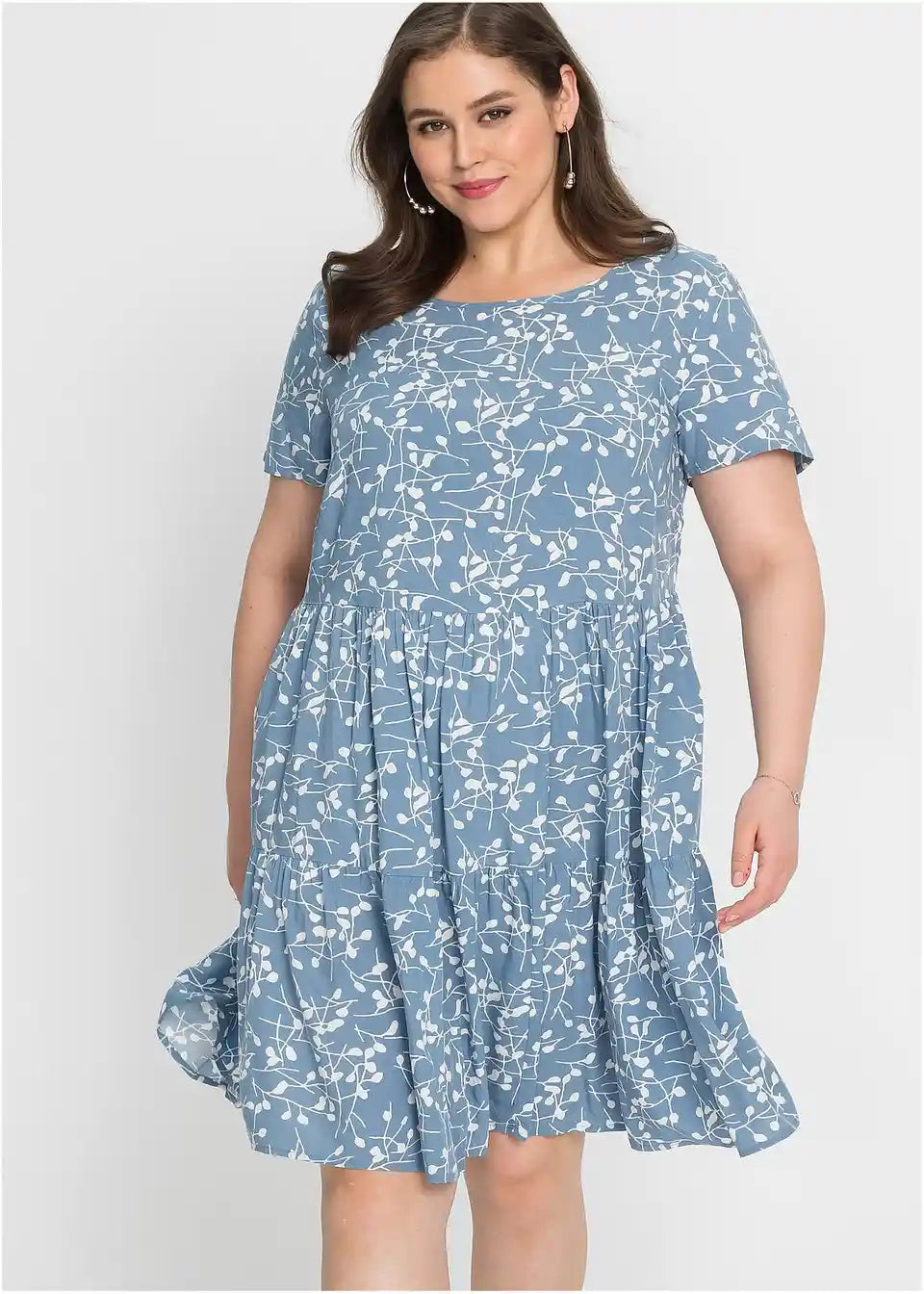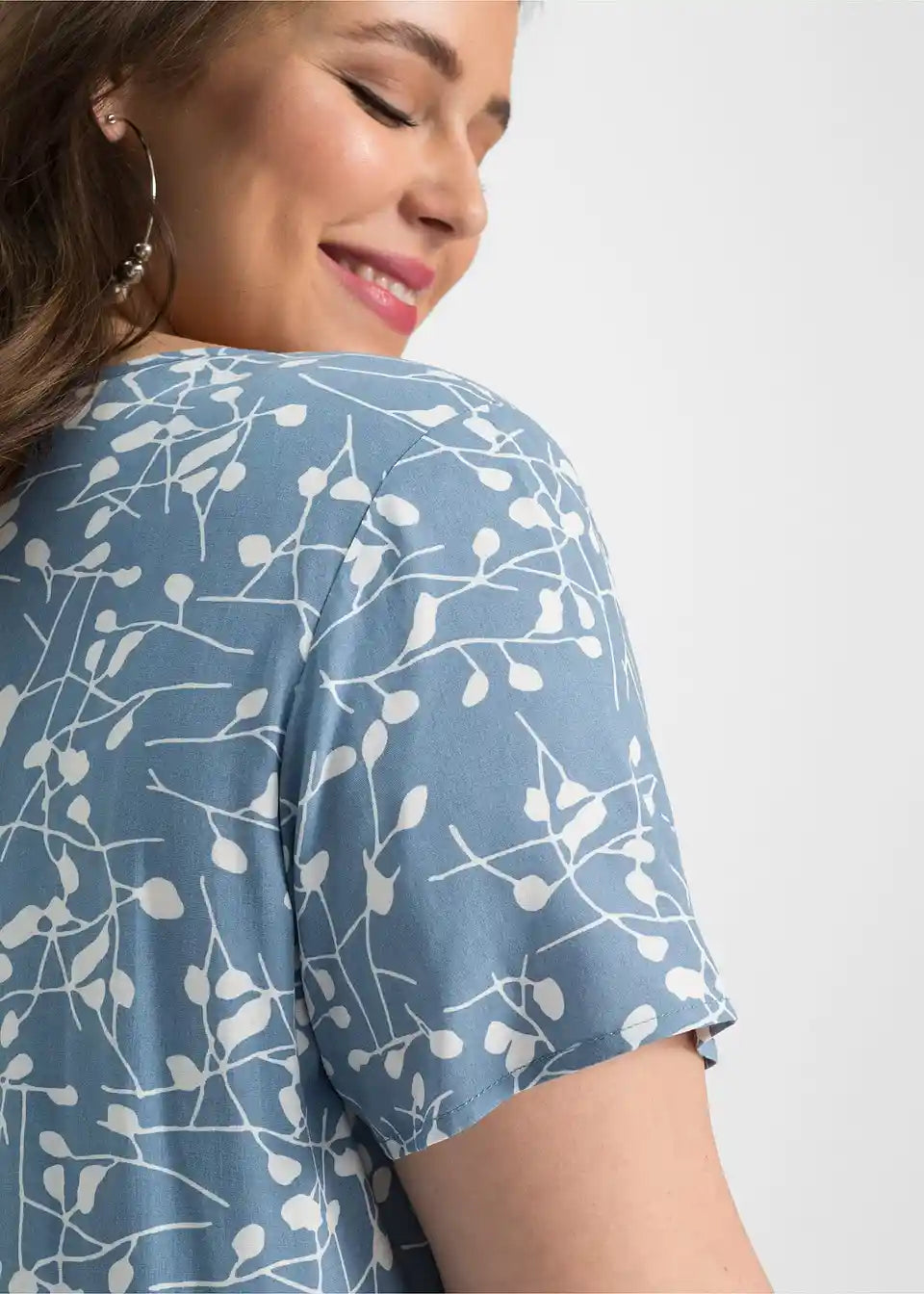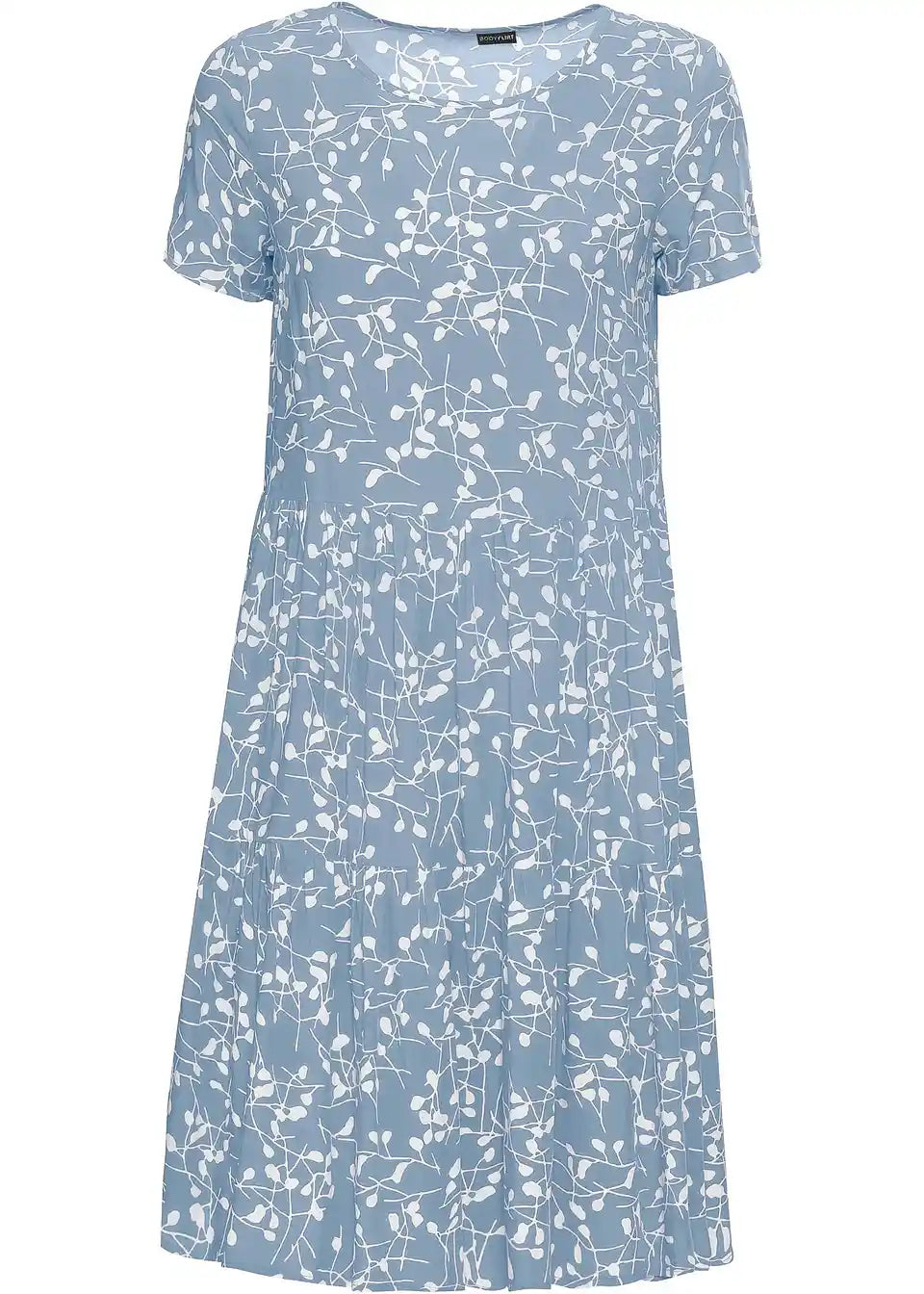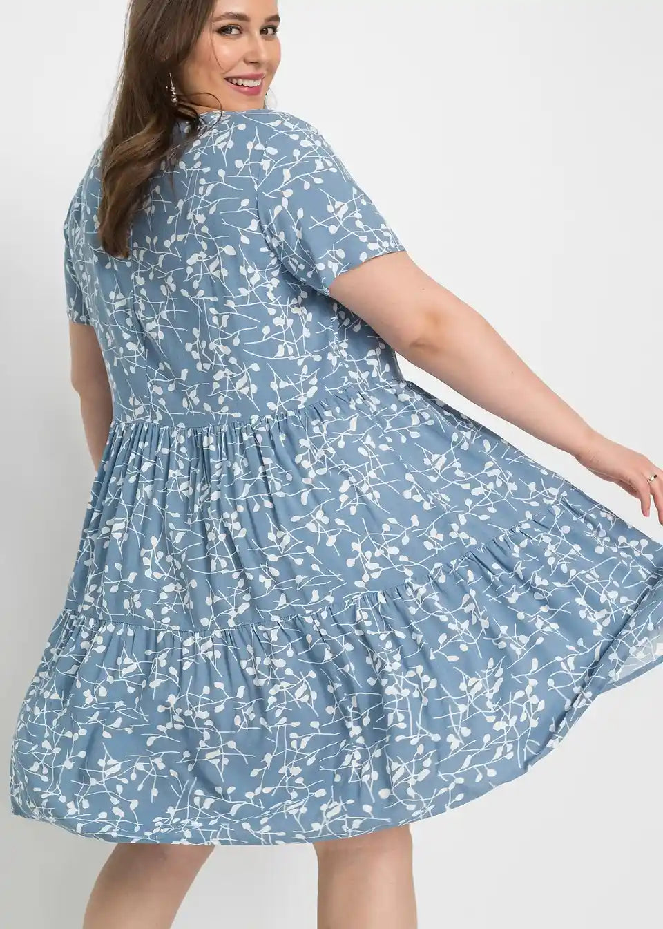 Tiskana obleka z okroglim izrezom, ki sega do kolen. Ohlapen kroj in majhni nabori ob šivih delujejo prikrivajoče in zelo ženstveno.