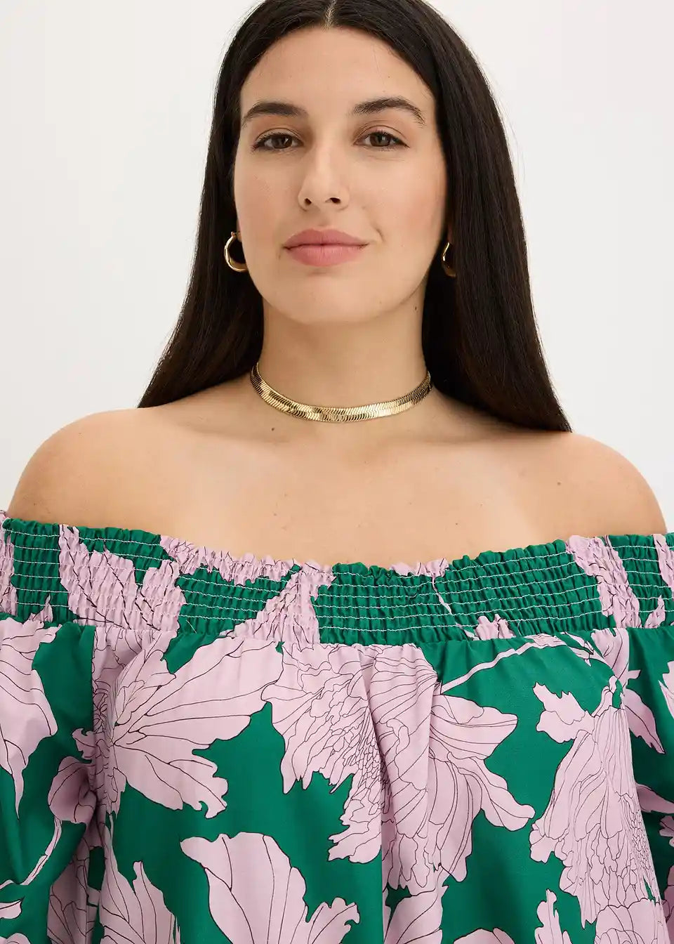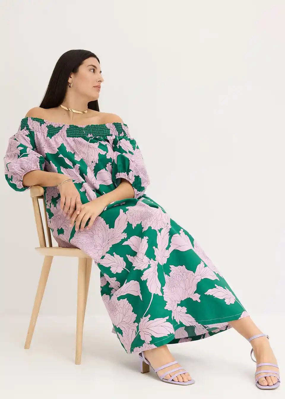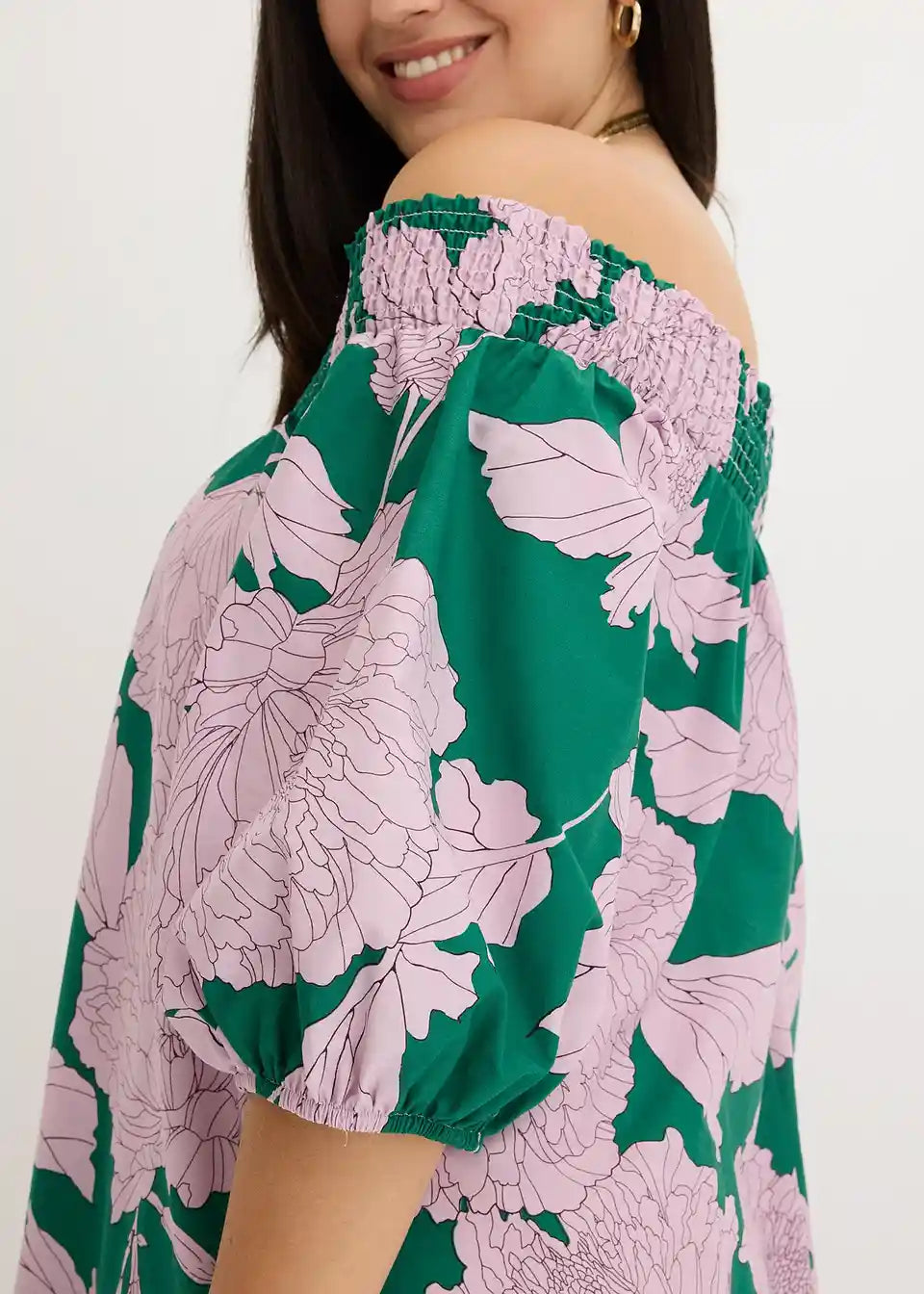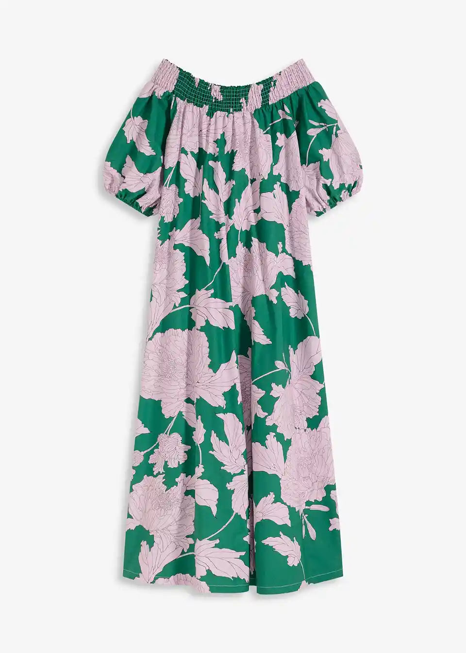 Potiskana obleka s carmen izrezom iz čistega bombaža