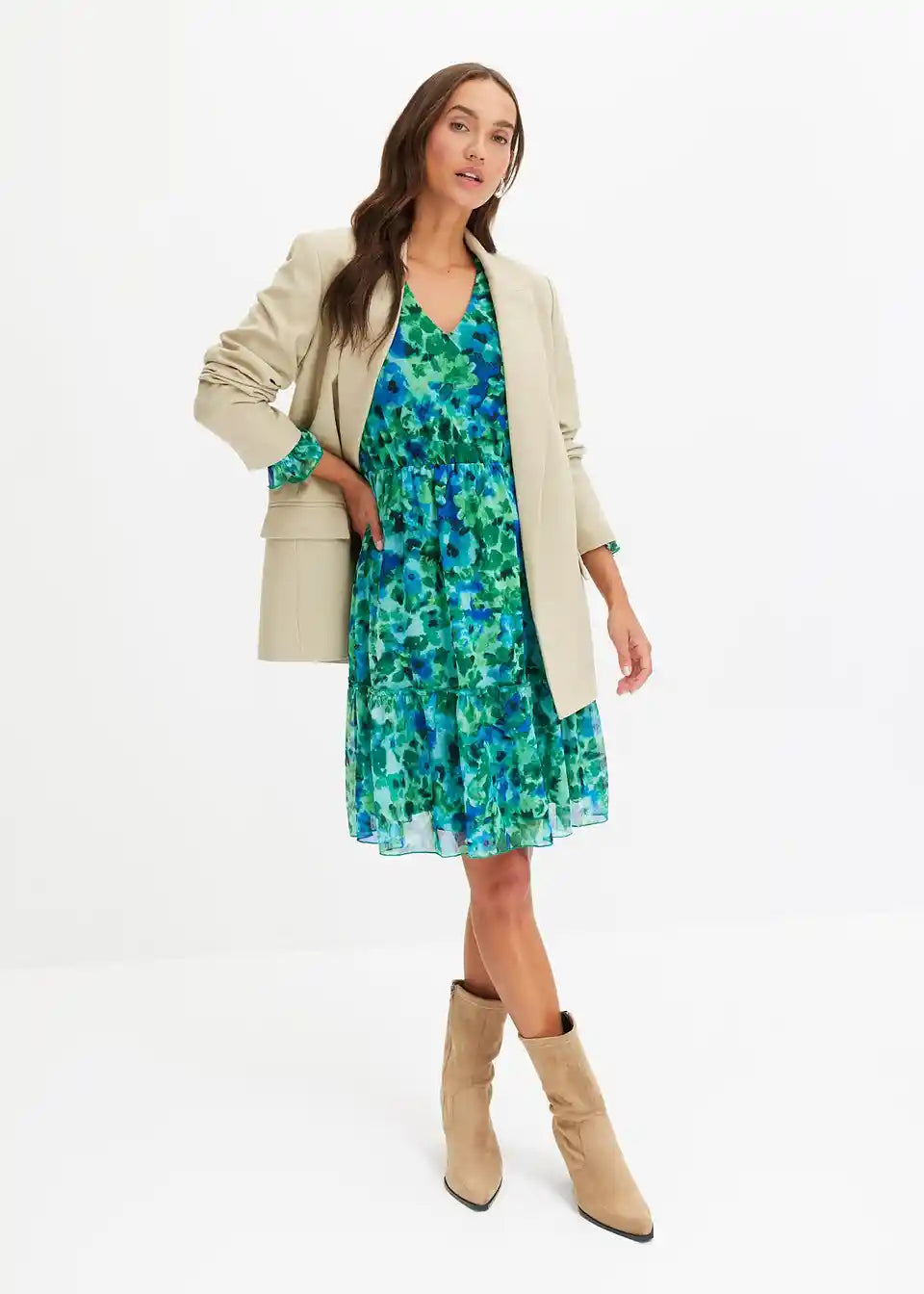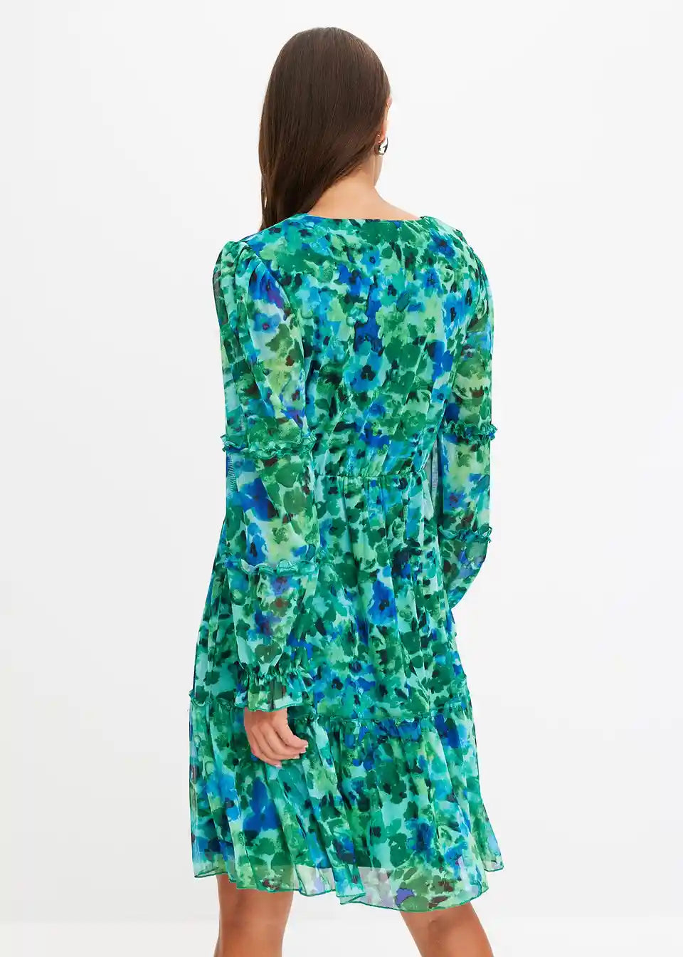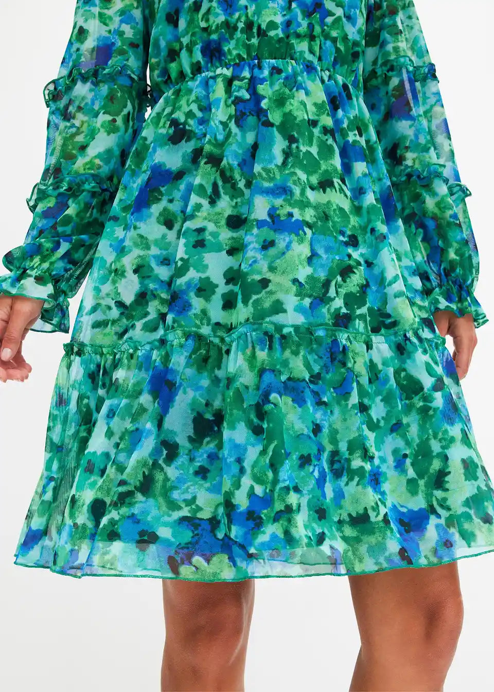 tiskana obleka iz mrežaste tkanine z majhnimi volančki na rokavih