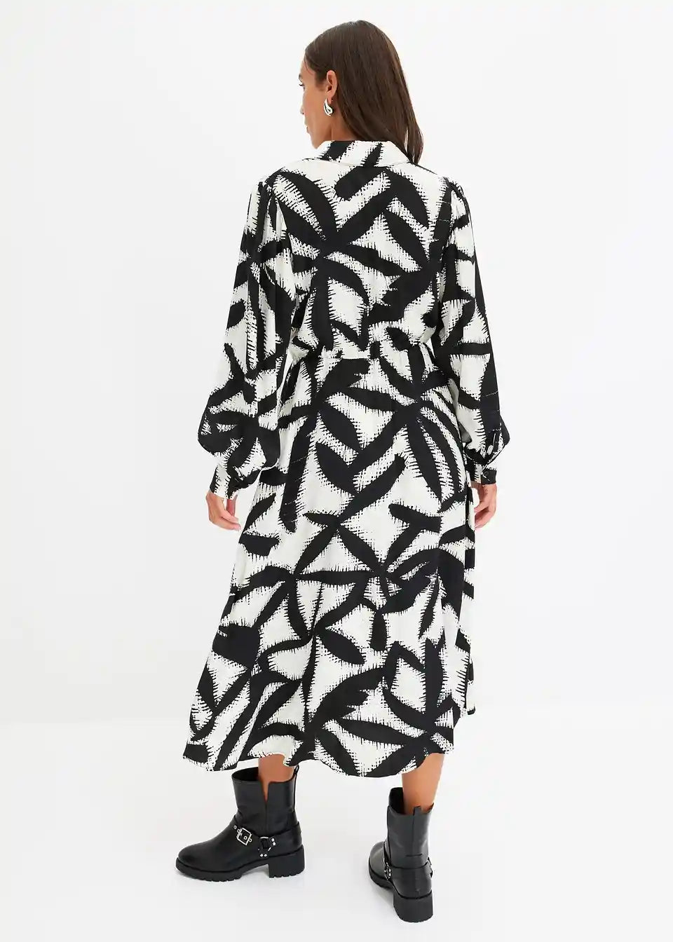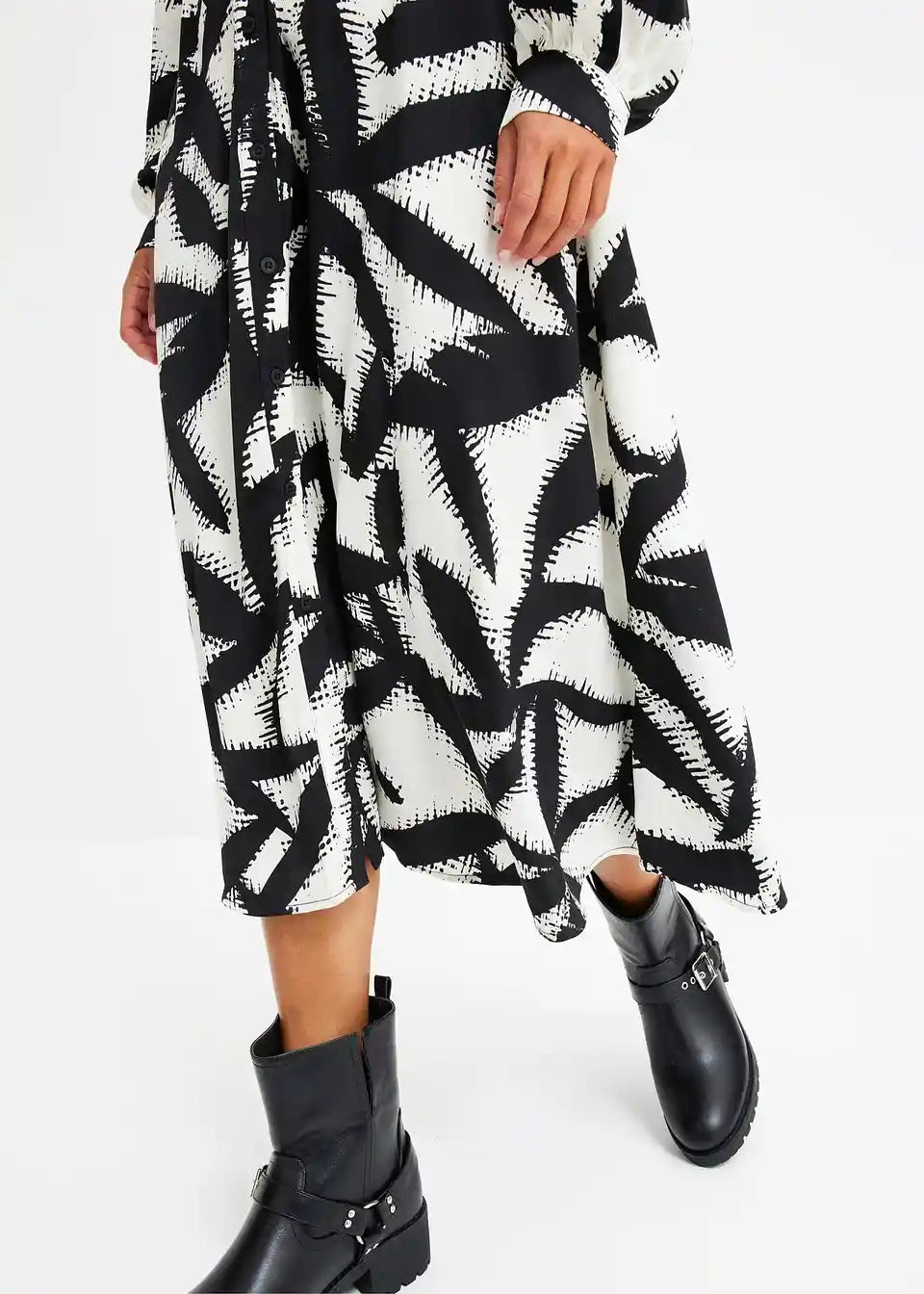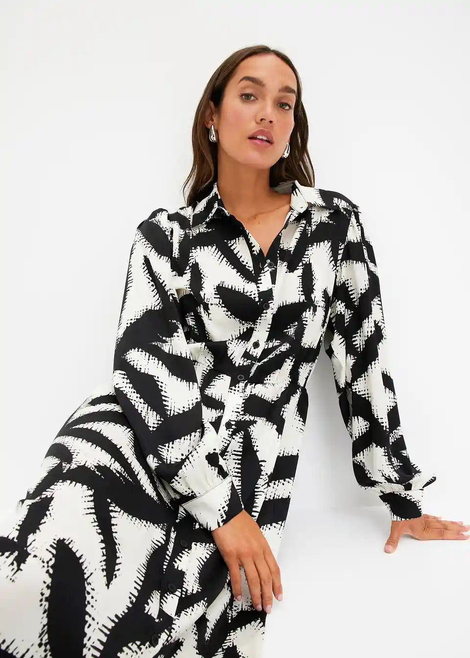ženska satenasta midi obleka z grafičnim potiskom in sprednjim zapenjanjem na gumbe