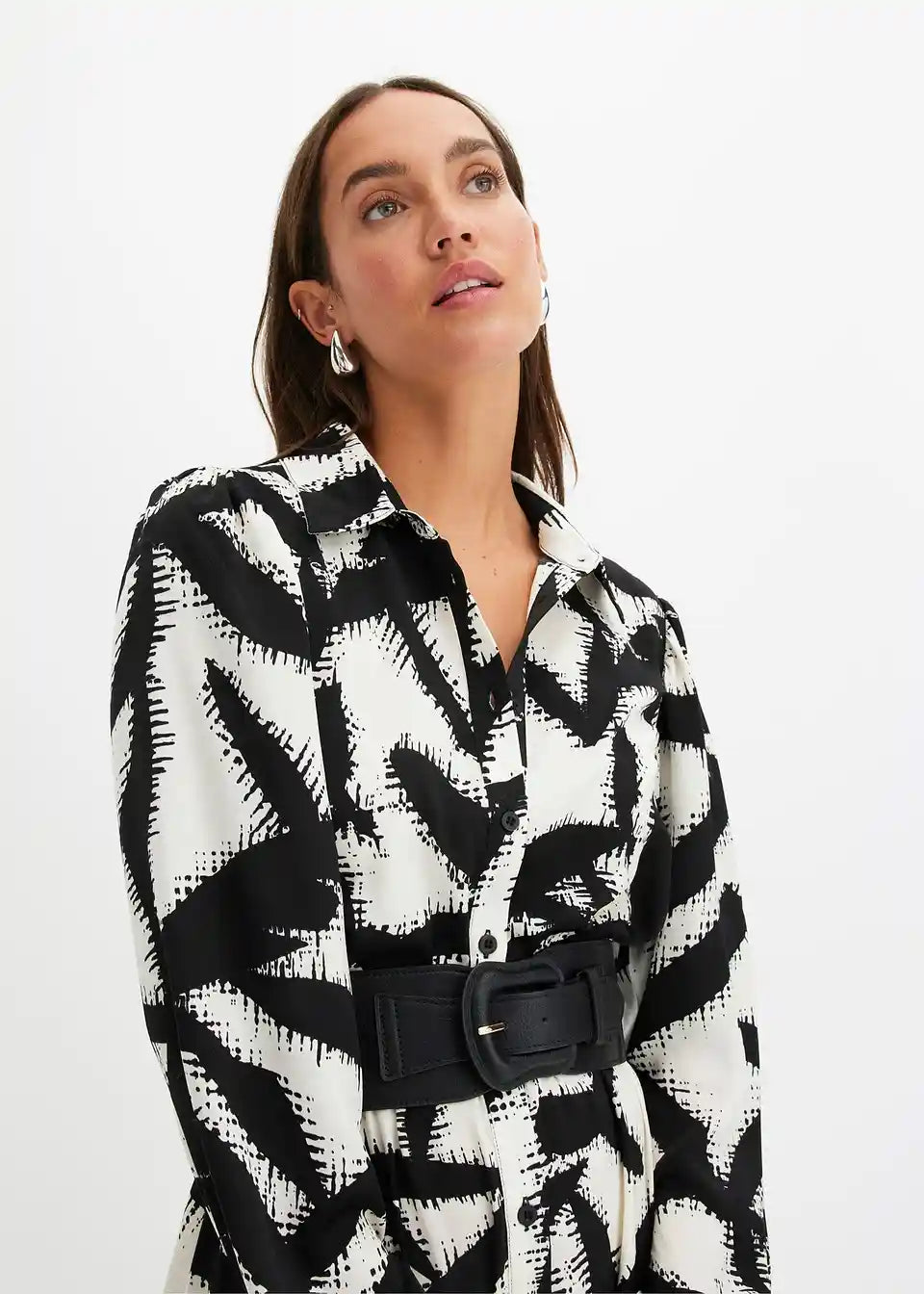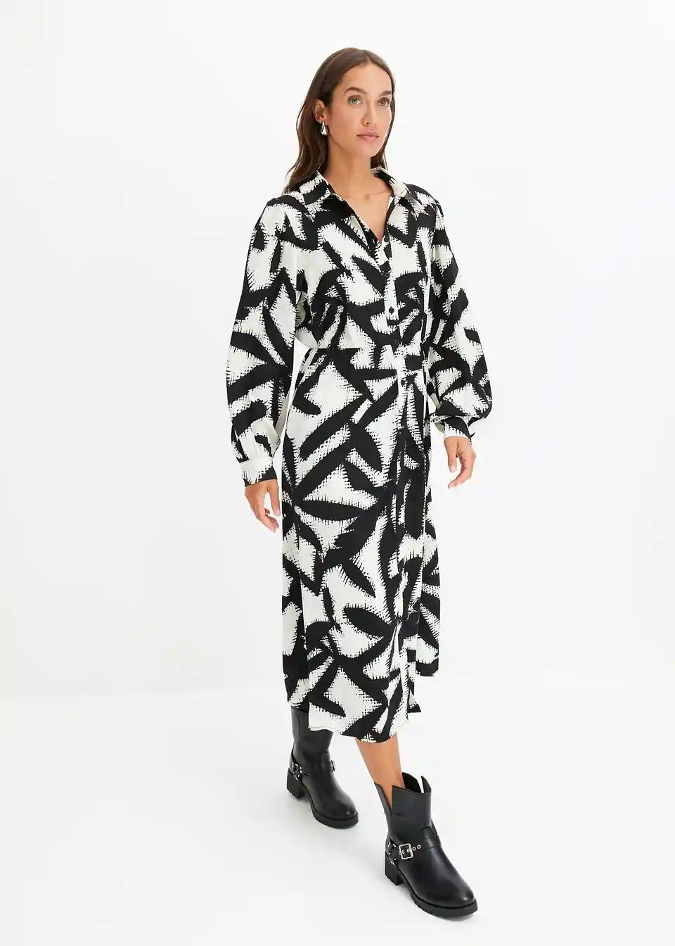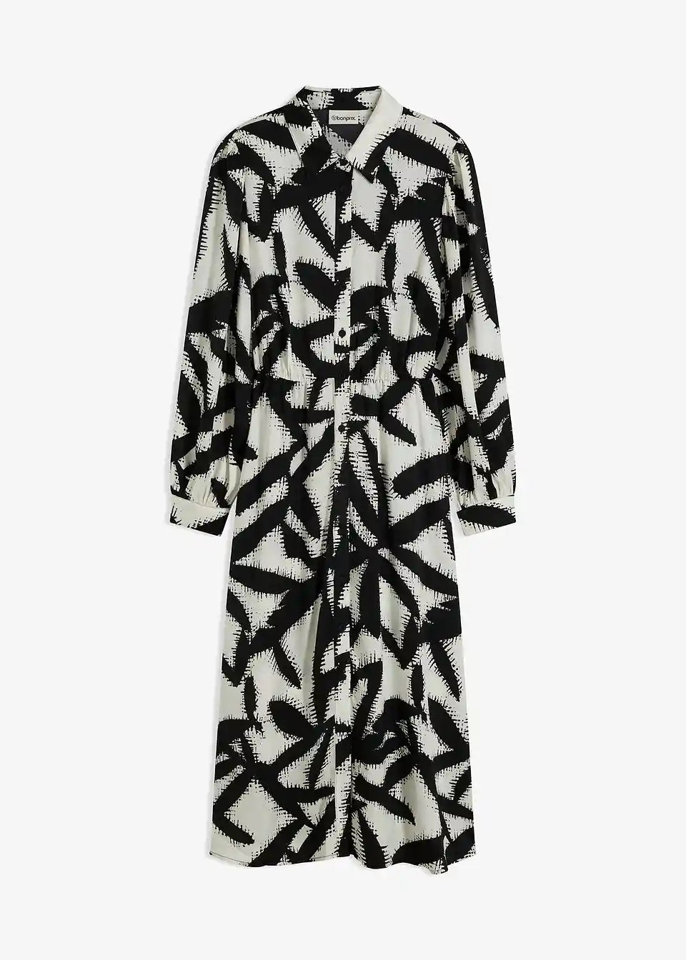 ženska satenasta midi obleka z grafičnim potiskom in sprednjim zapenjanjem na gumbe