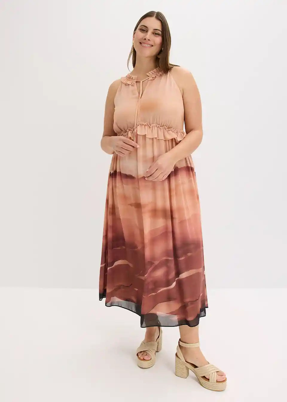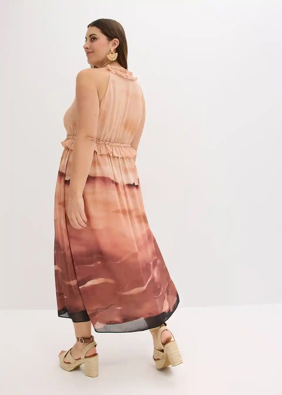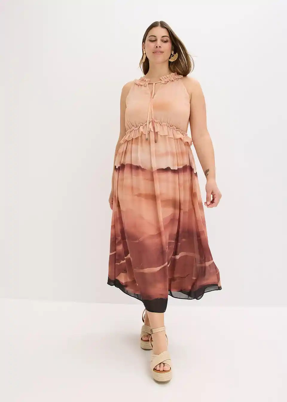 moderna tiskana šifonska obleka v midi dolžini z volančki na izrezu in v pasu