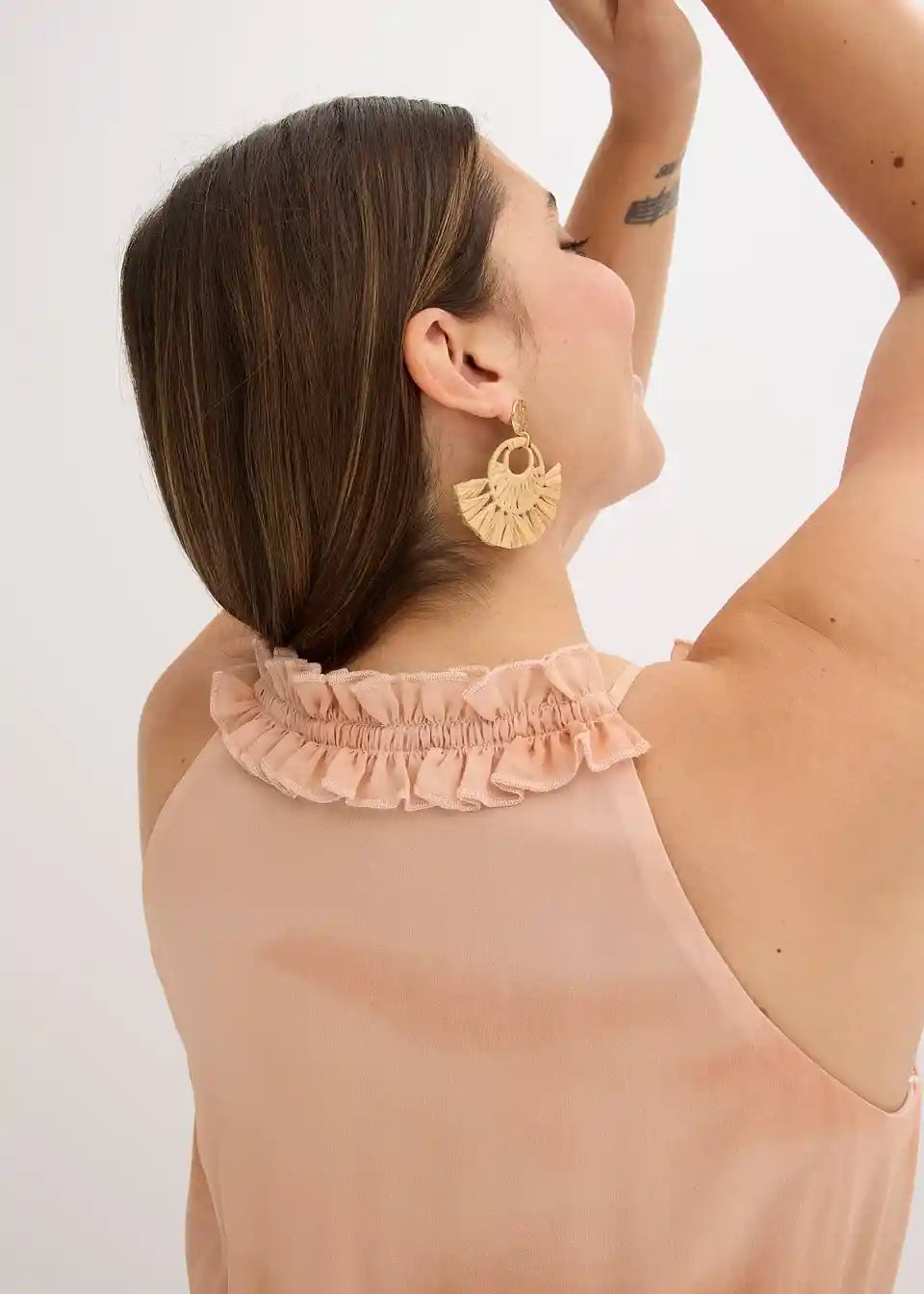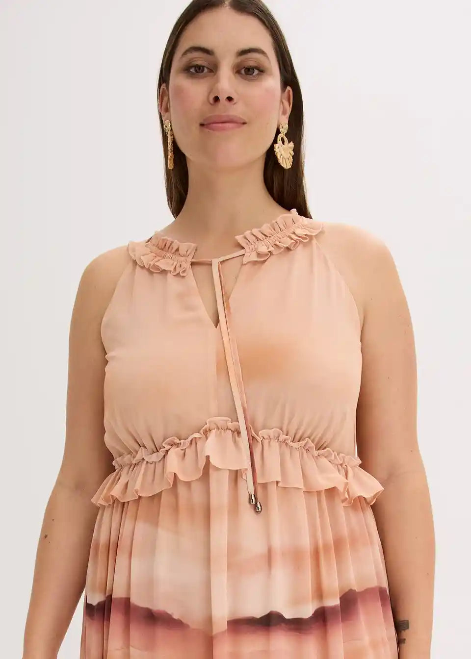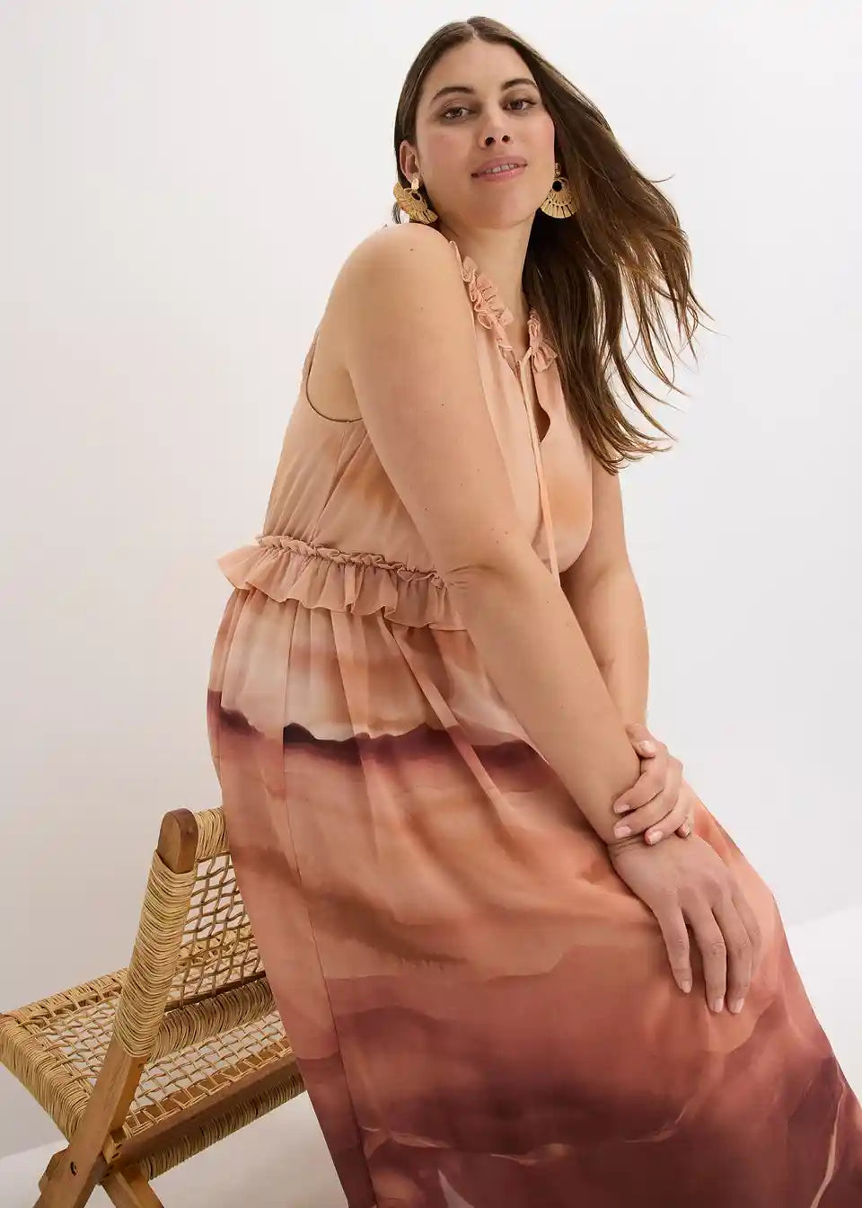 moderna tiskana šifonska obleka v midi dolžini z volančki na izrezu in v pasu