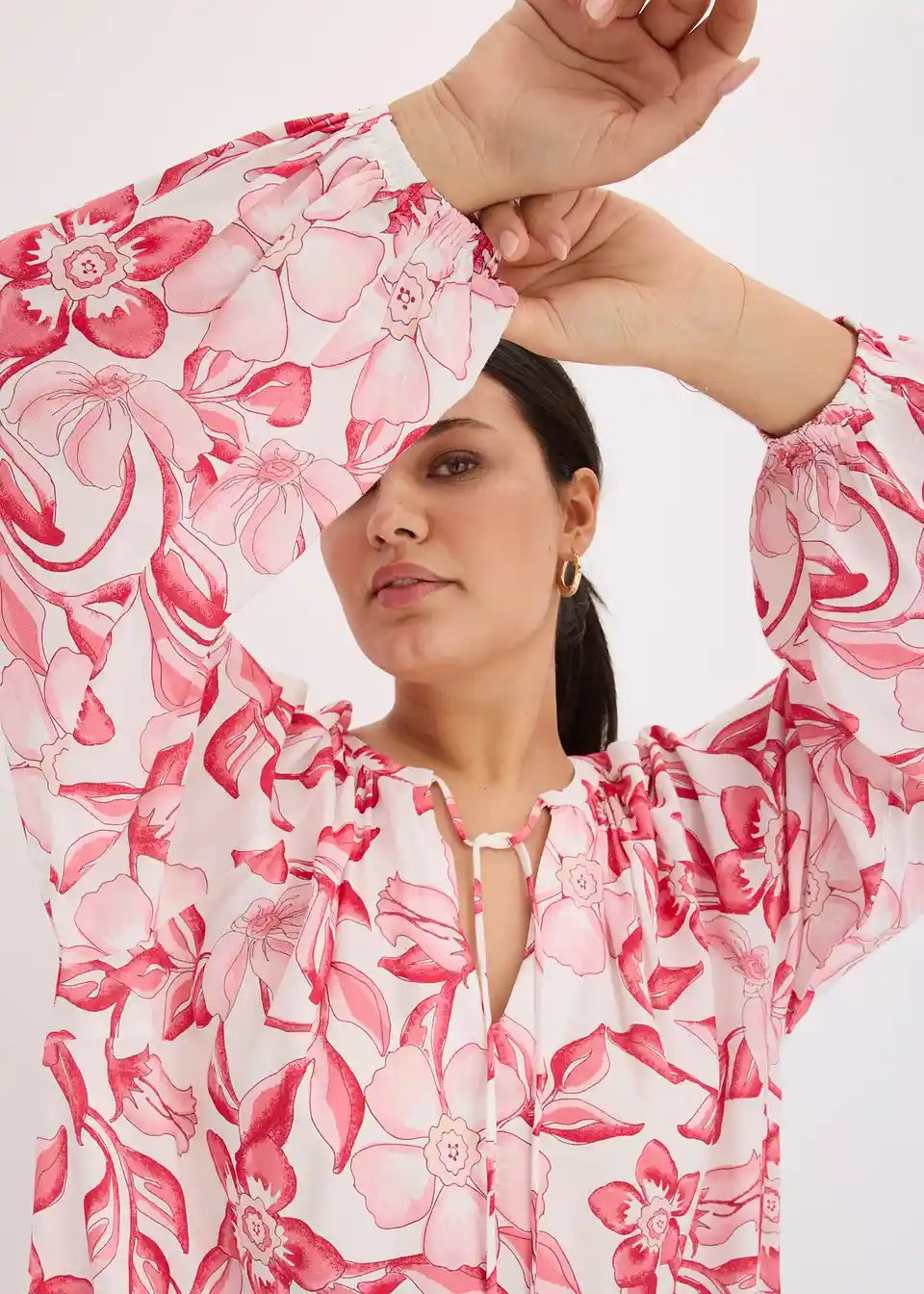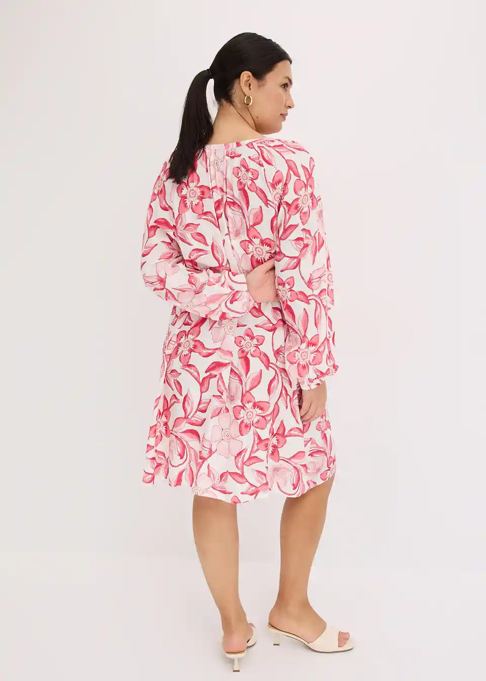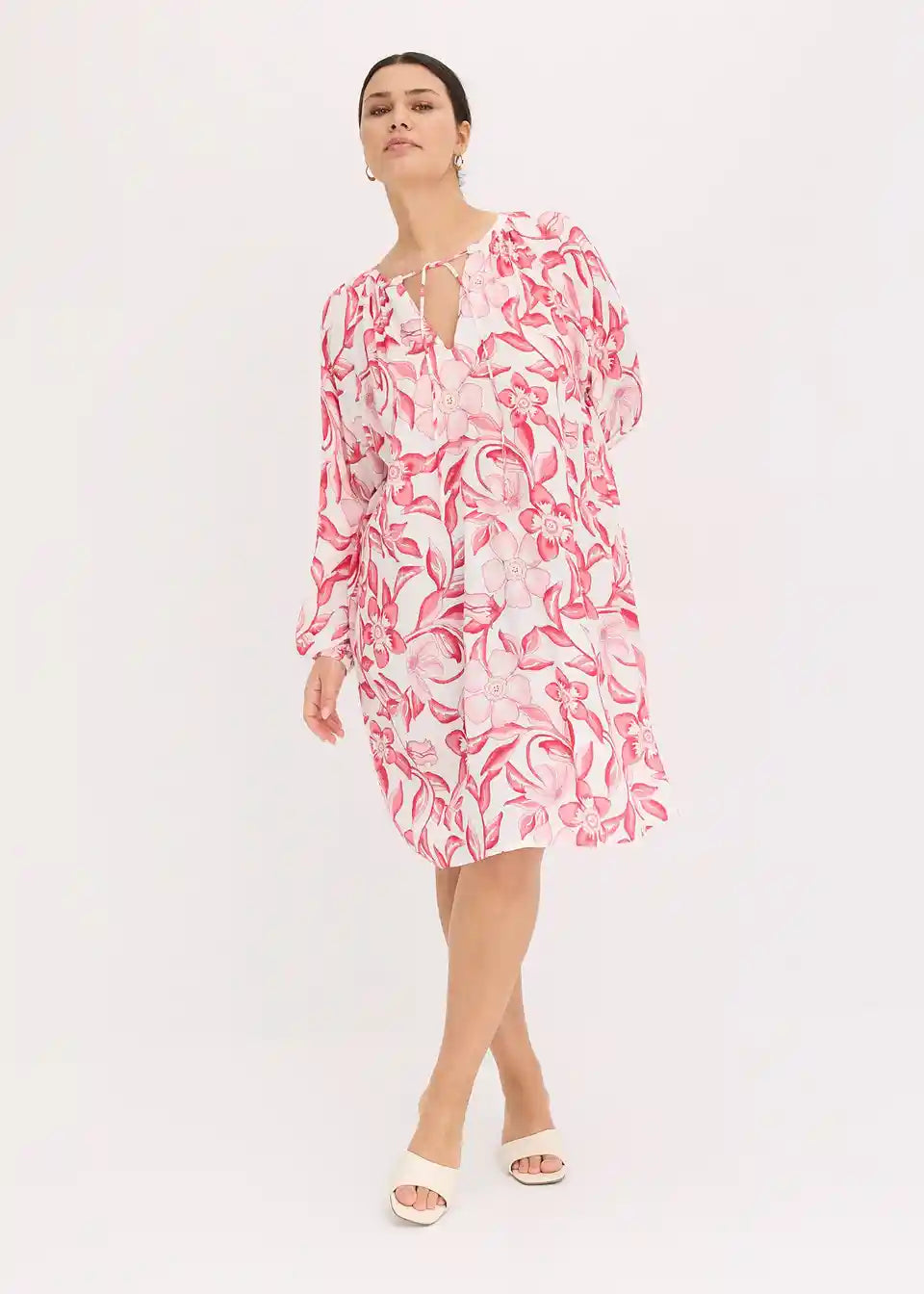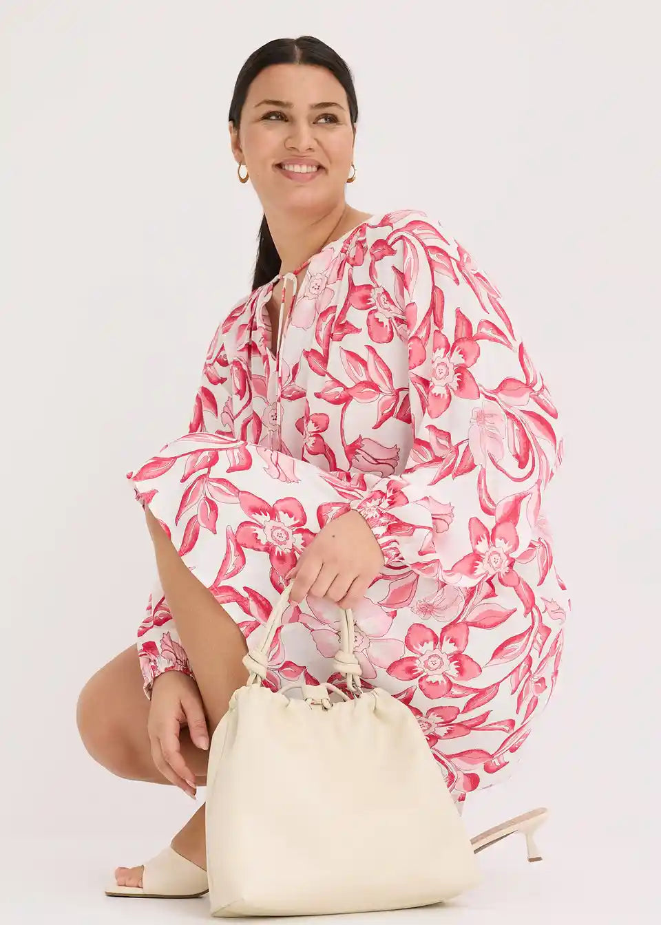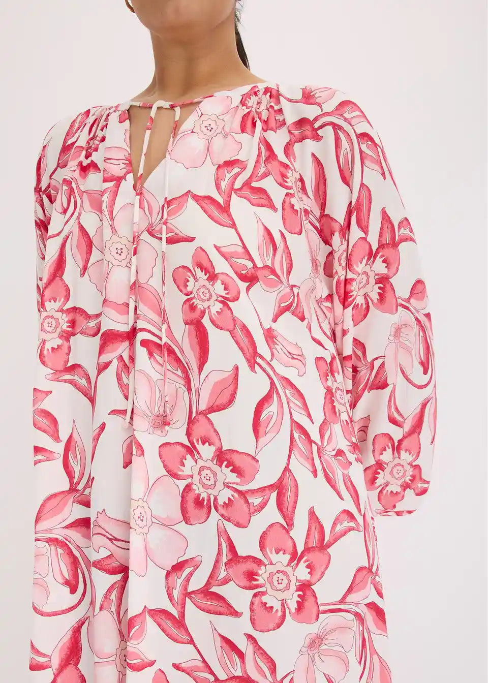 kratka tunika obleka iz padajoče viskoze s cvetličnim potiskom in zavezovalnim trakom na izrezu spredaj