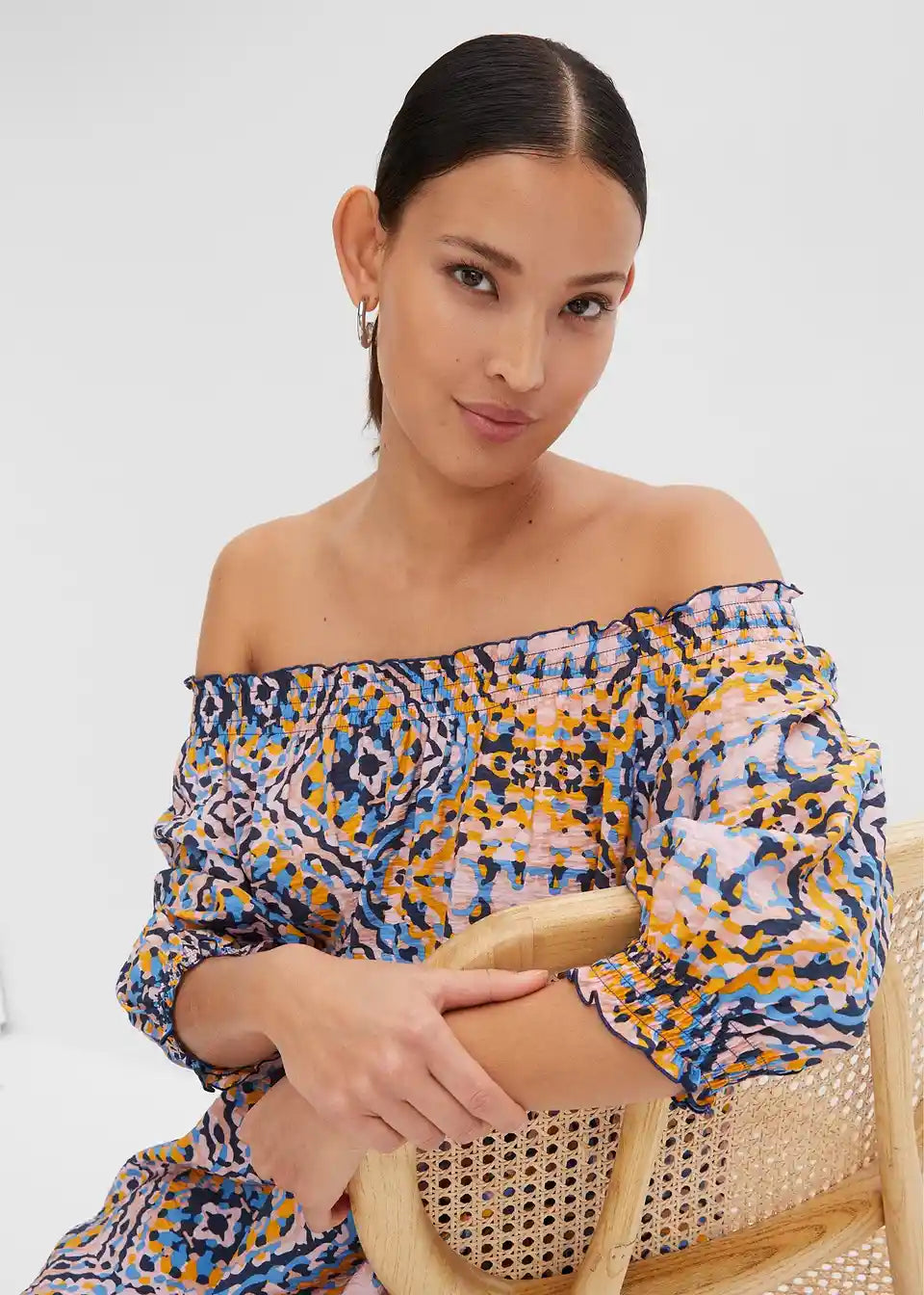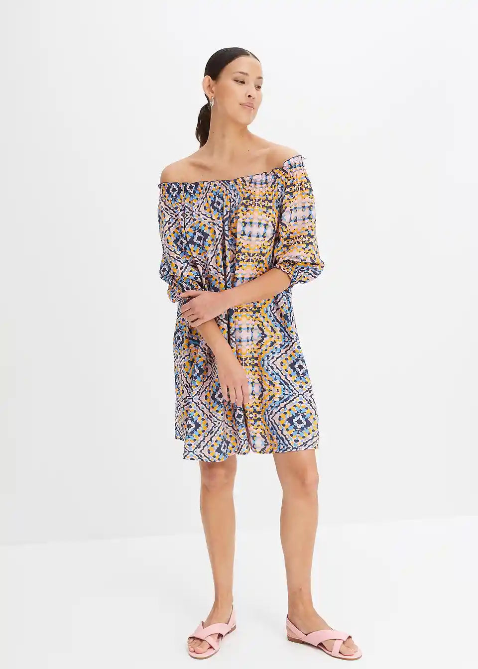 Natisnjena tkaninska obleka z Carmen izrezom