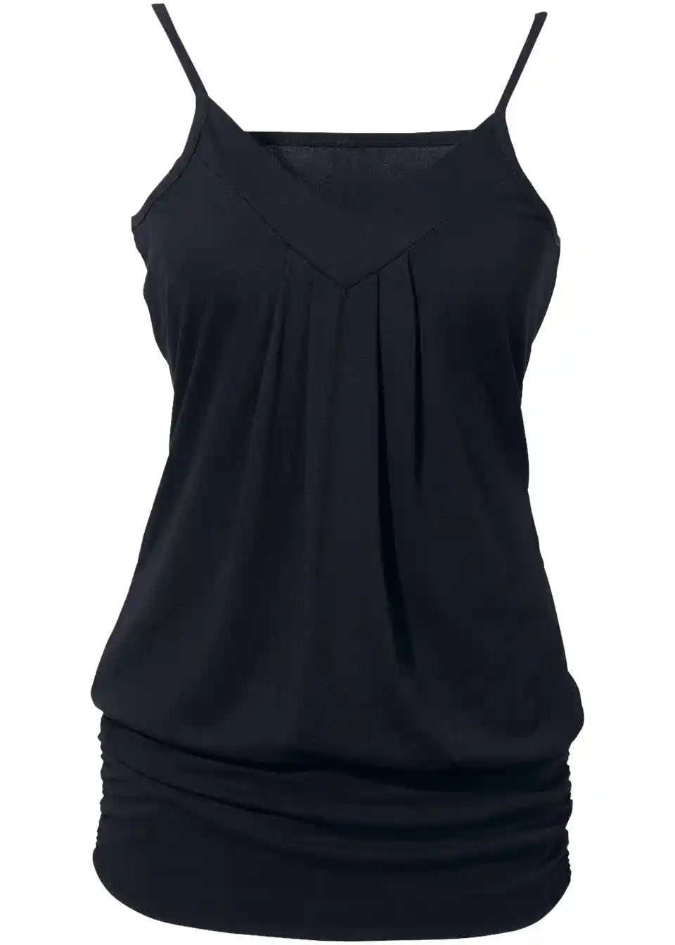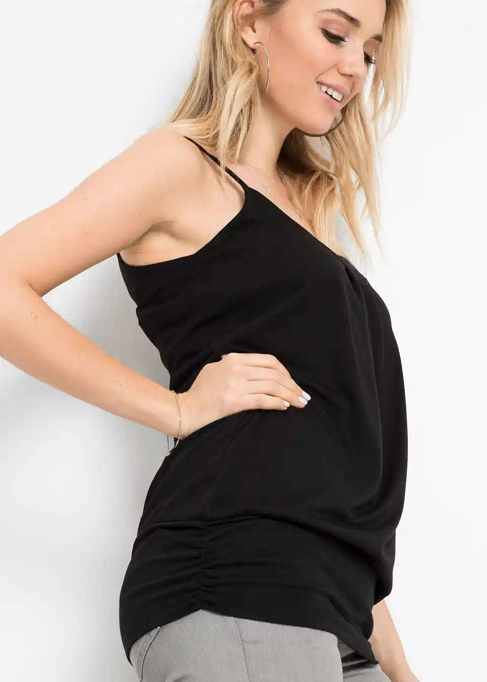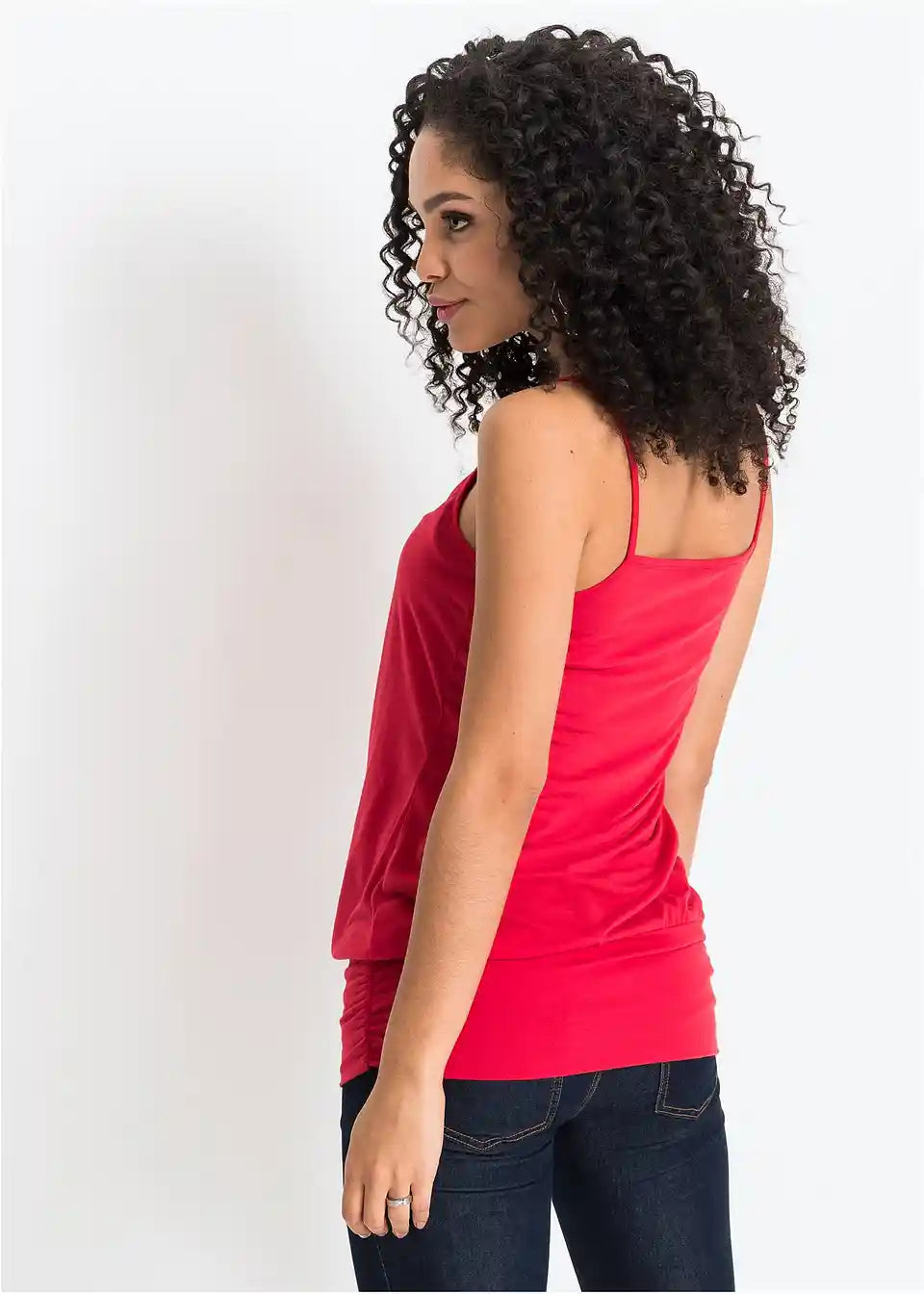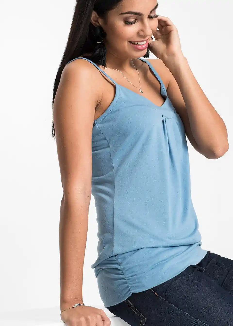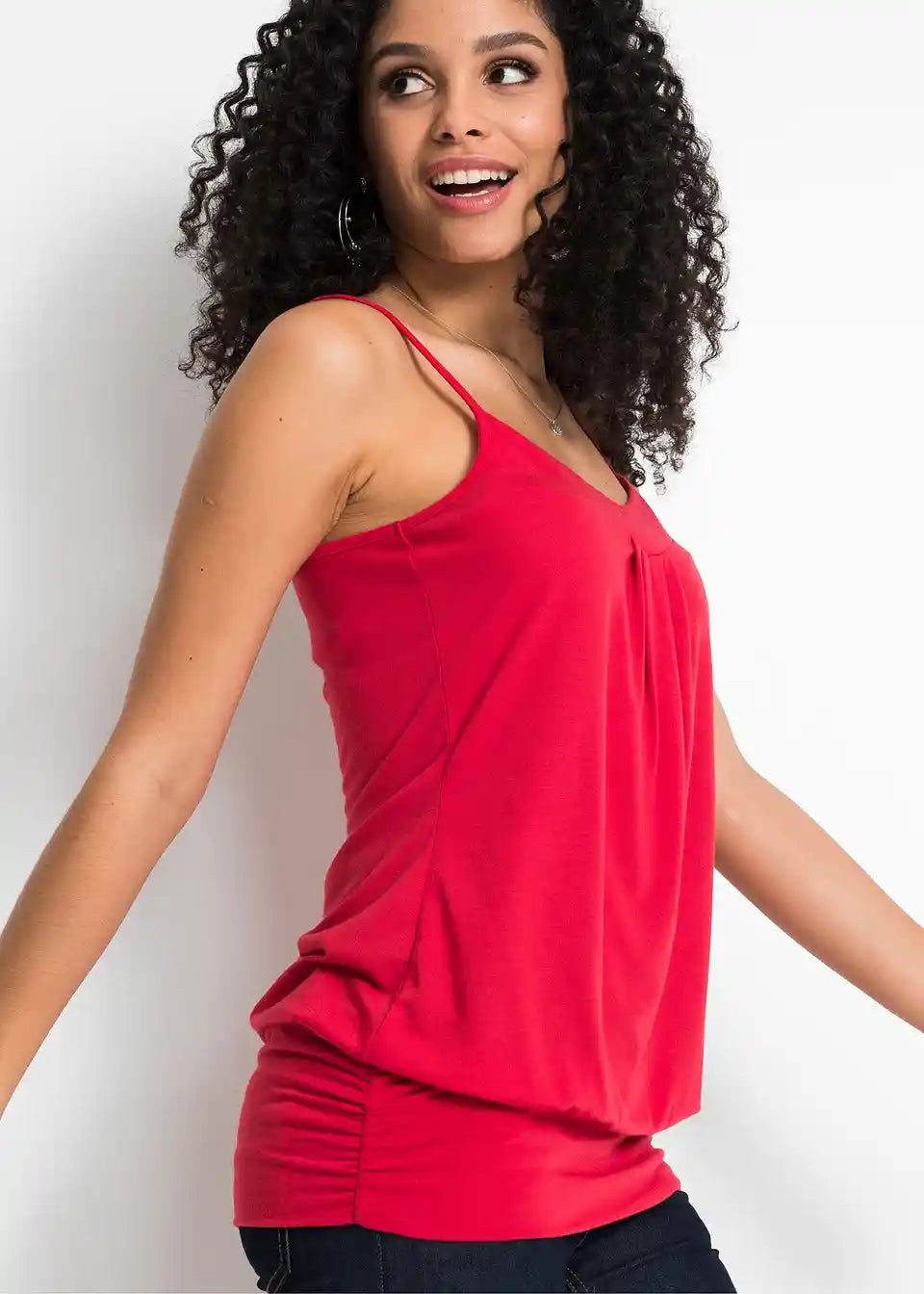 Poleti je modni top skupaj z jeans hlačami že popolna kombinacija. V hladnejših dneh navdušuje, ko ga nosite pod odprto, sproščeno bluzo ali pleteno jopico. Lep top iz kolekcije BODYFLIRT ima tanke naramnice. Na izrezu modno nabiranje pritegne vse poglede. Širok, elastičen rob poudarja ženstven šarm in odlično prikaže poseben padec mehkega materiala.