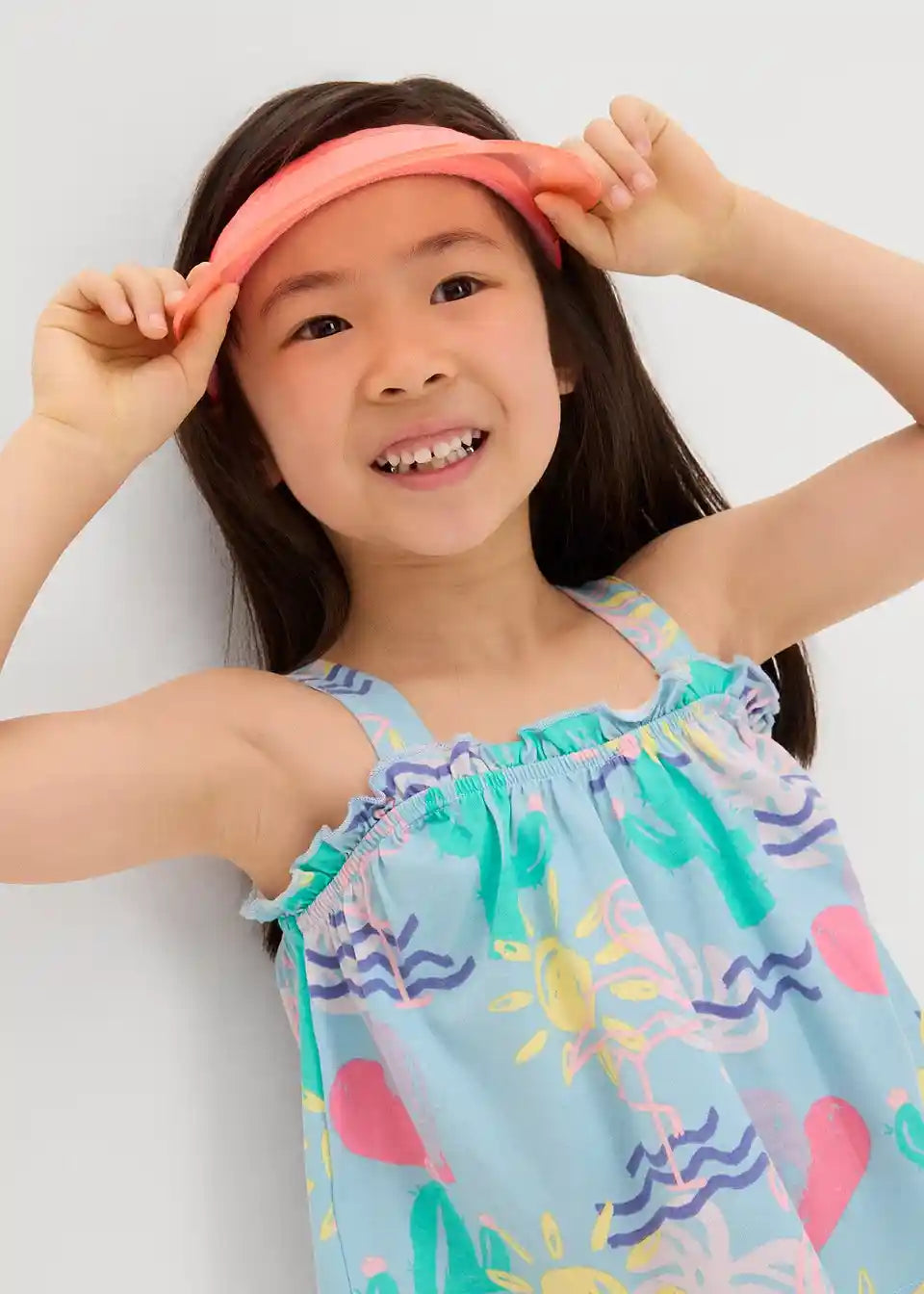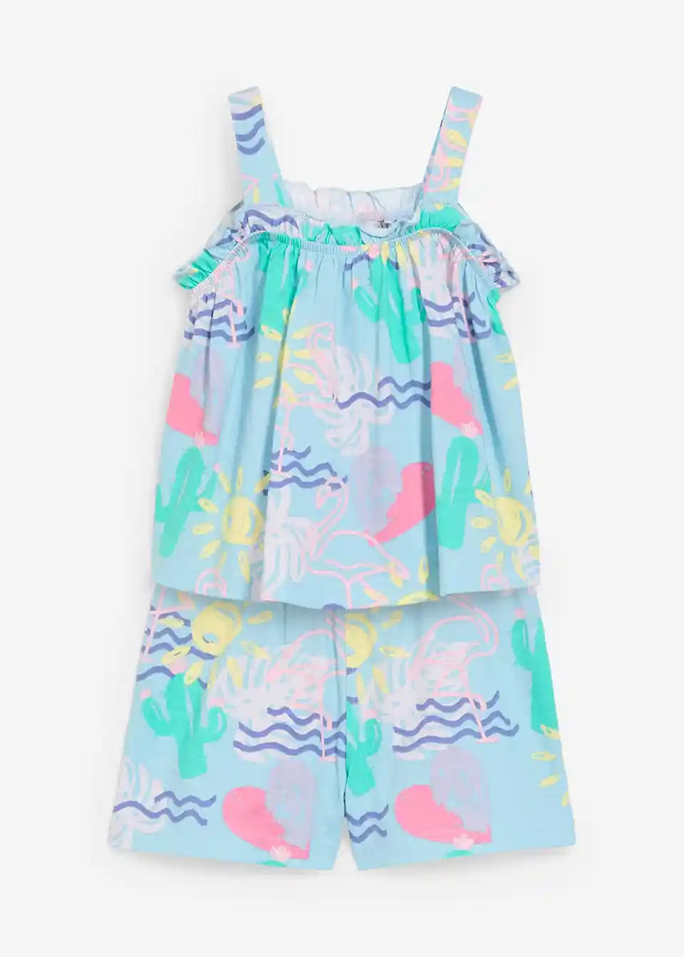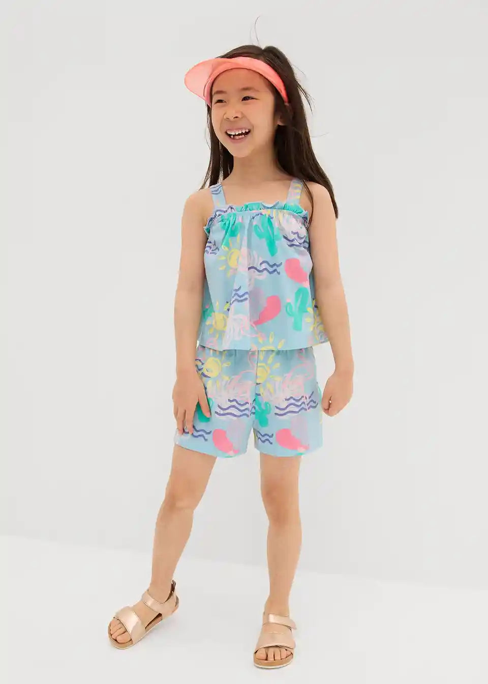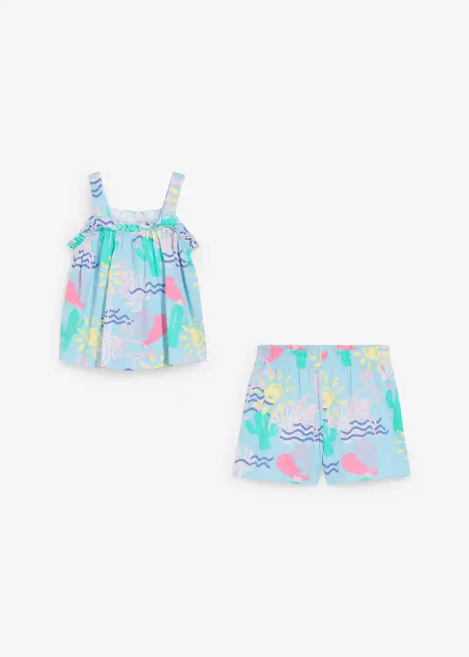 Praktičen komplet za deklice, sestavljen iz topa in kratkih hlač s prikupnim potiskom