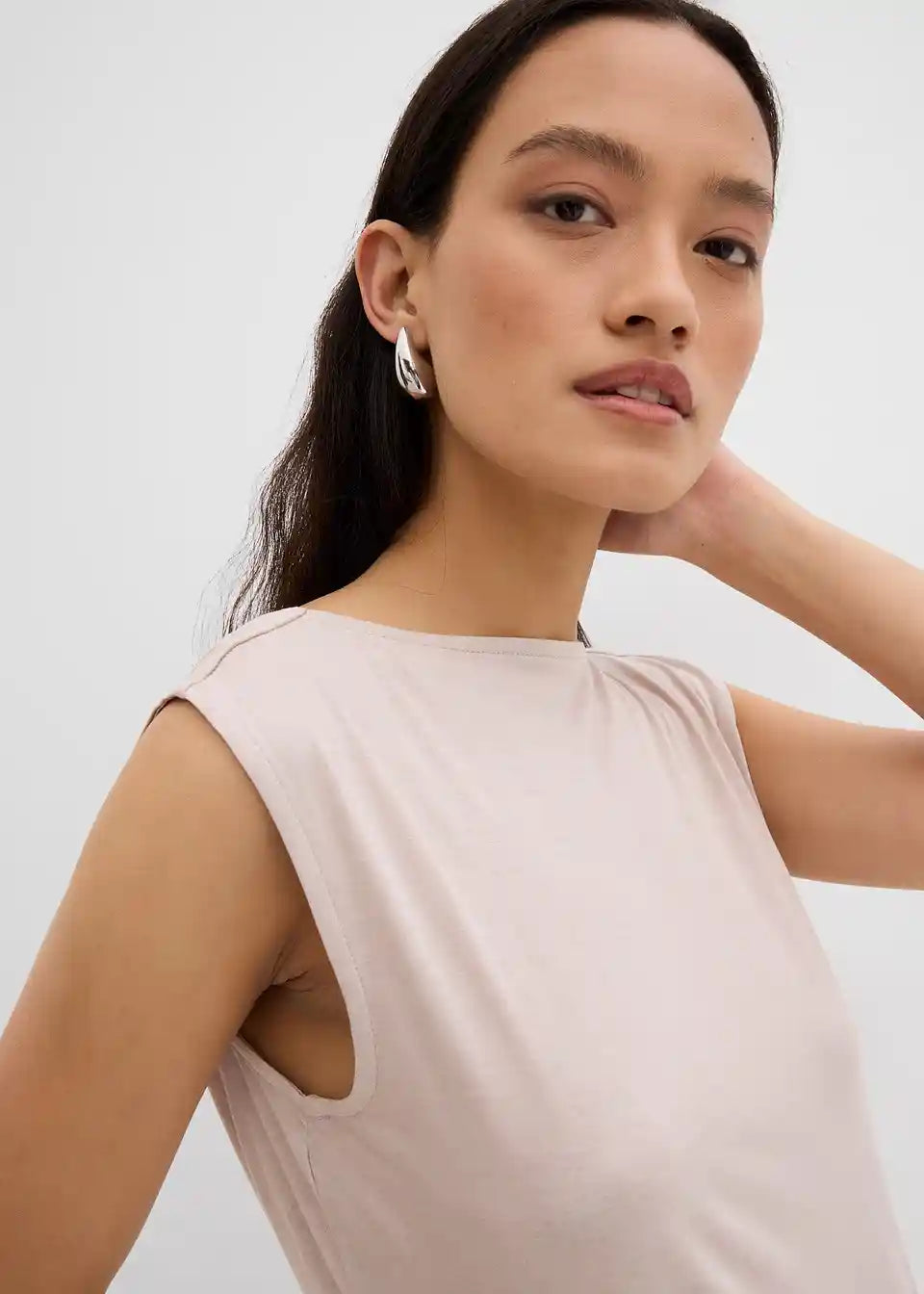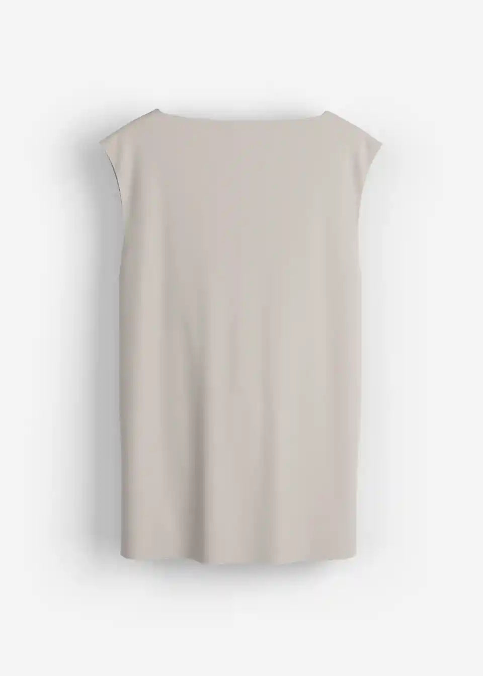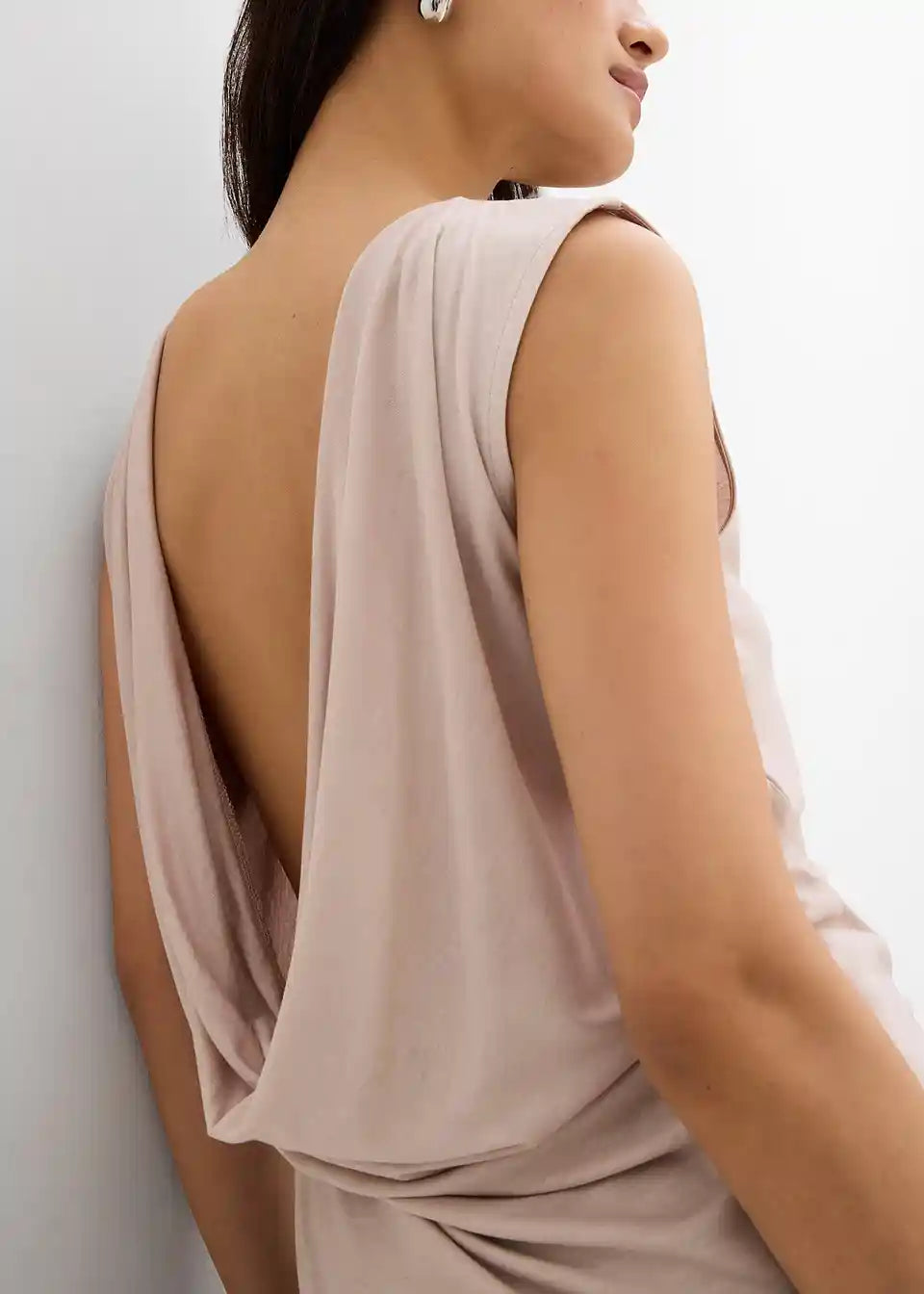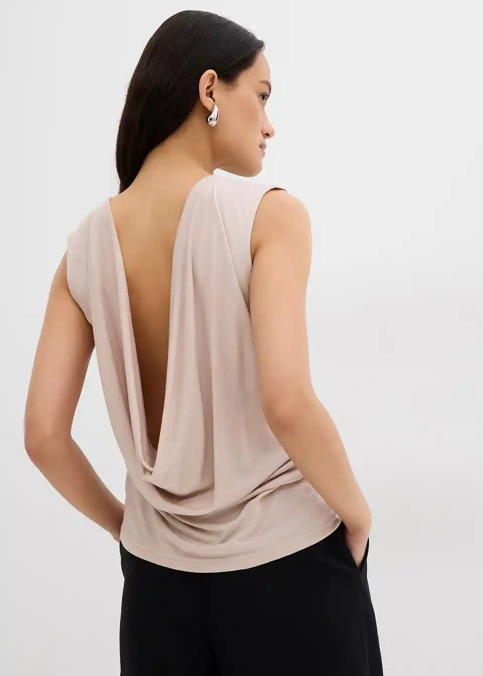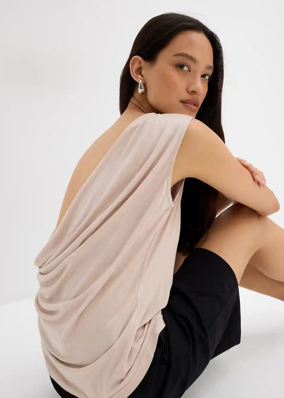 Oprijet top iz tekočega materiala z globokim vodoravnim izrezom na hrbtu