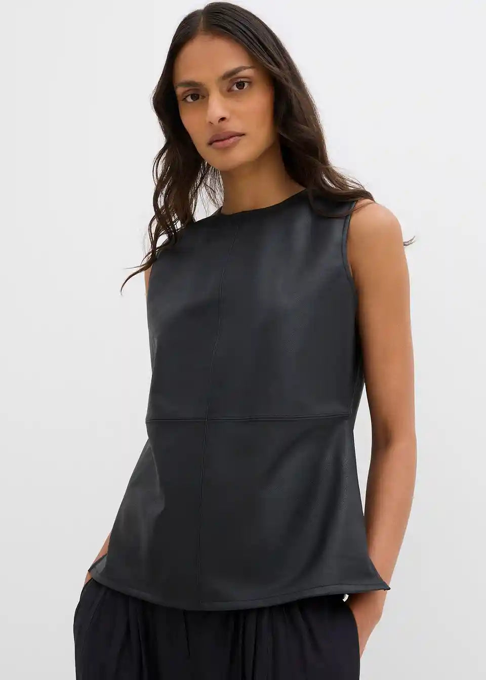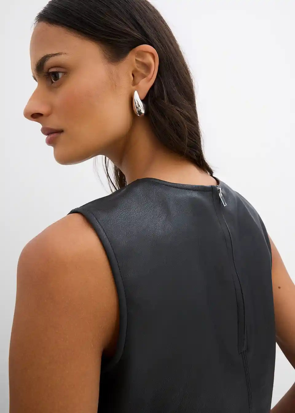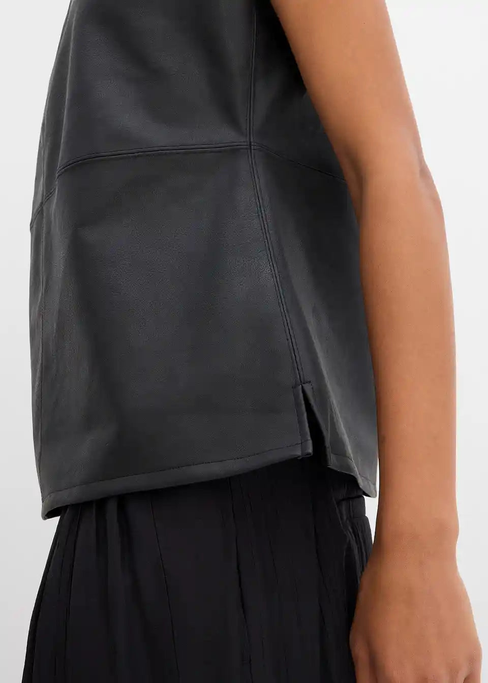 Top iz umetnega usnja brez rokavov z barvno usklajenimi delitvenimi šivi, stranskimi razporki na robu ter z izpostavljeno zadrgo na hrbtni strani