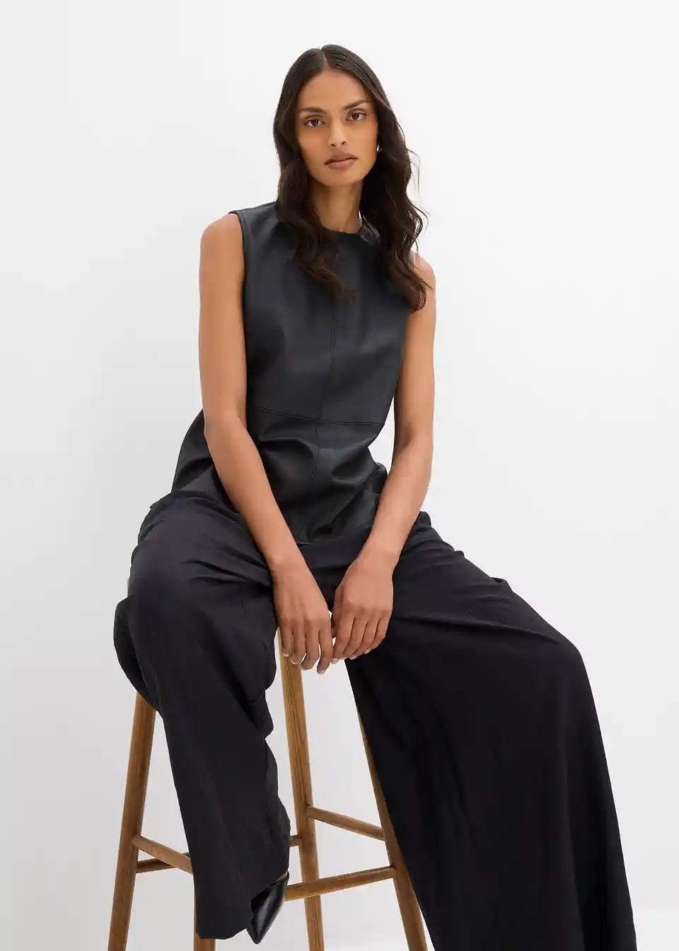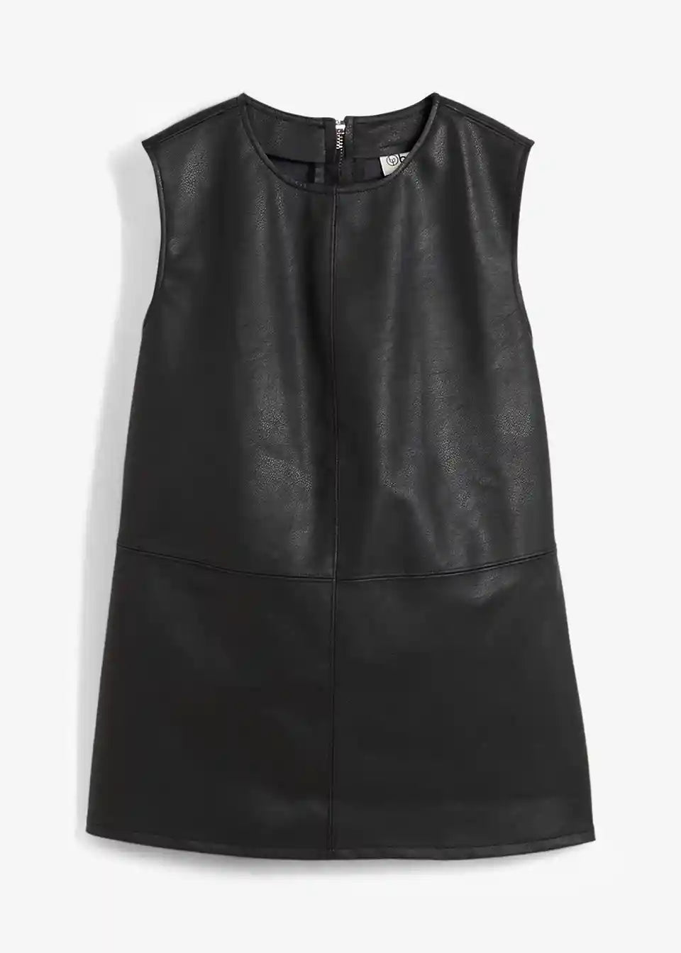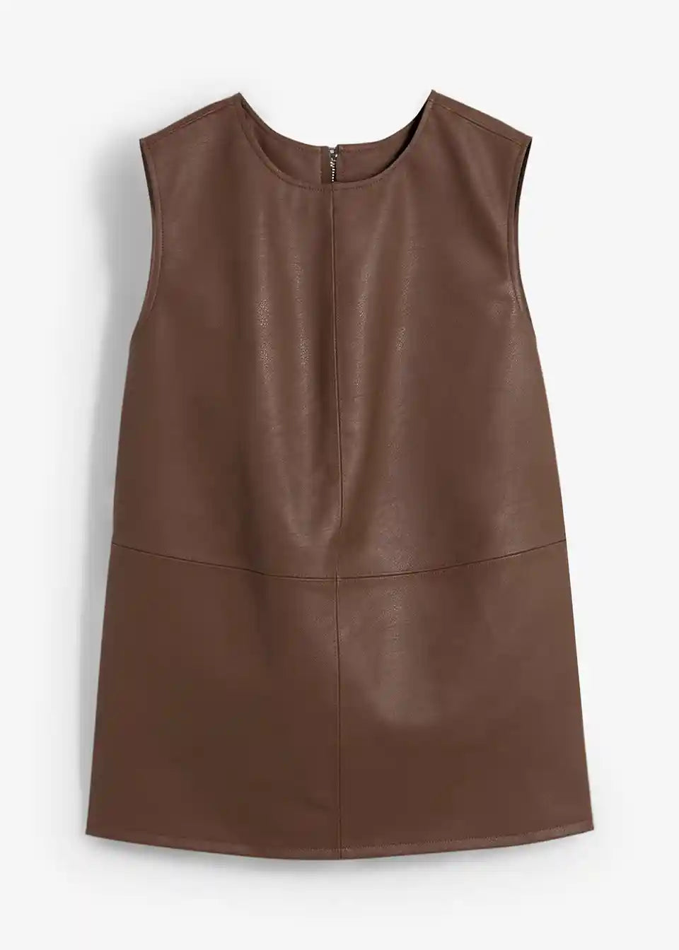 Top iz umetnega usnja brez rokavov z barvno usklajenimi delitvenimi šivi, stranskimi razporki na robu ter z izpostavljeno zadrgo na hrbtni strani