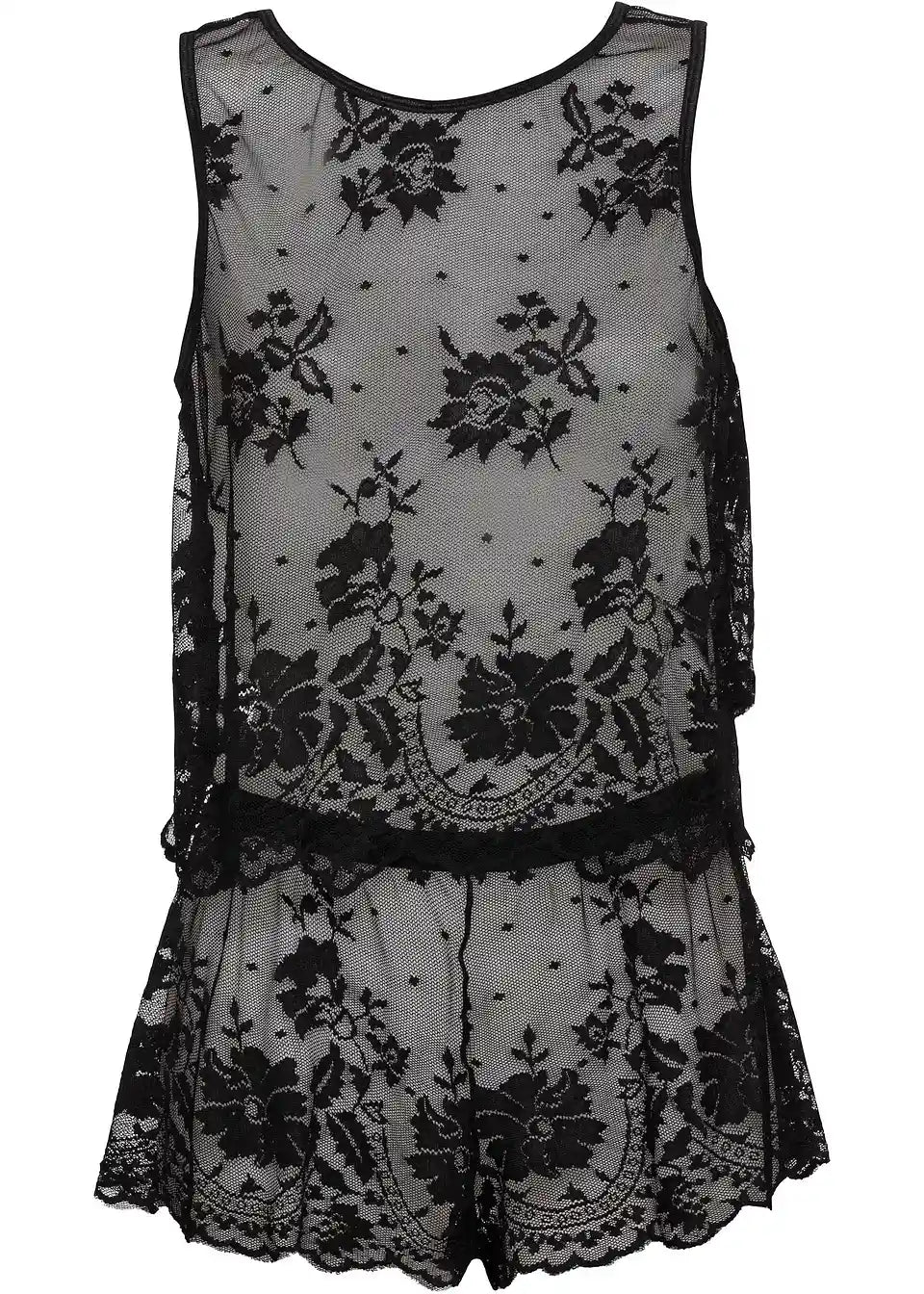 Kombinacija čiste elegance in zapeljivosti! 2-delni komplet, sestavljen iz vrhnjega dela (Top) in kratkih hlačk (Shorty), z nežno cvetlično čipko poudari vaše obline in jih z svojo prosojnostjo popolno izpostavi. Posebna značilnost je globok izrez na hrbtu, s katerim boste očarale svojega partnerja. Eleganten kroj in udobno prileganje naredita ta komplet popolnega spremljevalca za vsako priložnost.
