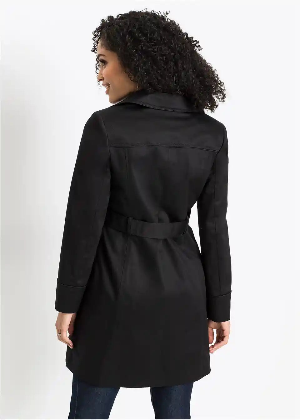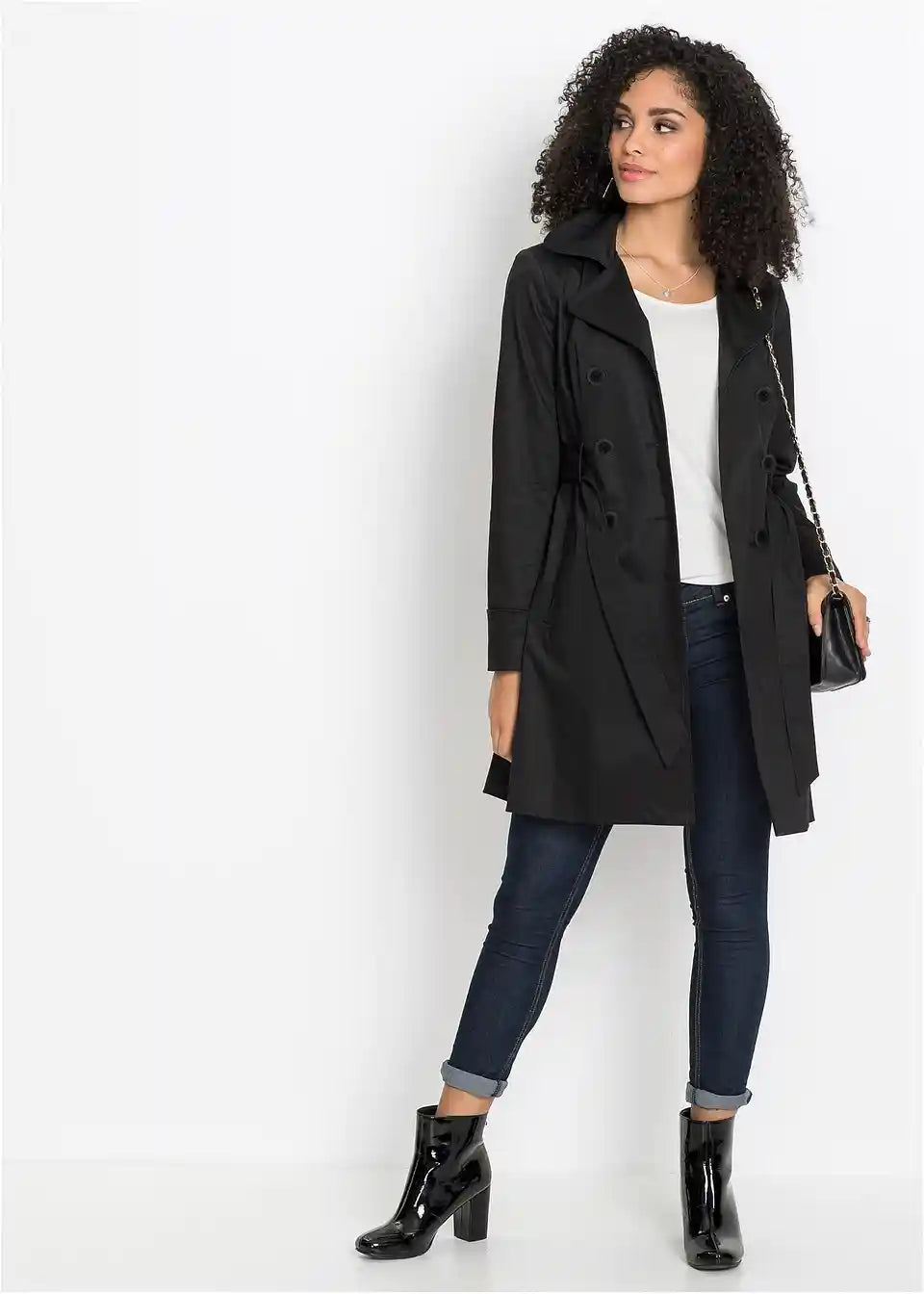 Barvno kontrasten trenchcoat znamke BODYFLIRT s pasom za vezanje in dvorednim zapenjanjem. Dolžina v vel. 38 približno 98 cm.