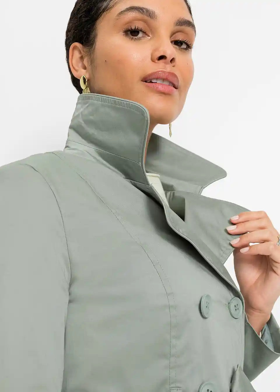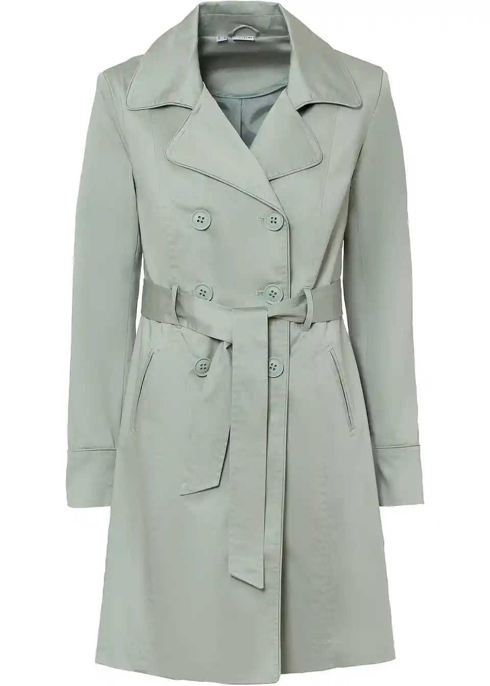 Očarljiv trenchcoat z dvorednim zapenjanjem in pasom za vezanje.