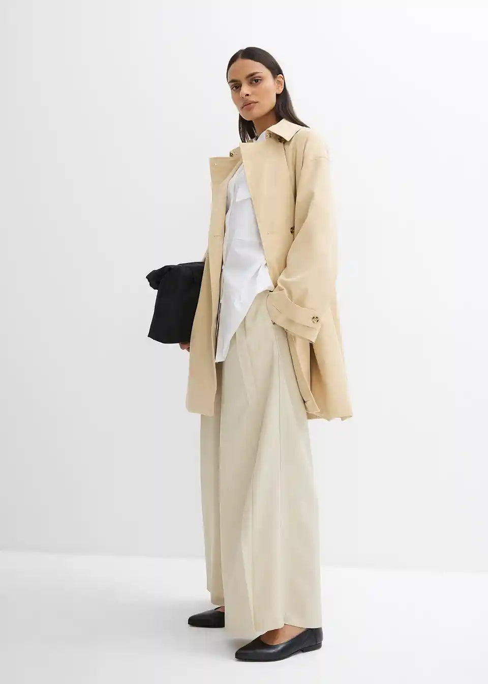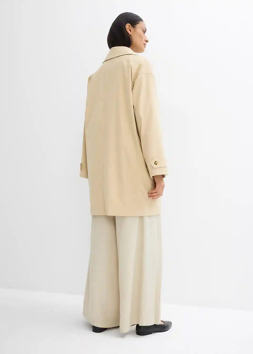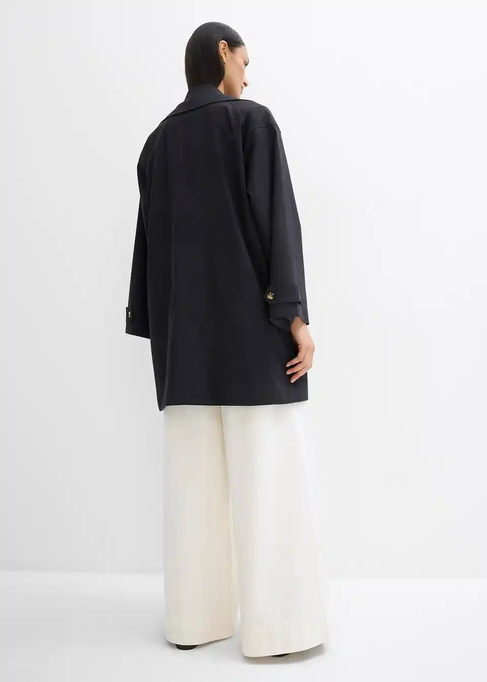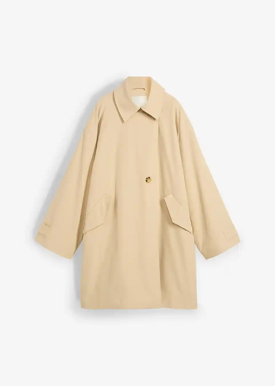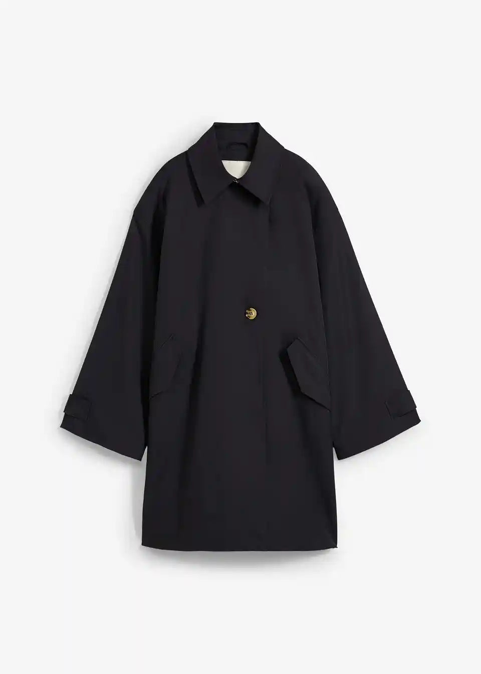 Kratek enoredni trenčkot z raglanskimi rokavi in skrito zapenjalno letvijo ter zapenjalnimi trakovi na koncih rokavov.