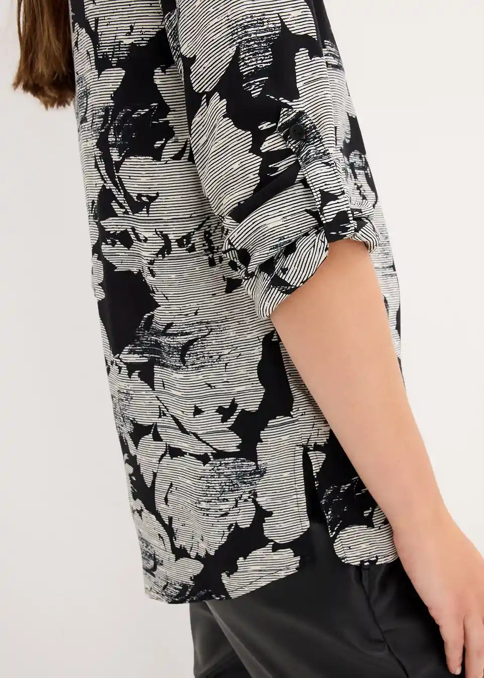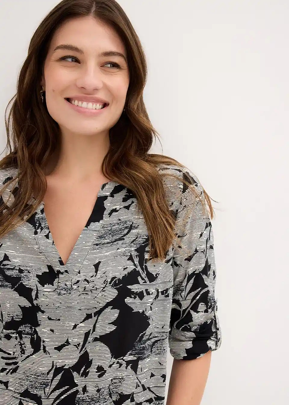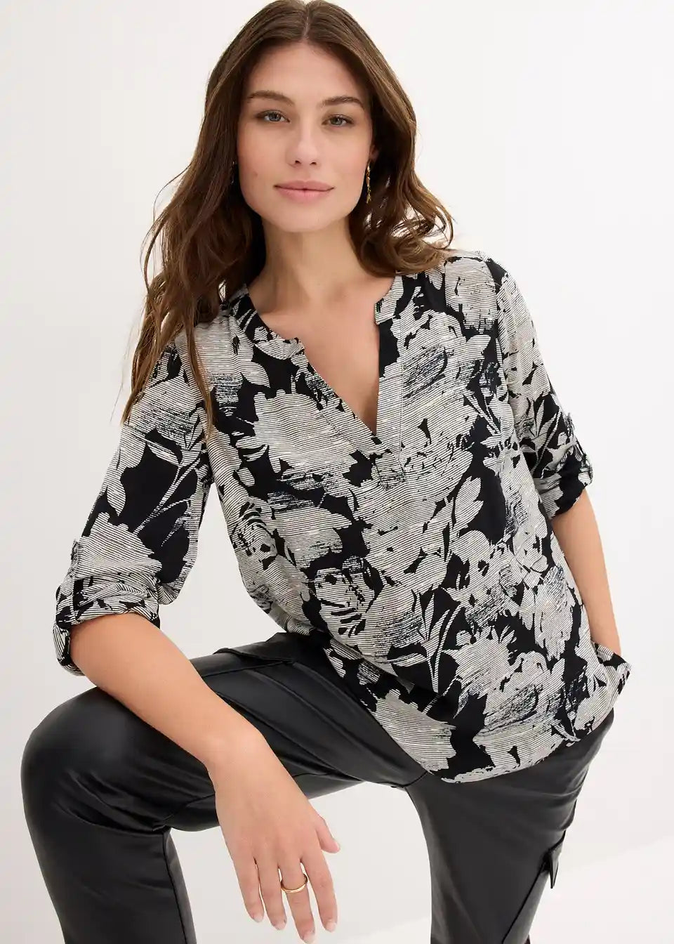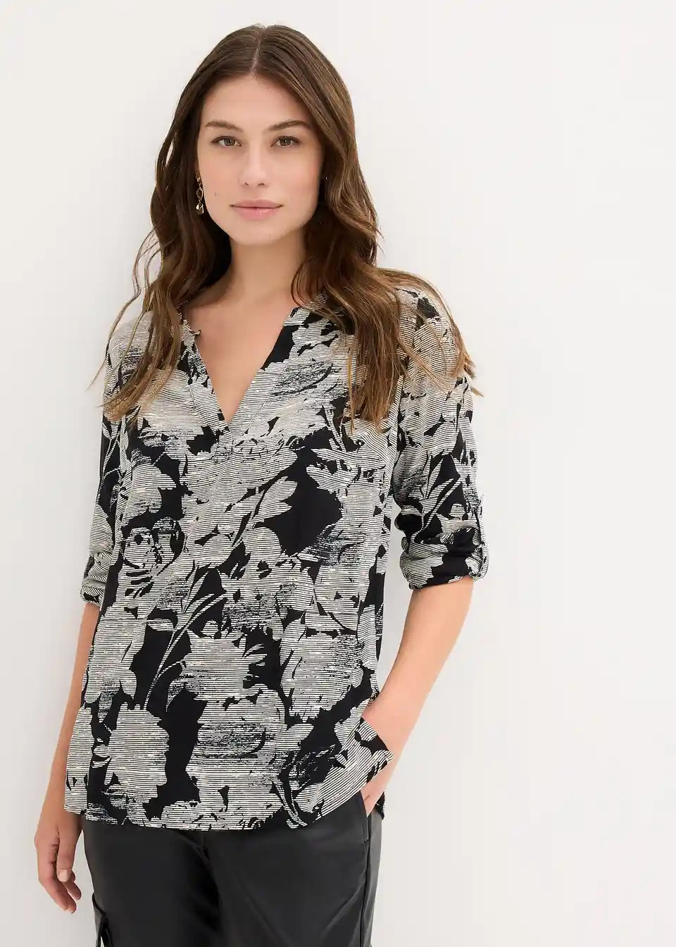 Jasna silhueta daje tej bluzo-tuniki znamke bpc selection stilno noto. V ospredju je optično poudarjen rob, ki se odpira v V-izrez. Model je zadaj nekoliko daljši kot spredaj. Gumb z zanko omogoča fiksiranje zavihanih rokavov. Bluza-tunika izgleda privlačno tako v kombinaciji z raztegljivimi hlačami kot z elegantnim krilom.