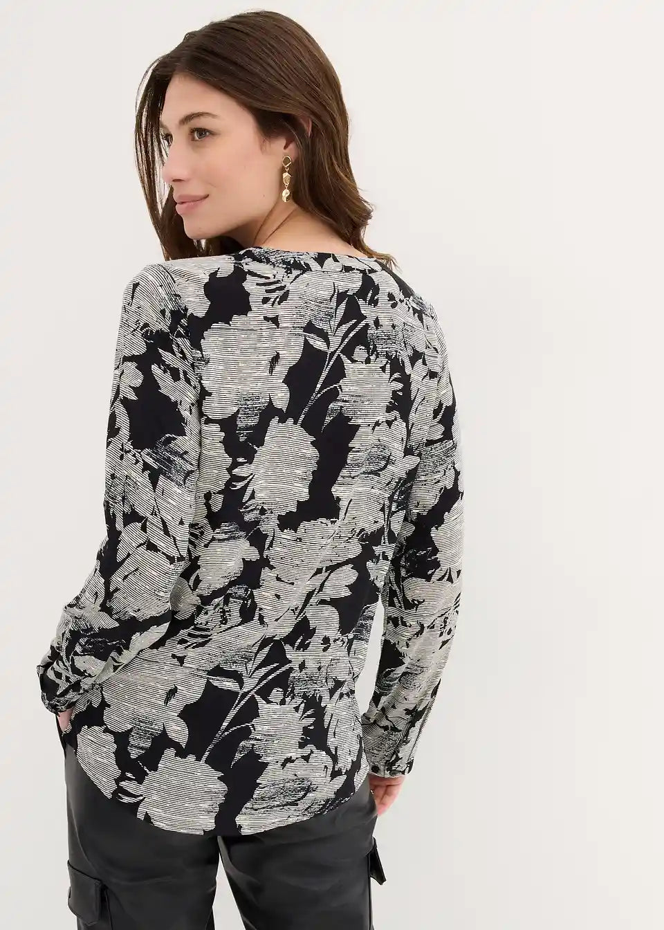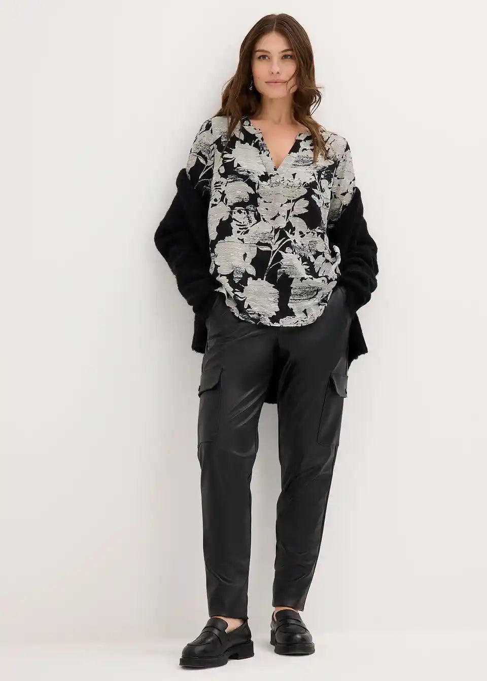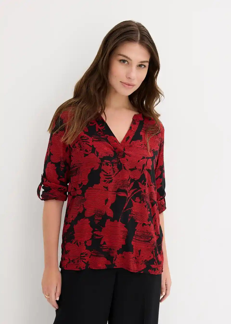 Jasna silhueta daje tej bluzo-tuniki znamke bpc selection stilno noto. V ospredju je optično poudarjen rob, ki se odpira v V-izrez. Model je zadaj nekoliko daljši kot spredaj. Gumb z zanko omogoča fiksiranje zavihanih rokavov. Bluza-tunika izgleda privlačno tako v kombinaciji z raztegljivimi hlačami kot z elegantnim krilom.