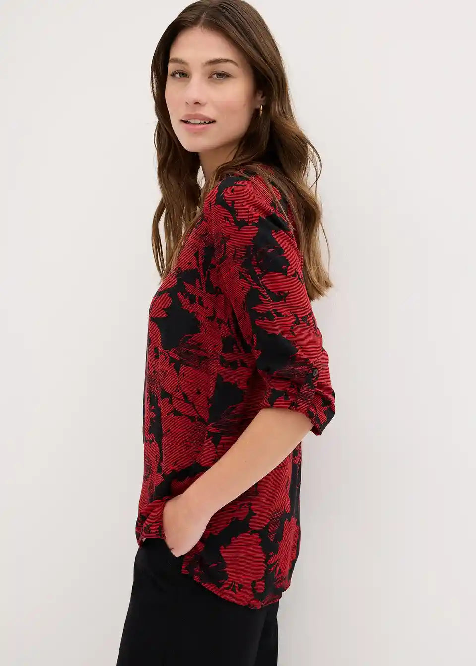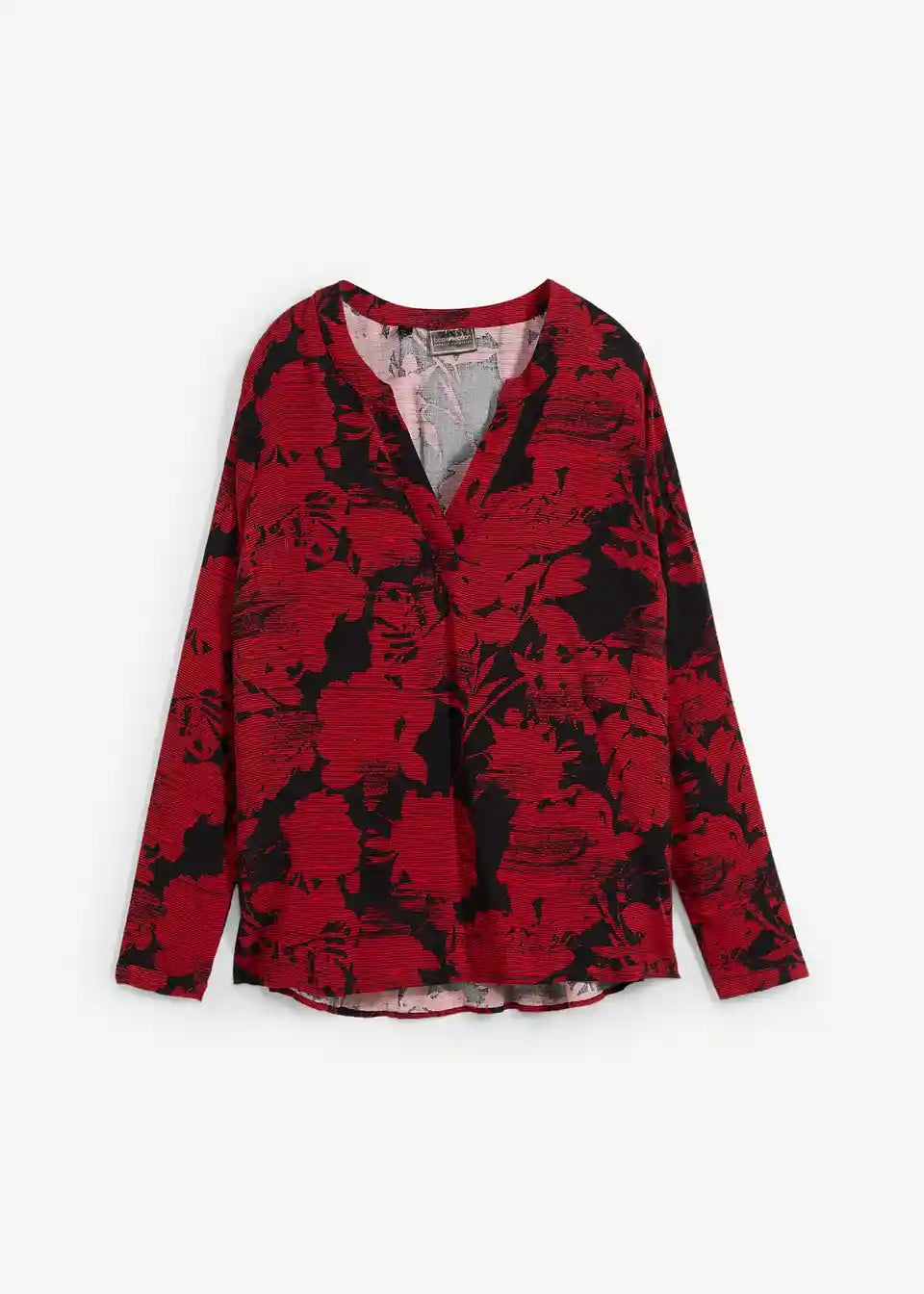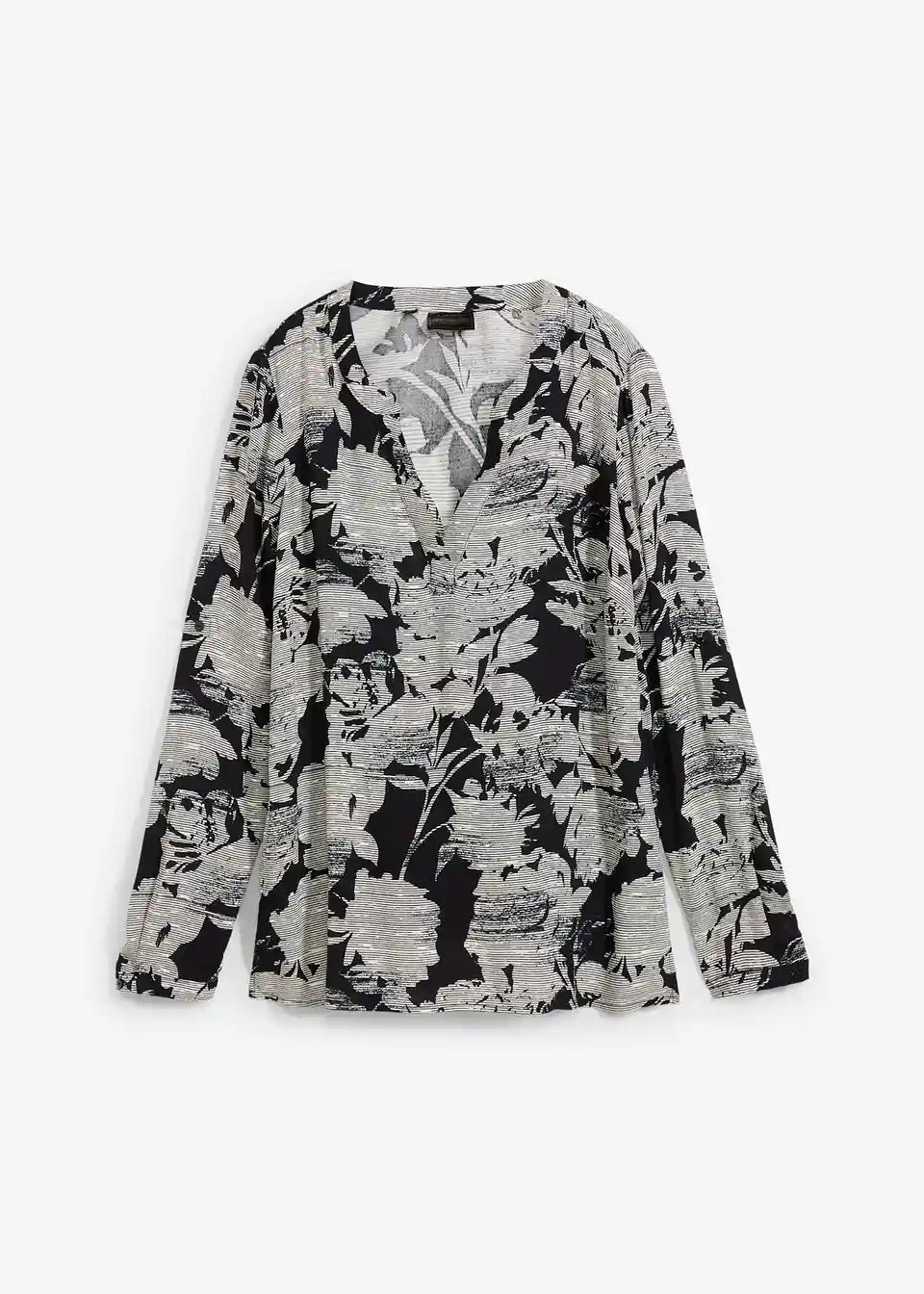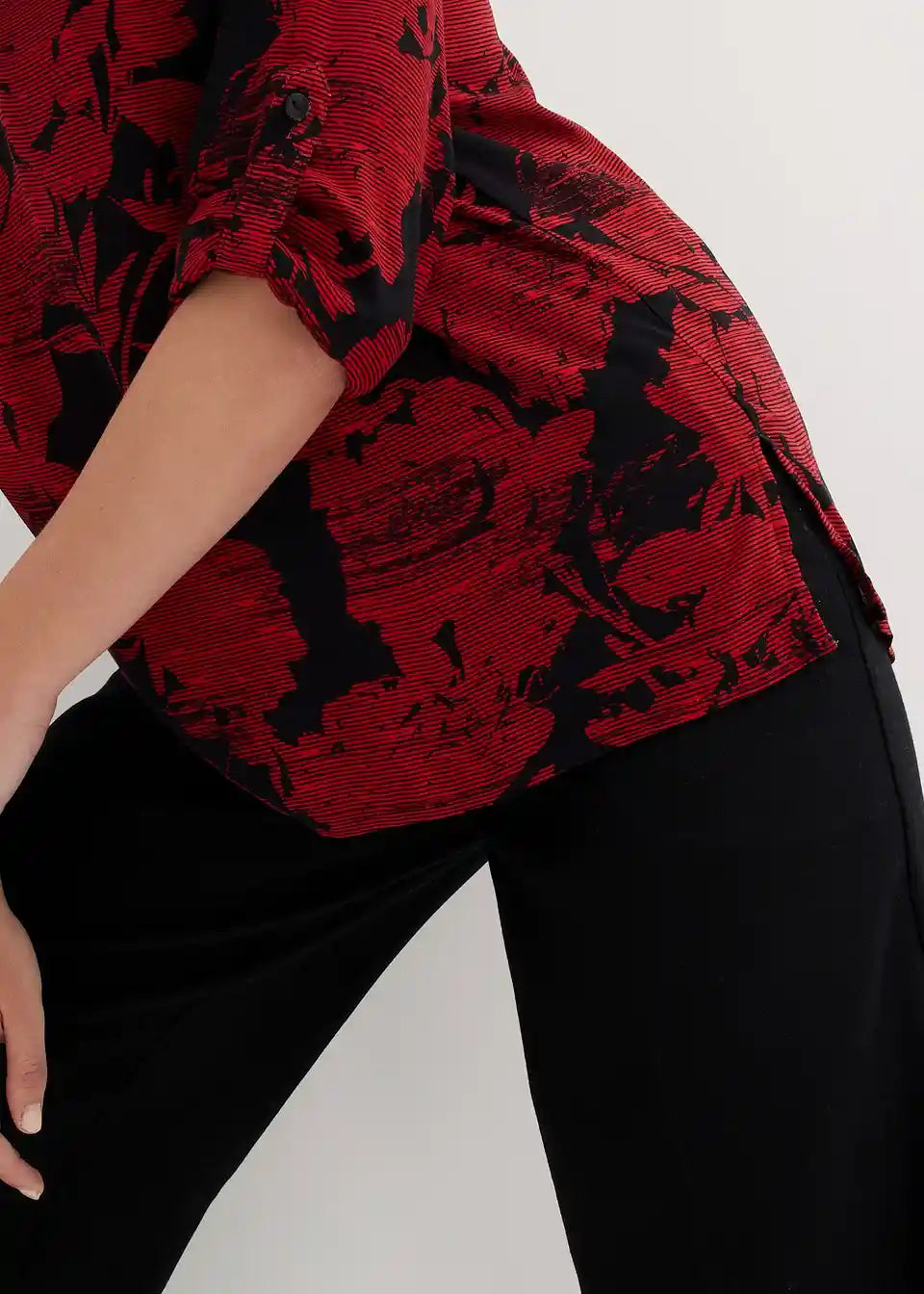 Jasna silhueta daje tej bluzo-tuniki znamke bpc selection stilno noto. V ospredju je optično poudarjen rob, ki se odpira v V-izrez. Model je zadaj nekoliko daljši kot spredaj. Gumb z zanko omogoča fiksiranje zavihanih rokavov. Bluza-tunika izgleda privlačno tako v kombinaciji z raztegljivimi hlačami kot z elegantnim krilom.