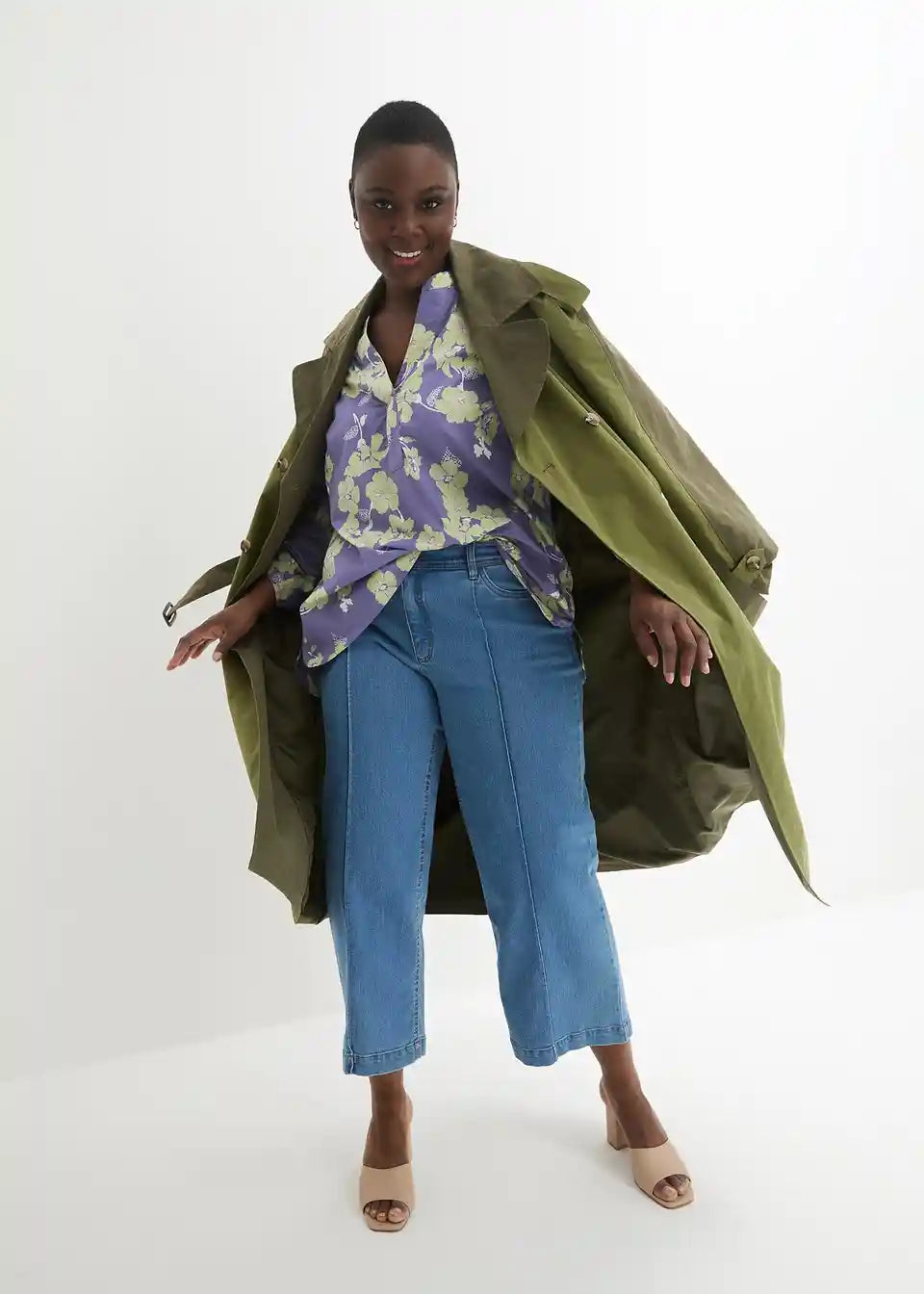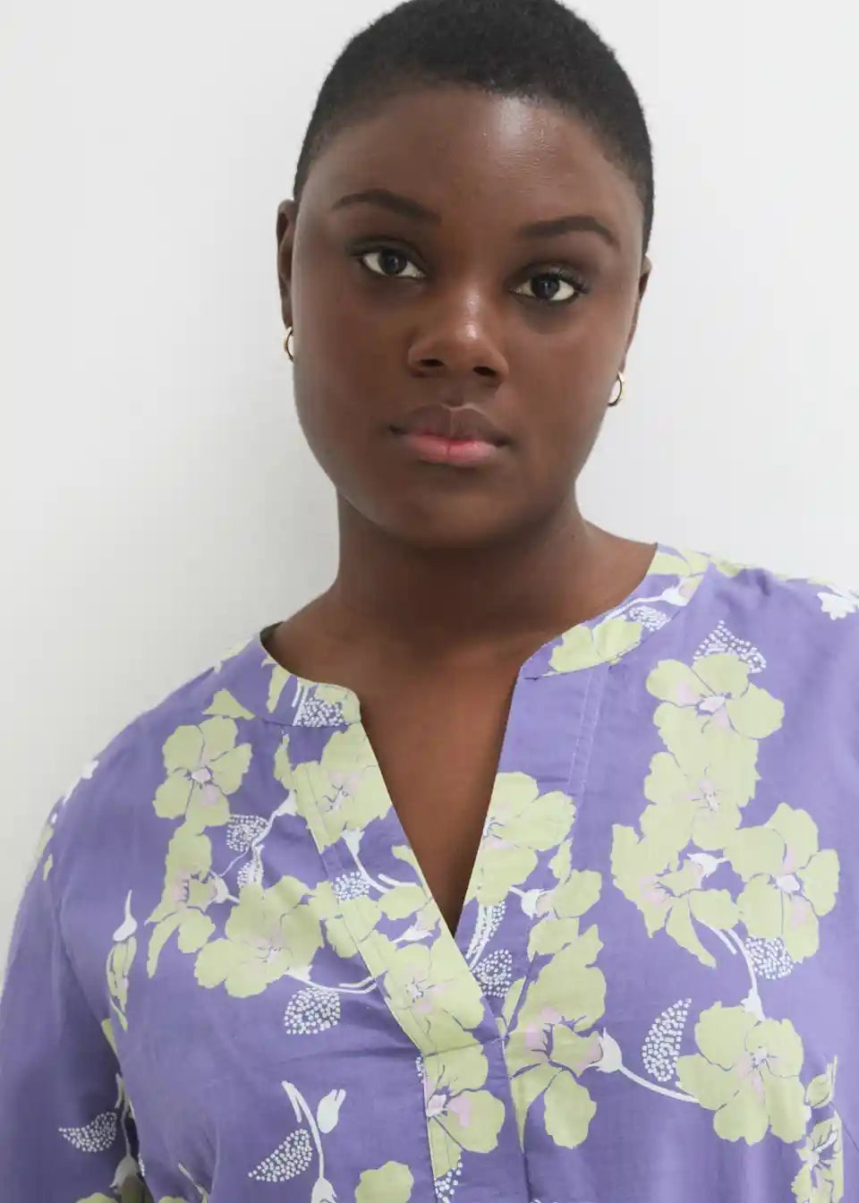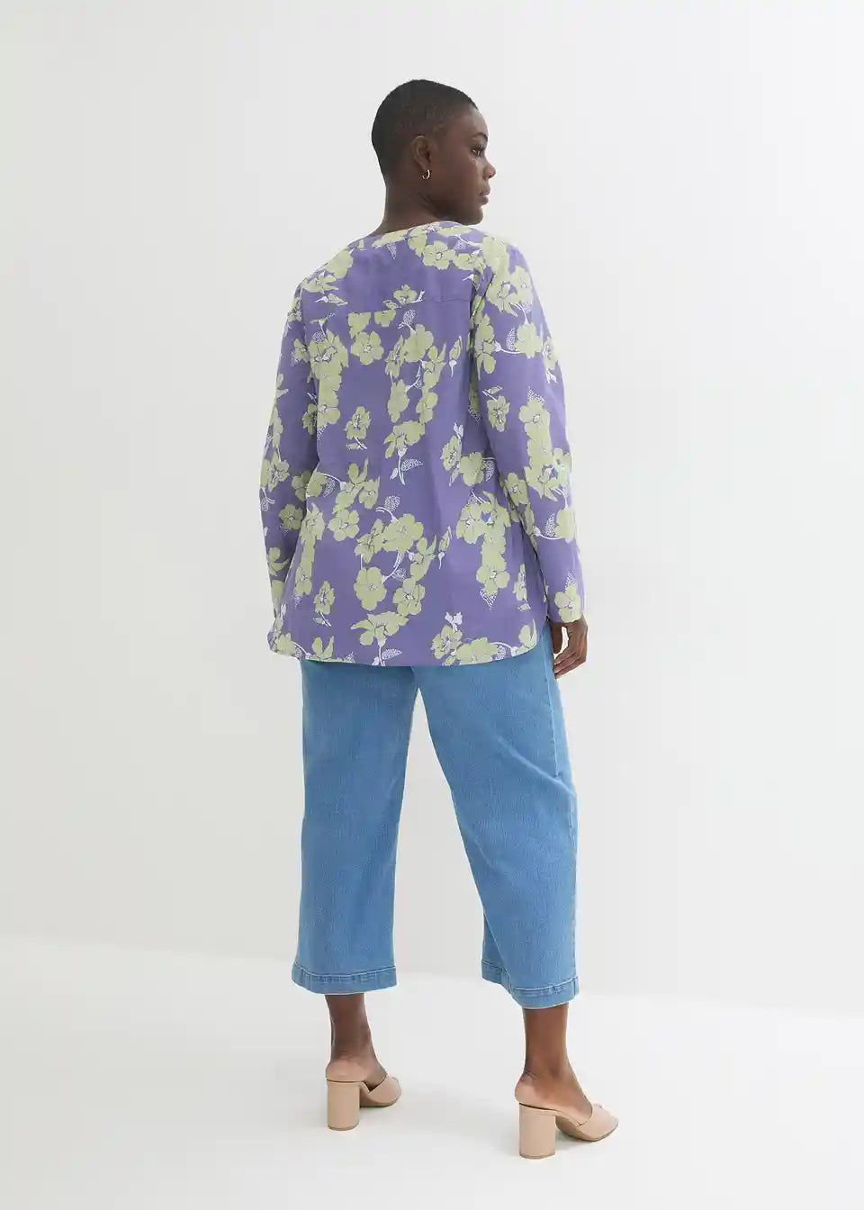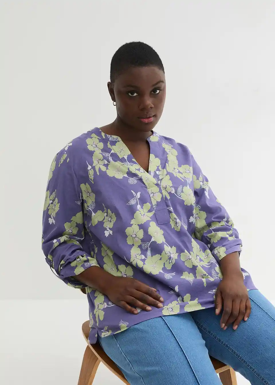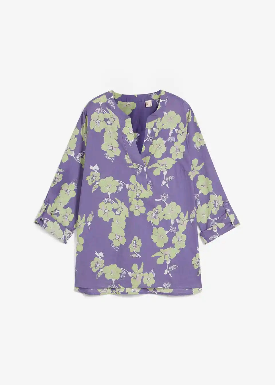 Natisnjena tunika bluza laskavo poudari postavo s svojo prijazno A-linijo