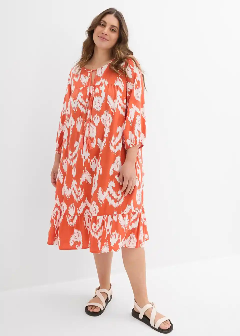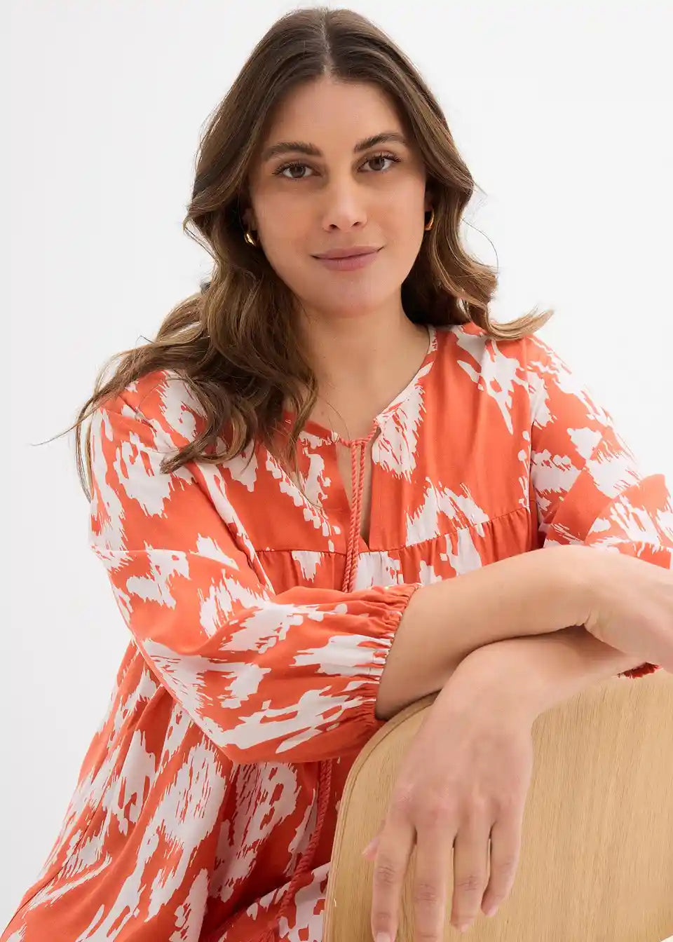 Tunika obleka v sproščenem kroju. S 3/4 rokavi in vezalko z resicami na izrezu.