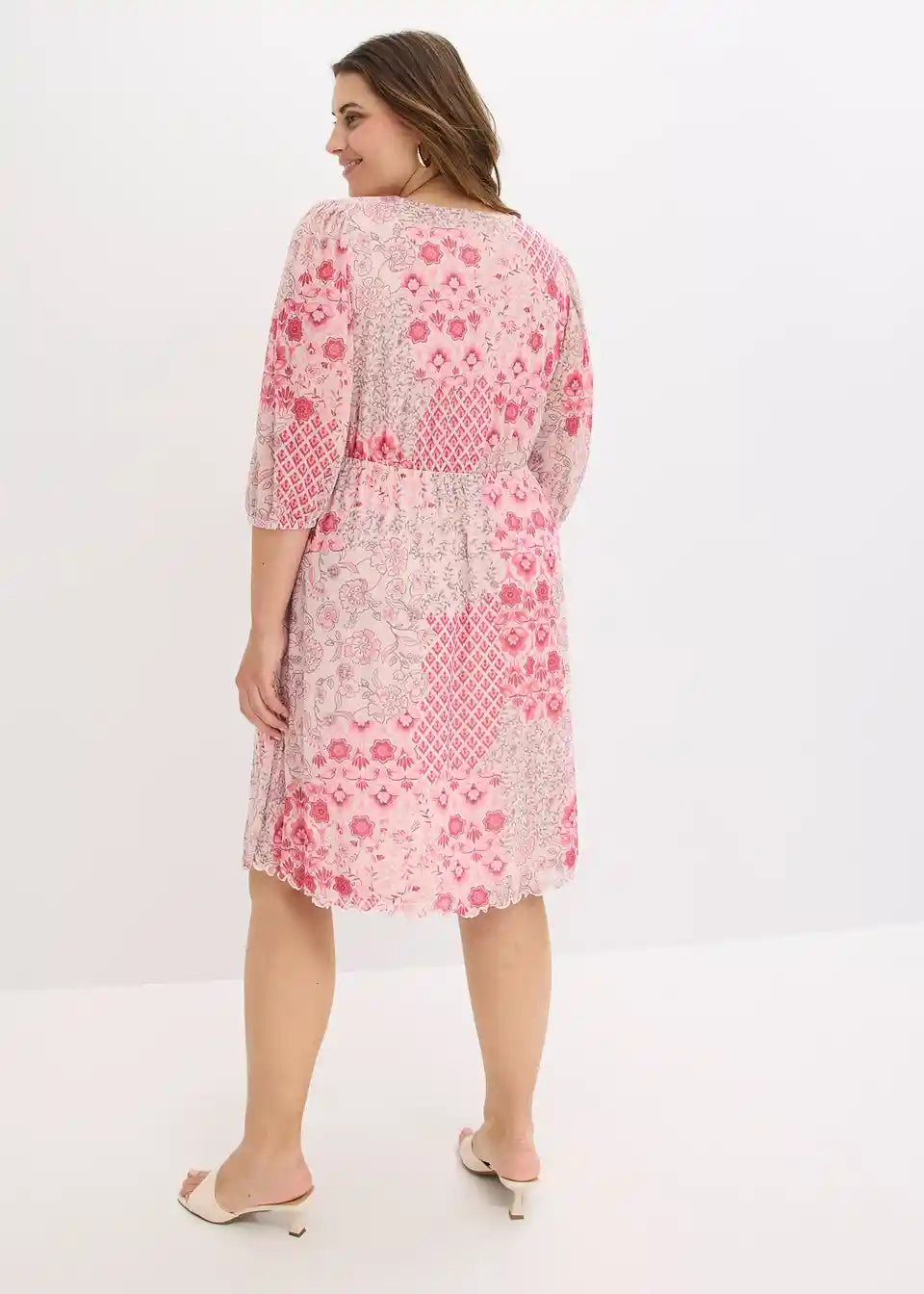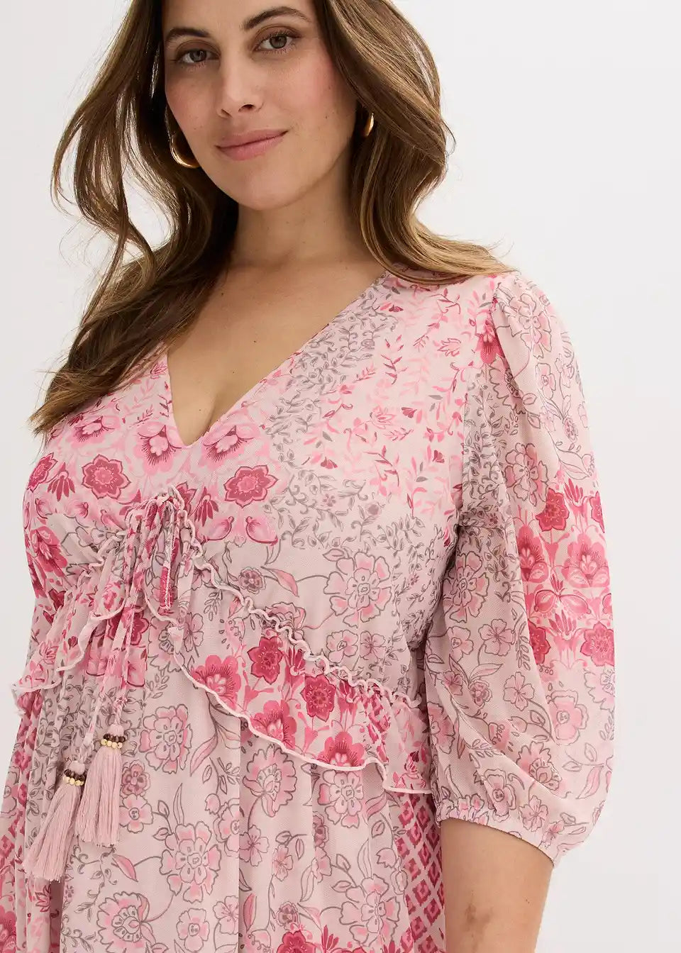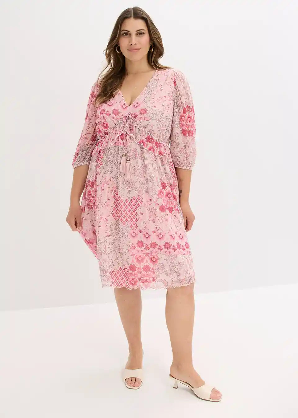 ženska tunika obleka iz mrežastega materiala z majhnim volančkom in dekorativnim zavezovanjem spredaj v pasu