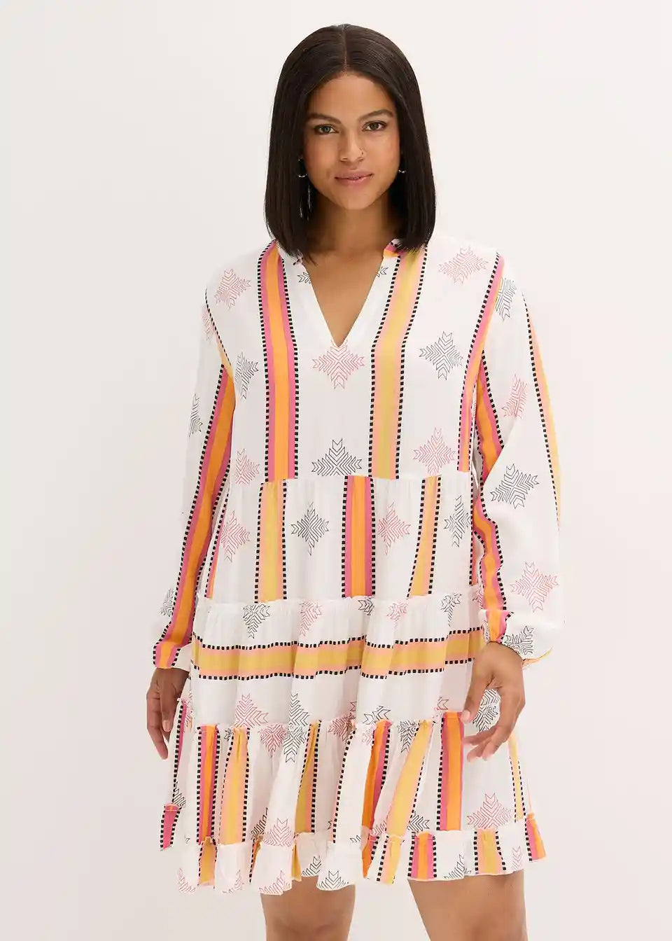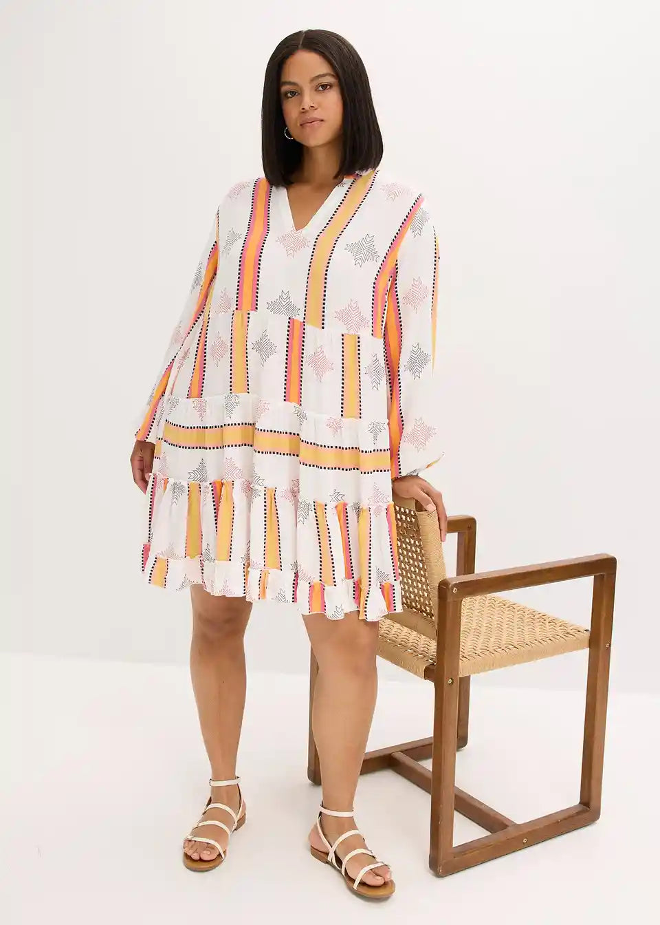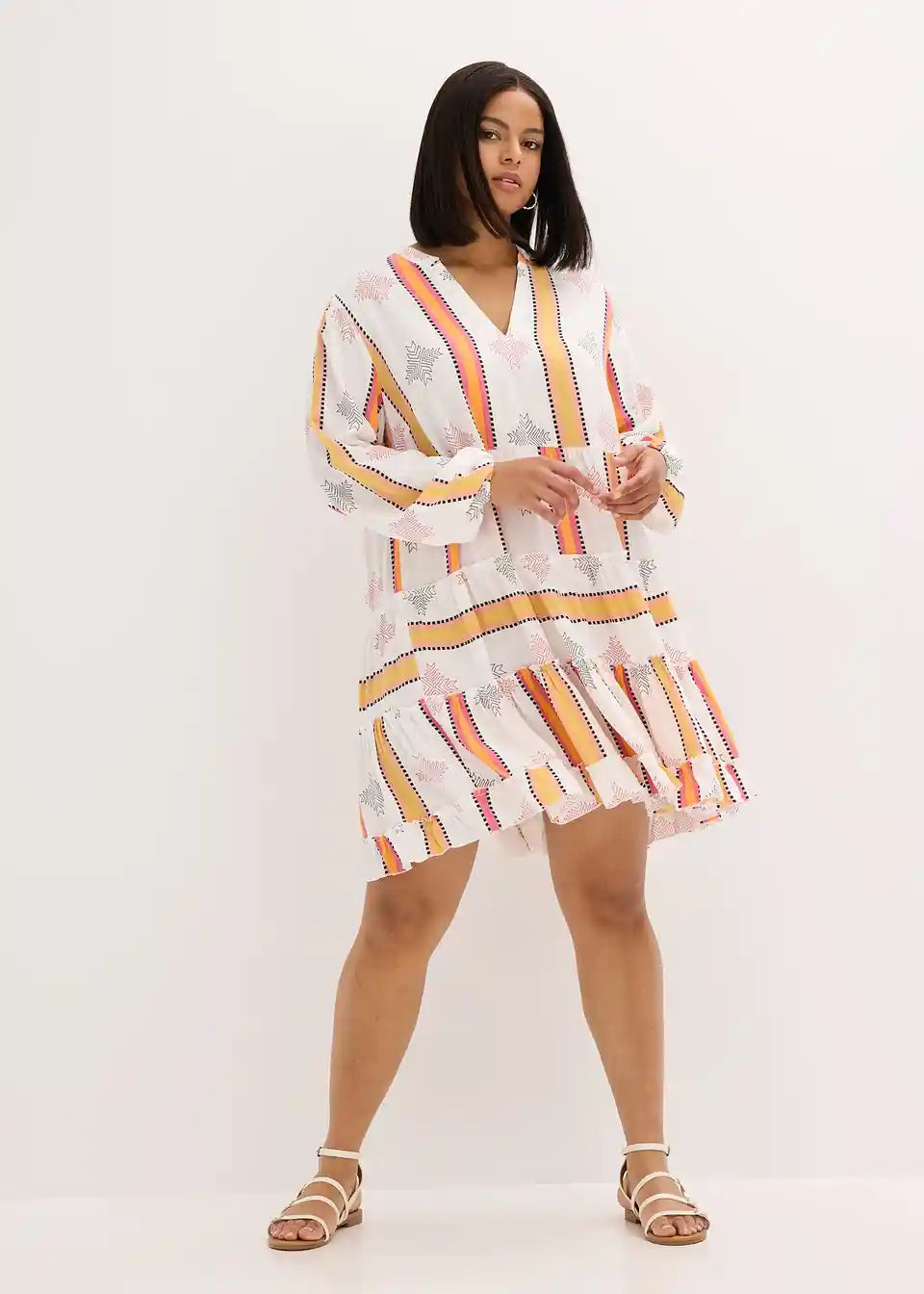 poletna tunika obleka iz tekoče viskoze s stopničastim krilom in volančki na robu rokavov