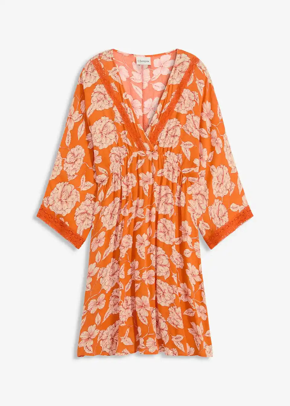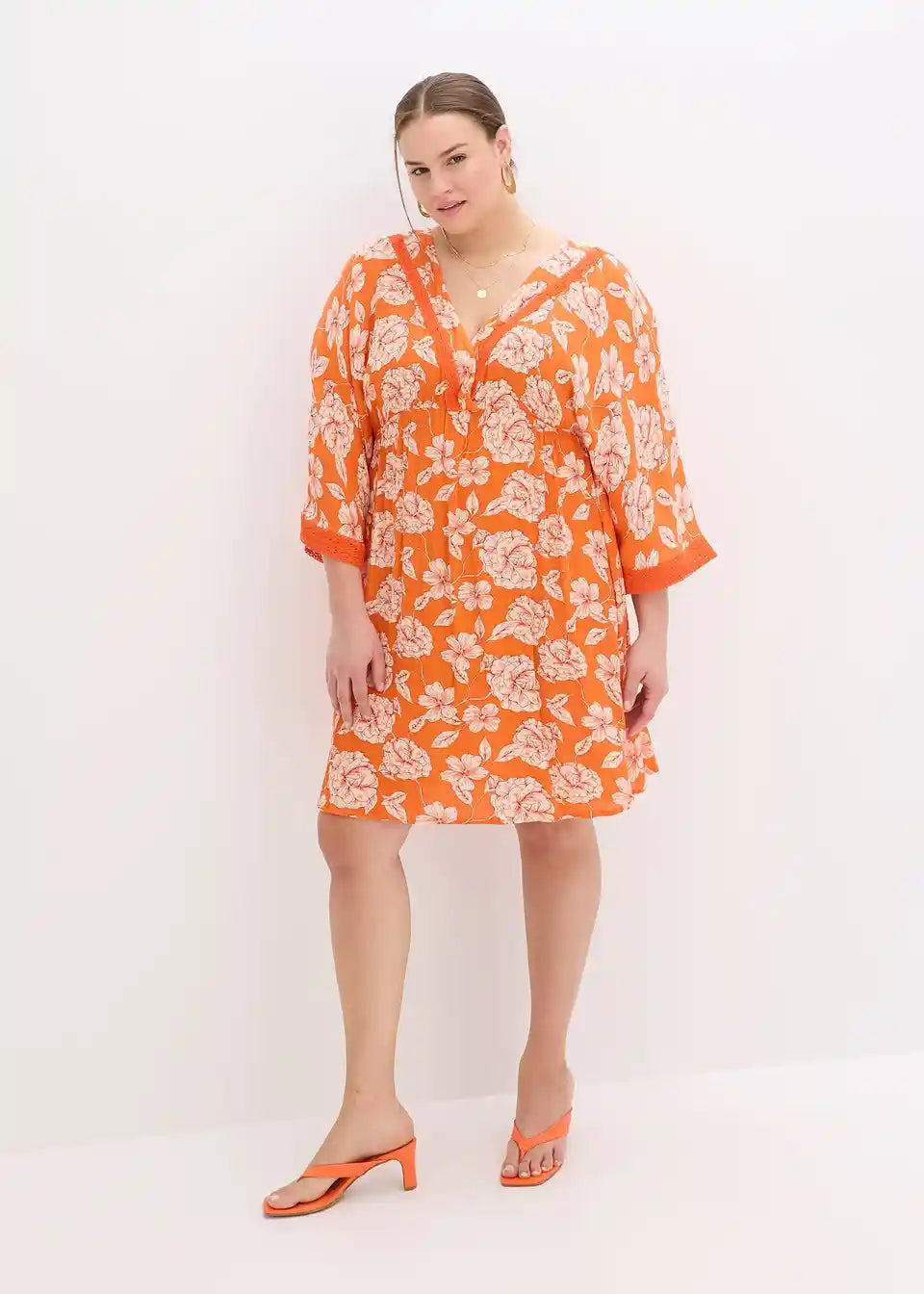 poletna tunika obleka iz strukturirane viskoze z dekorativno čipko na izrezu spredaj in na robu rokavov