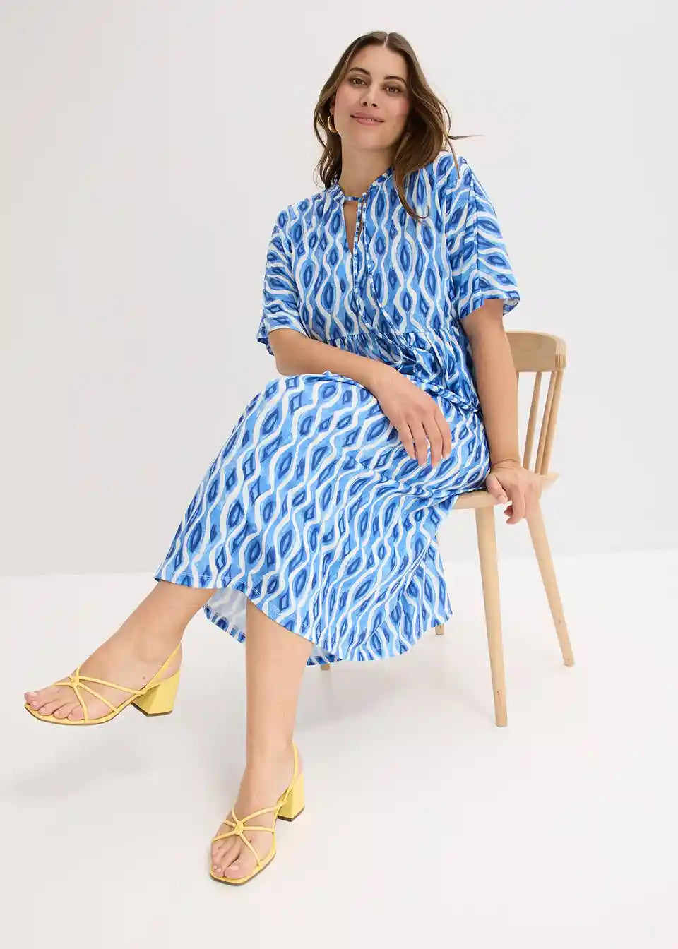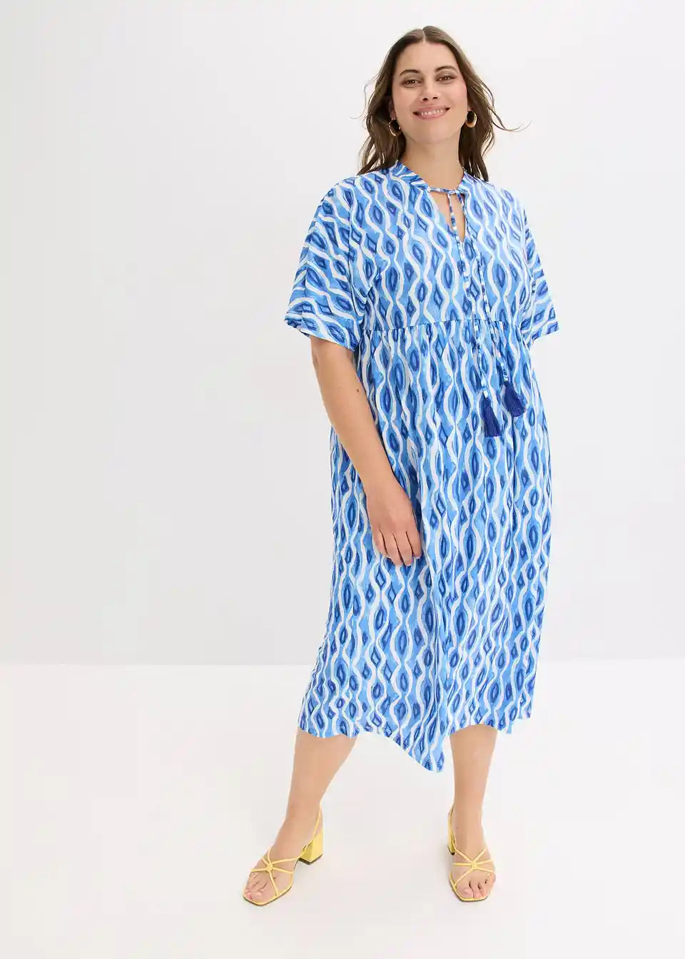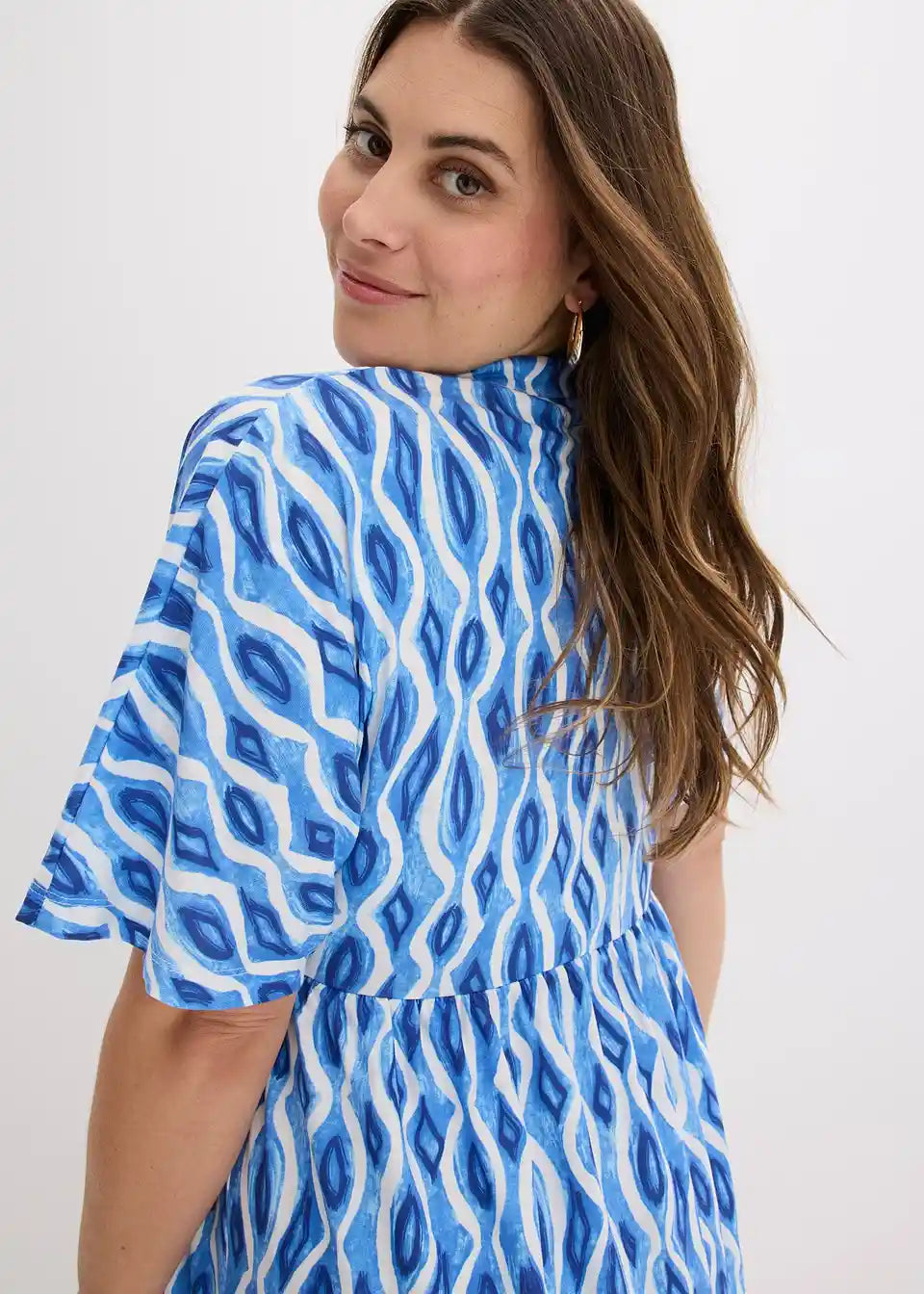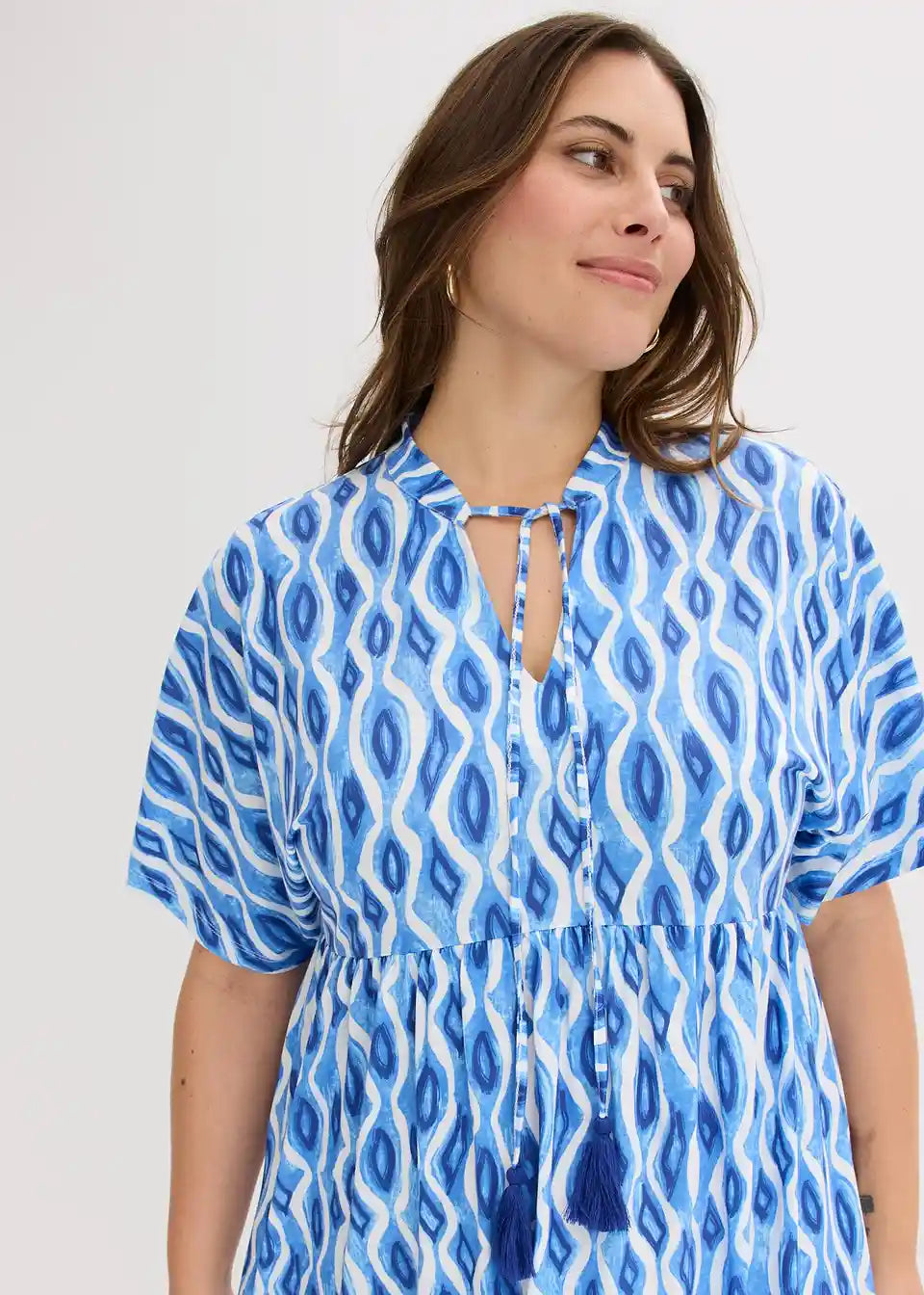 poletna tunika obleka z midijsko dolžino, z zavezovanjem spredaj na izrezu in širokimi rokavi.