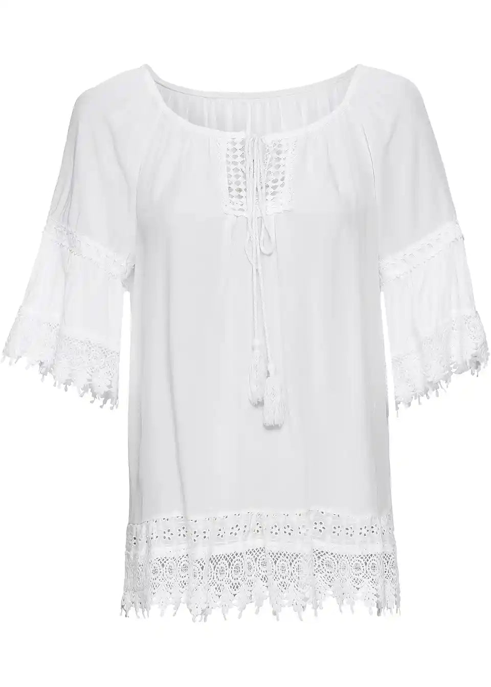 Skrbno oblikovana tunika s čipko in volančki na rokavih in robu, rahlo prozoren material
