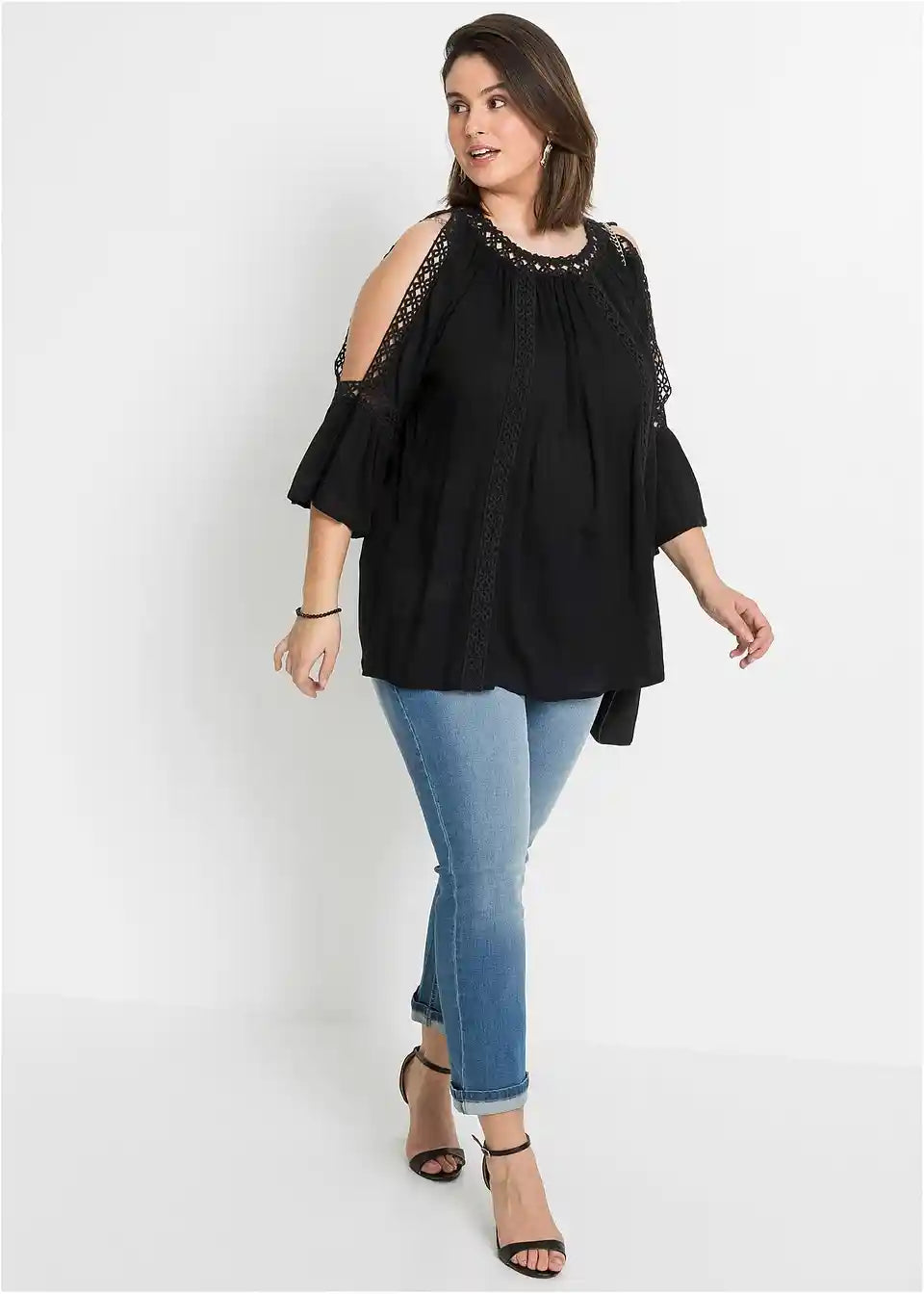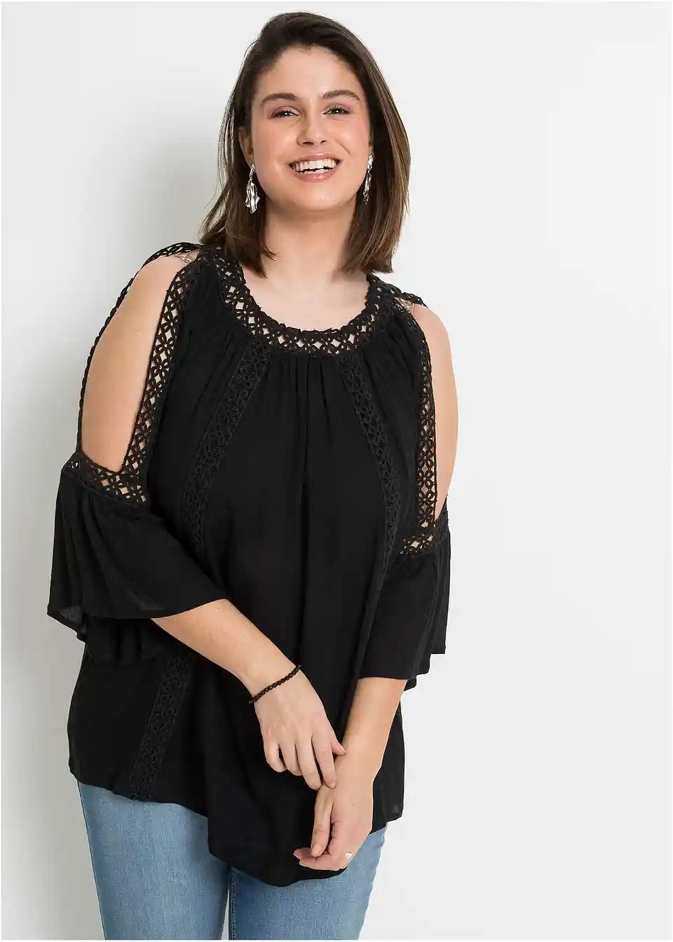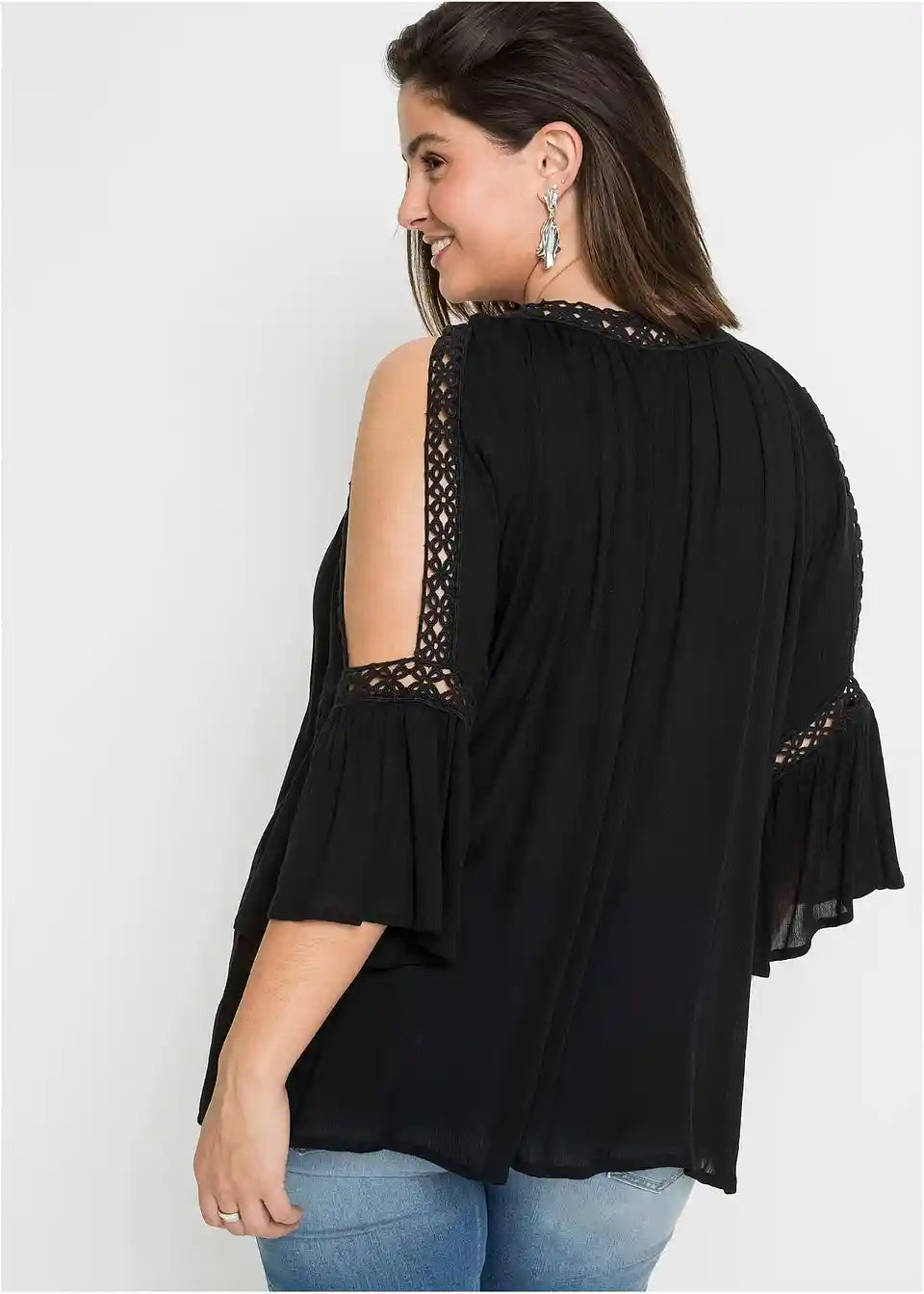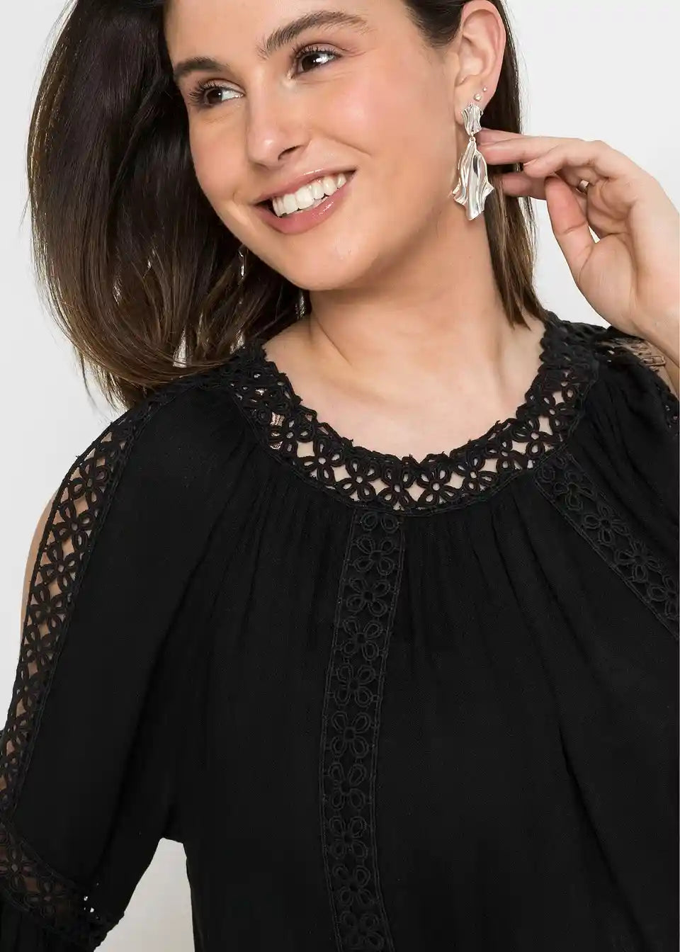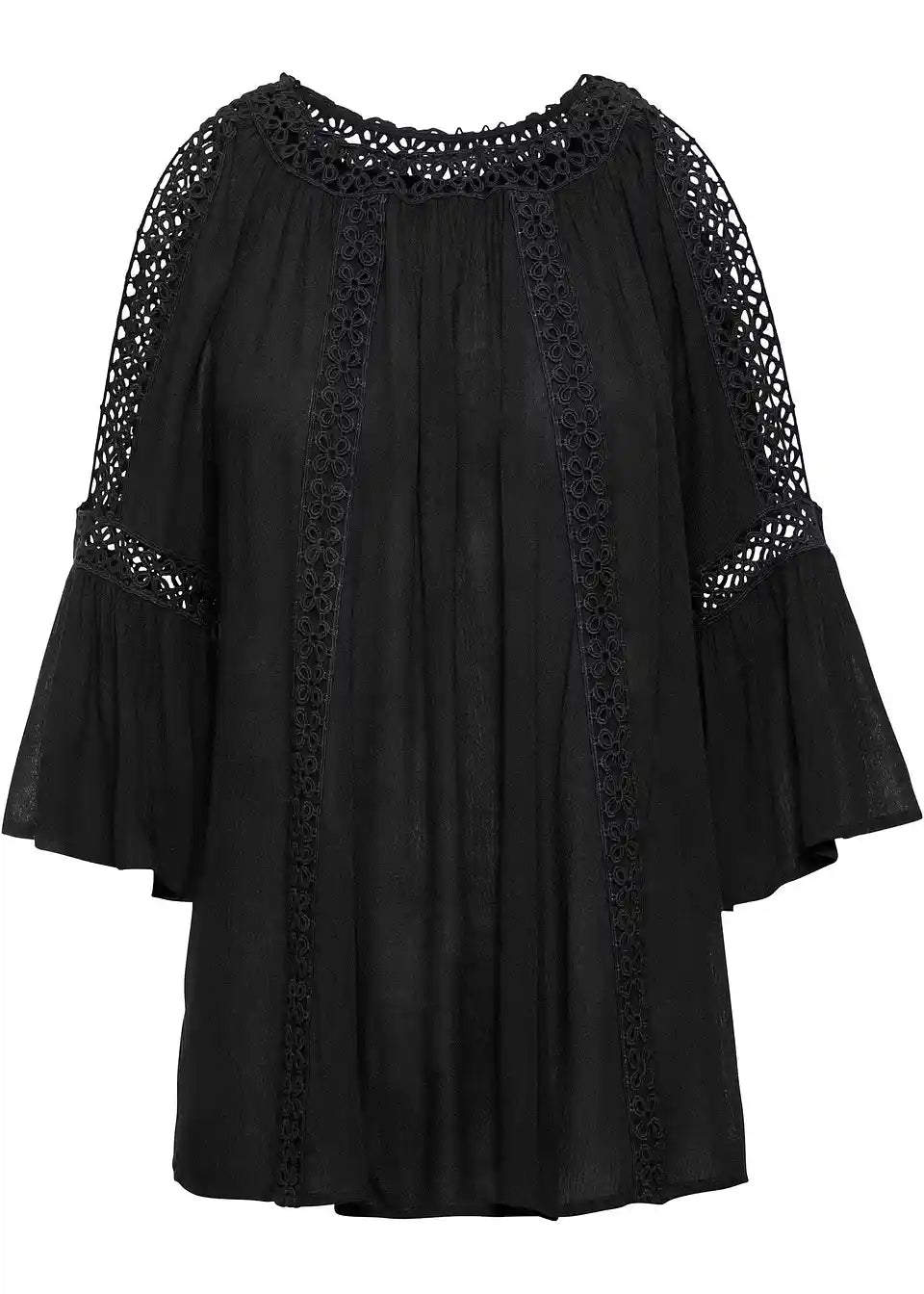 Poletna tunika s Cut-Outs in čipkasto okrasitvijo. Bluza je ohlapno krojena in ima čipkaste detajle na ramenih s Cut-Outs. Dolžina pri št. 38 znaša približno 62 cm.