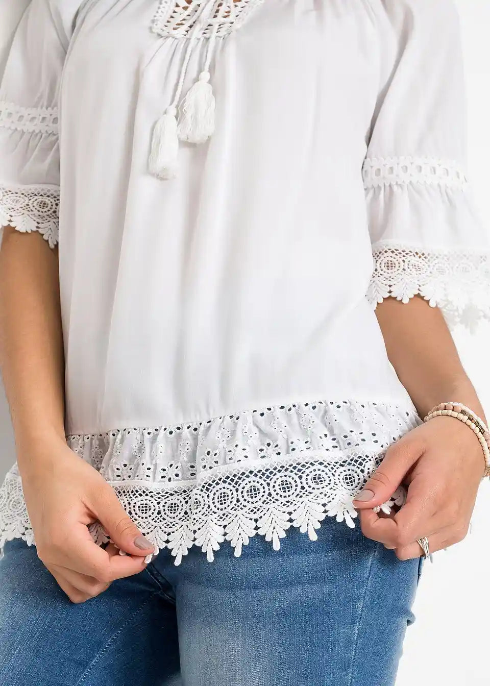 Bogato oblikovana tunika z čipko in volančki na rokavih in robu, rahlo prosojen material