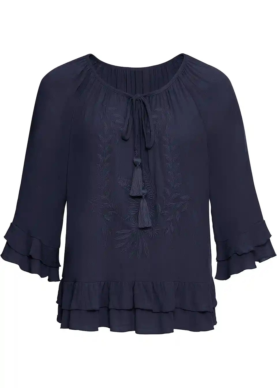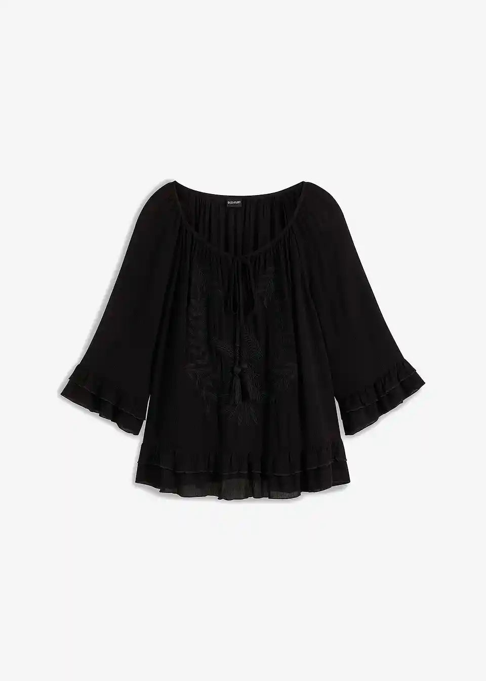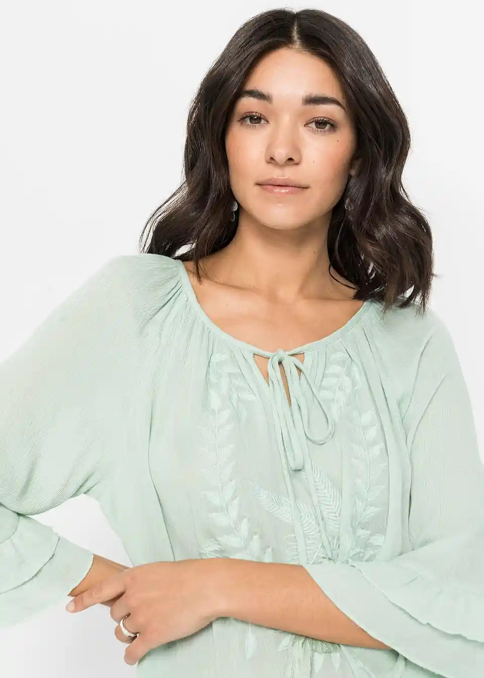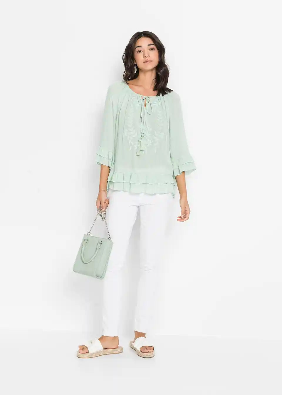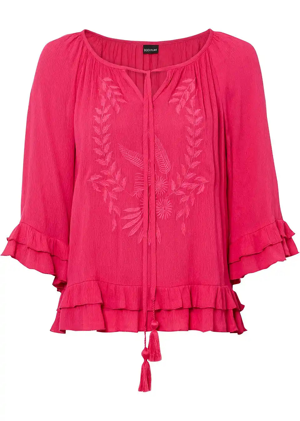Ta enobarvno vezena bluza znamke BODYFLIRT očara s svojim nežnim šarmom. Lepo oblikovane gube krasijo širok okrogel izrez, ki ga dopolnjuje majhen izrez (cut-out). Dolga vezalka s cofki doda igriv poudarek. Dvojni volančki usmerjajo pozornost na zaključke rokavov in rob tunike. Sproščen kroj lepo zaokroži videz bluze z vezenino.