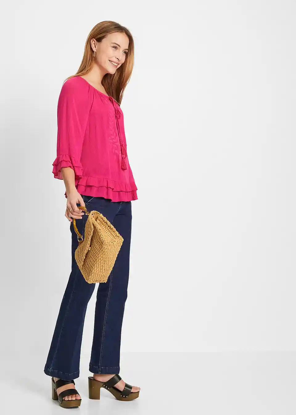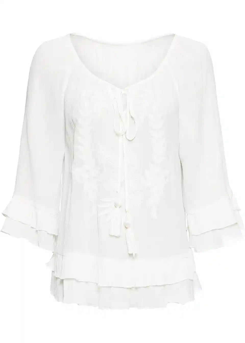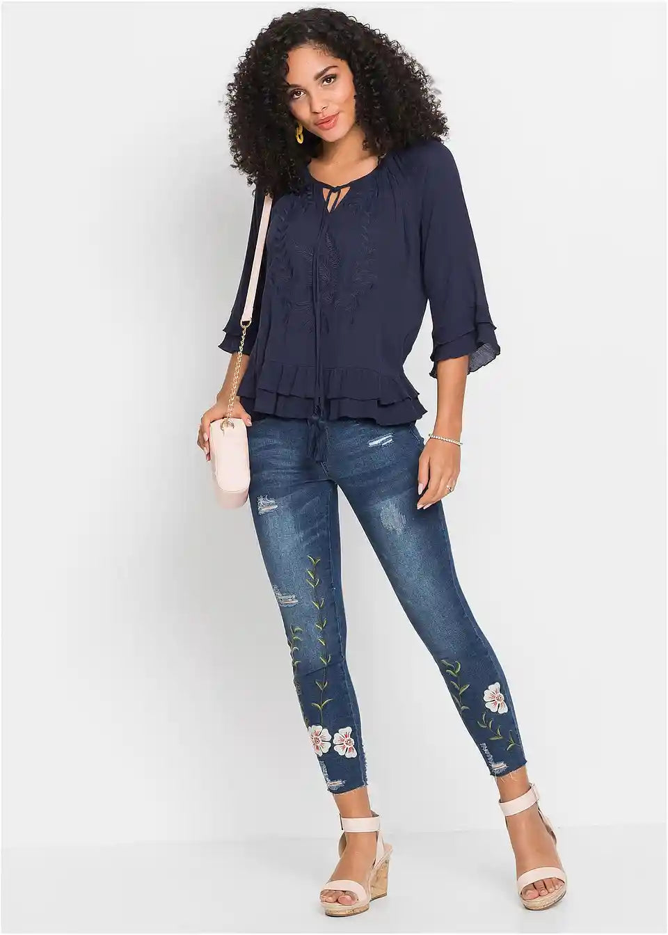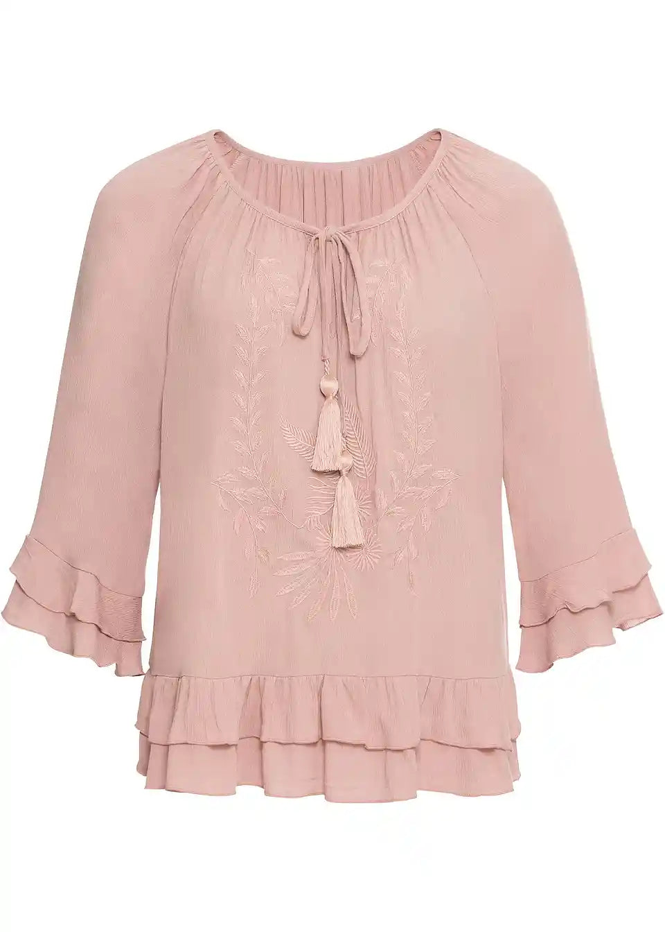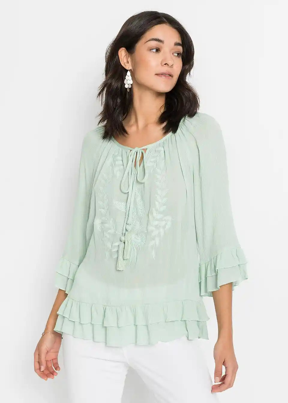 Ta enobarvno vezena bluza znamke BODYFLIRT očara s svojim nežnim šarmom. Lepo oblikovane gube krasijo širok okrogel izrez, ki ga dopolnjuje majhen izrez (cut-out). Dolga vezalka s cofki doda igriv poudarek. Dvojni volančki usmerjajo pozornost na zaključke rokavov in rob tunike. Sproščen kroj lepo zaokroži videz bluze z vezenino.
