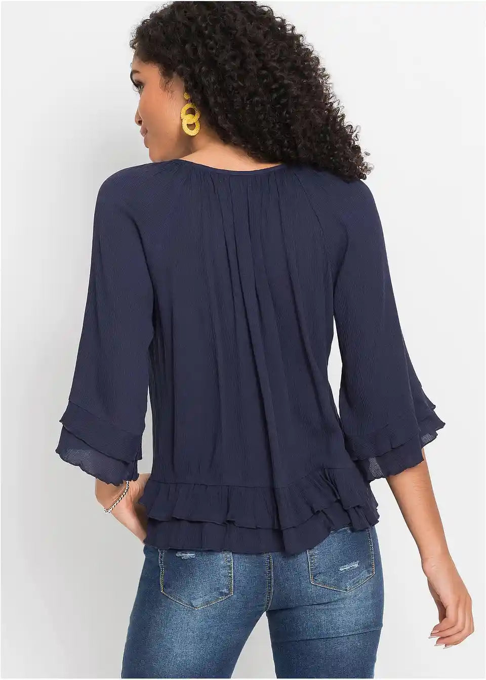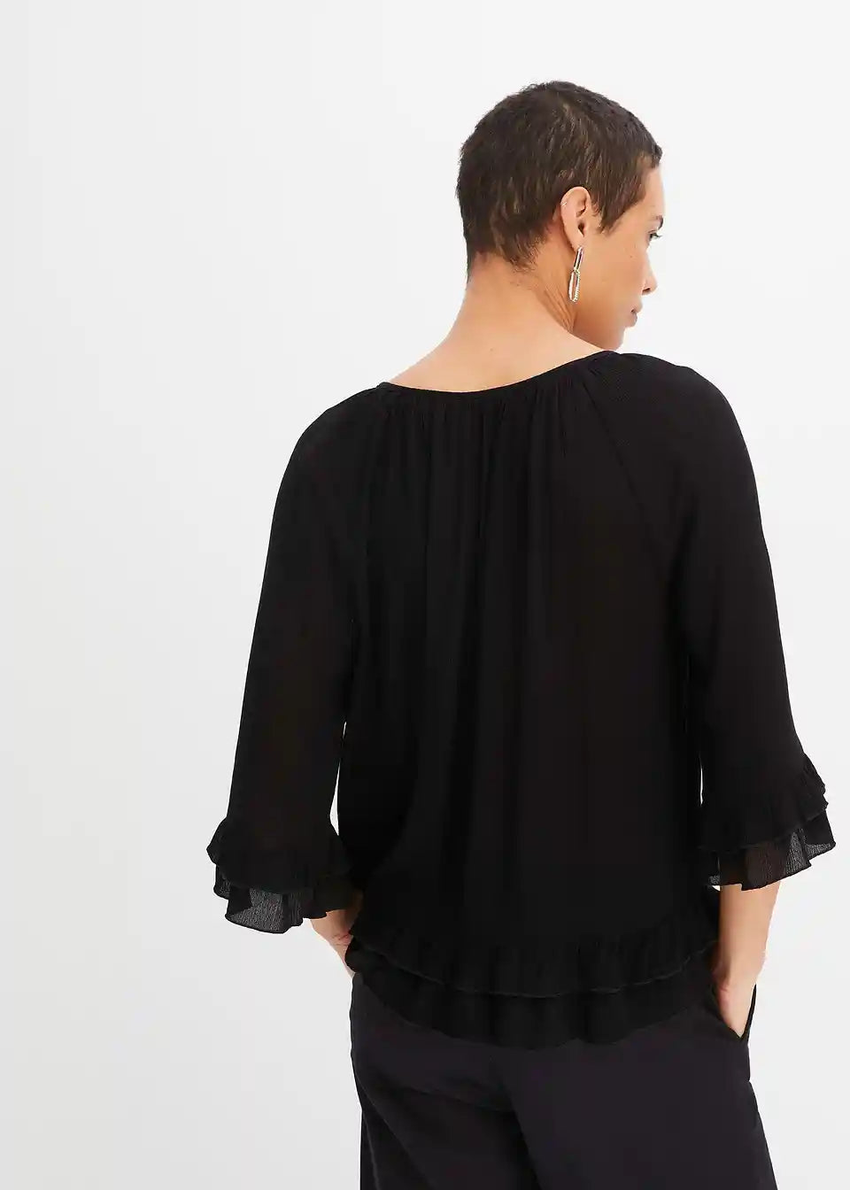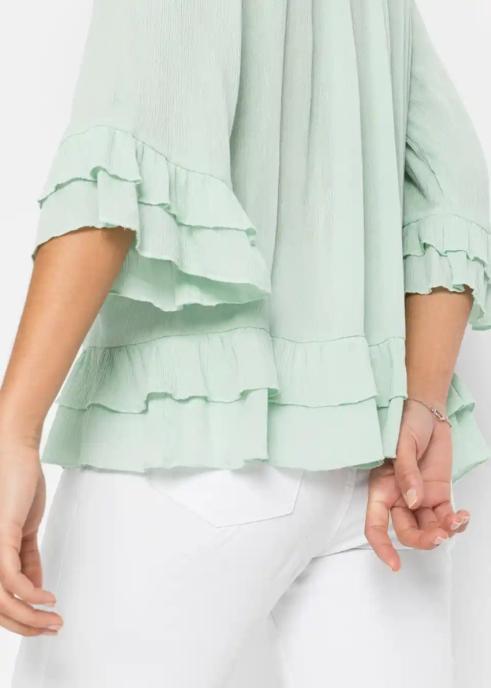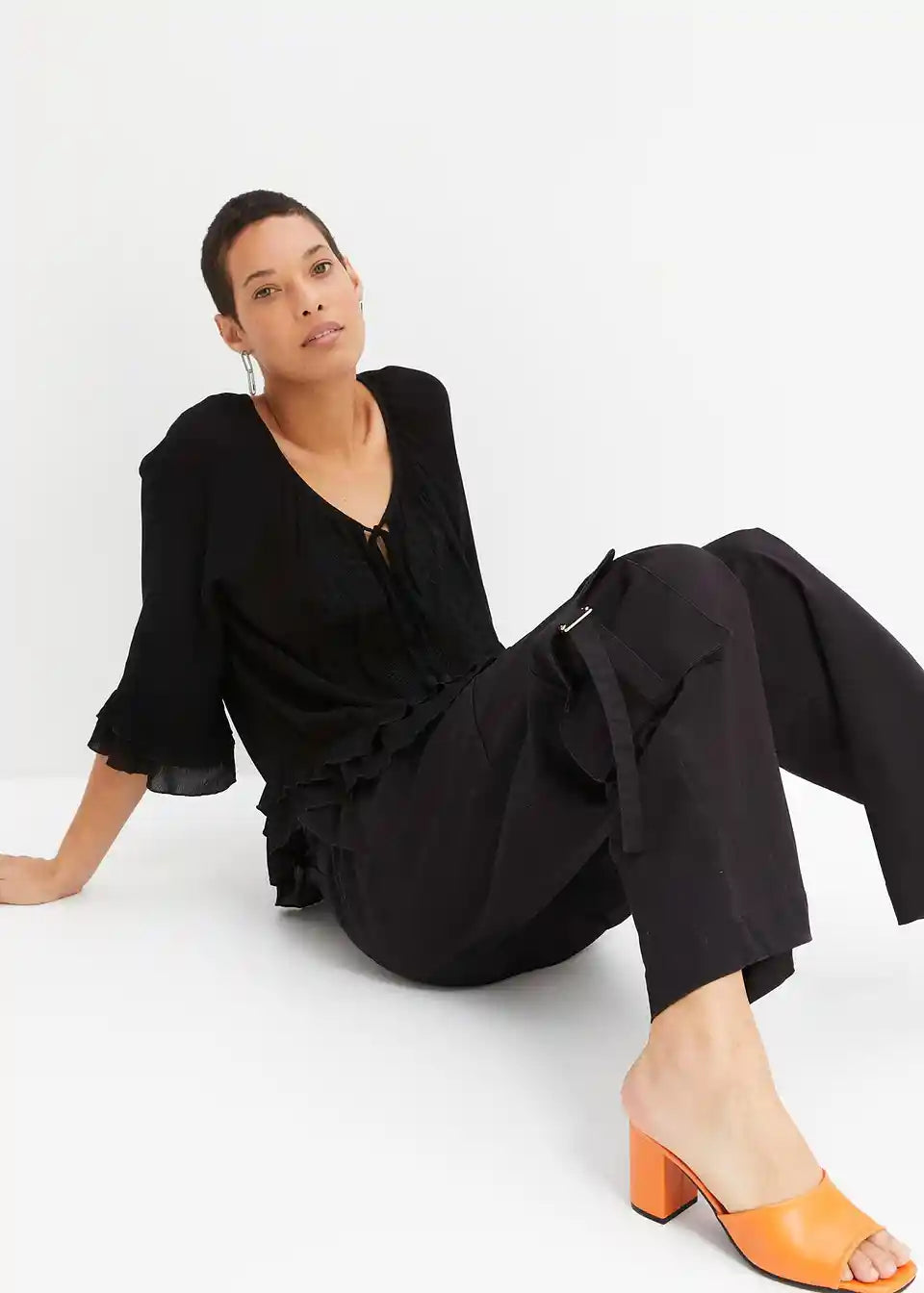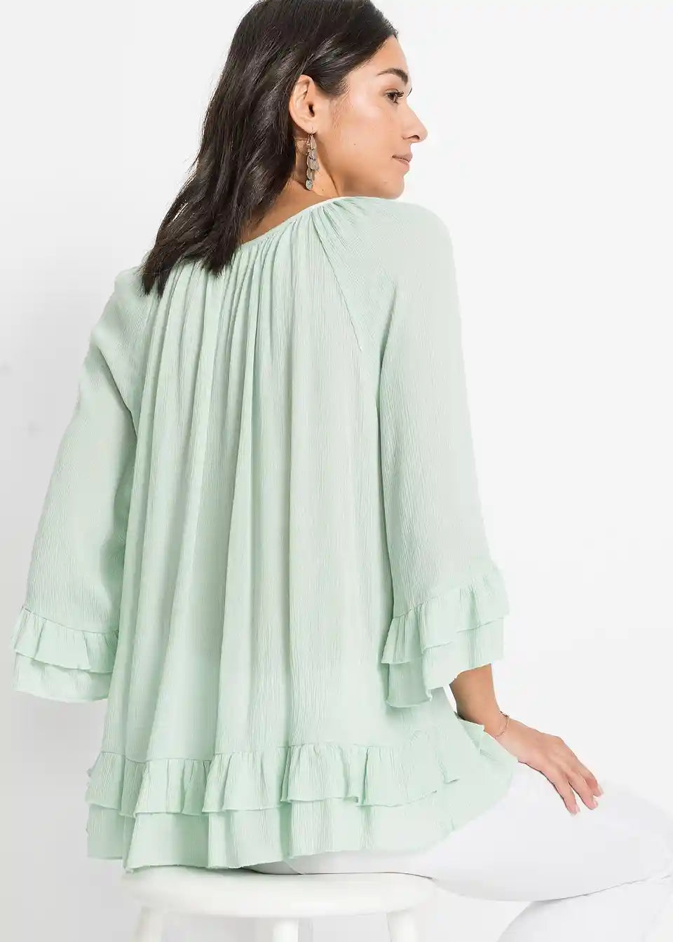 Ta enobarvno vezena bluza znamke BODYFLIRT očara s svojim nežnim šarmom. Lepo oblikovane gube krasijo širok okrogel izrez, ki ga dopolnjuje majhen izrez (cut-out). Dolga vezalka s cofki doda igriv poudarek. Dvojni volančki usmerjajo pozornost na zaključke rokavov in rob tunike. Sproščen kroj lepo zaokroži videz bluze z vezenino.