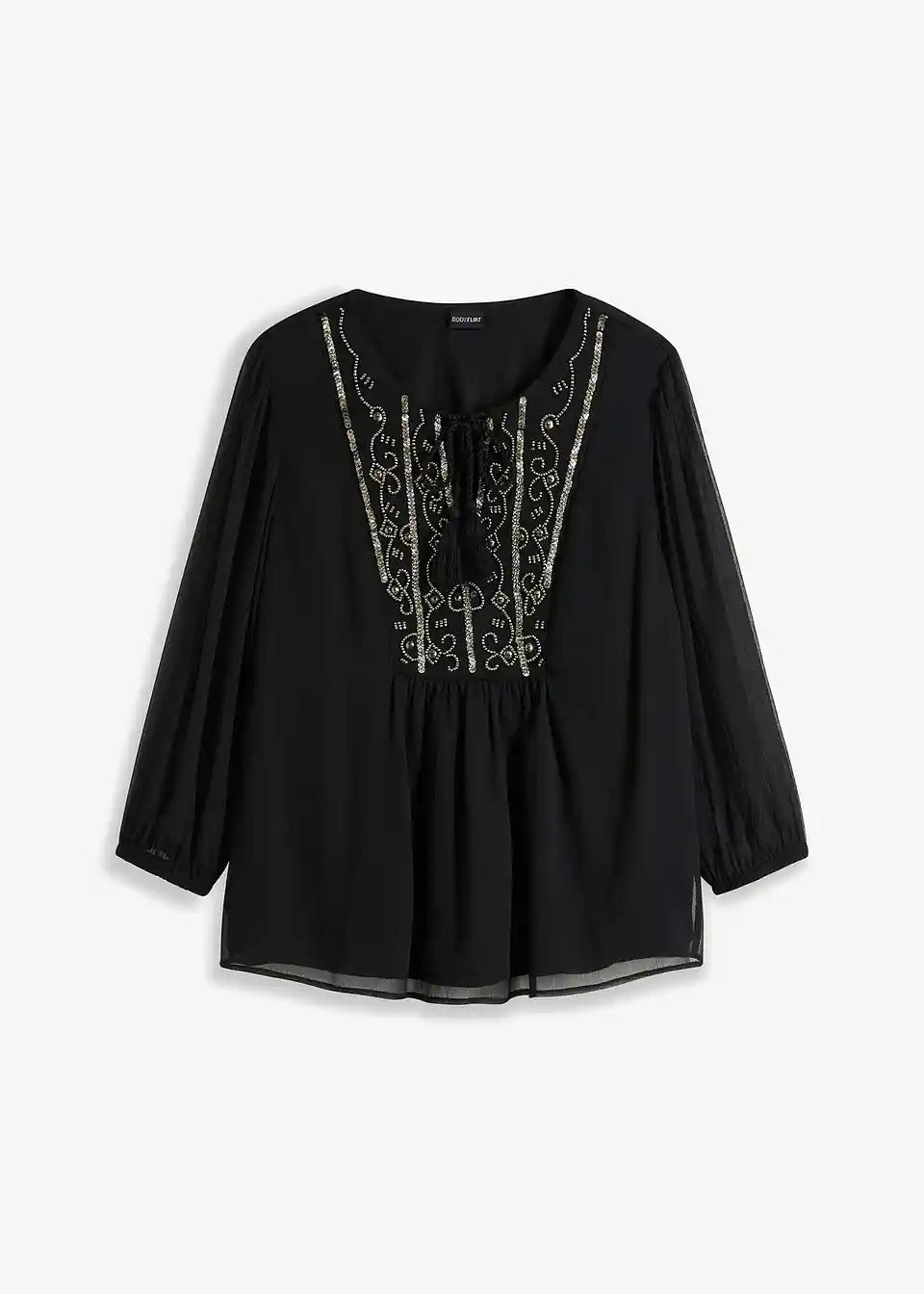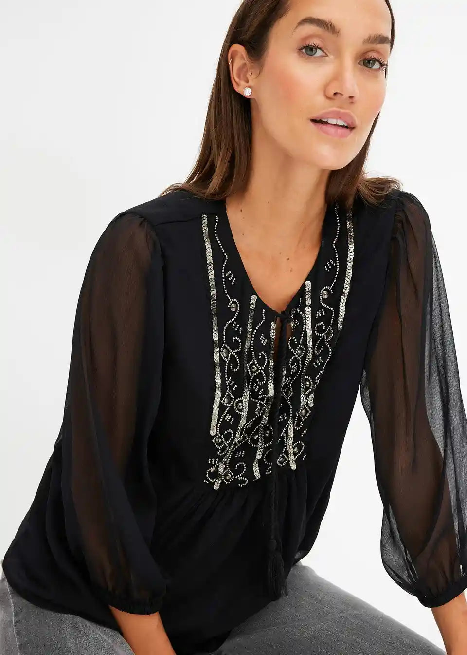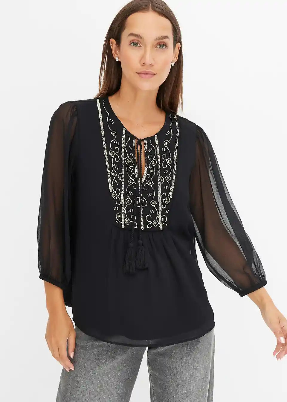 feminilna tunikina bluza z bisernimi aplikacijami in vezalko spredaj na izrezu