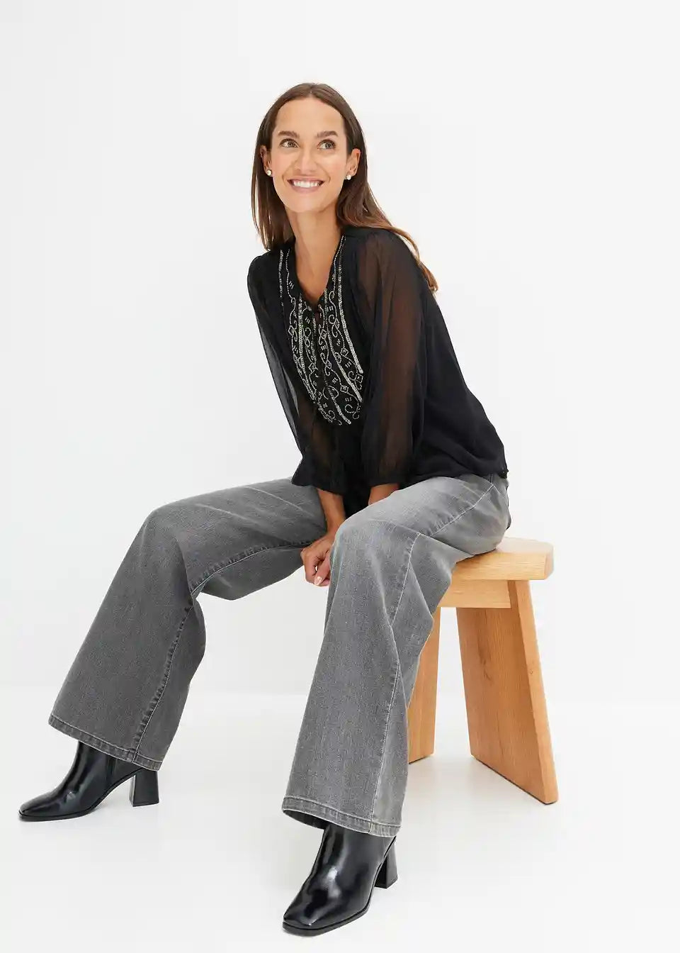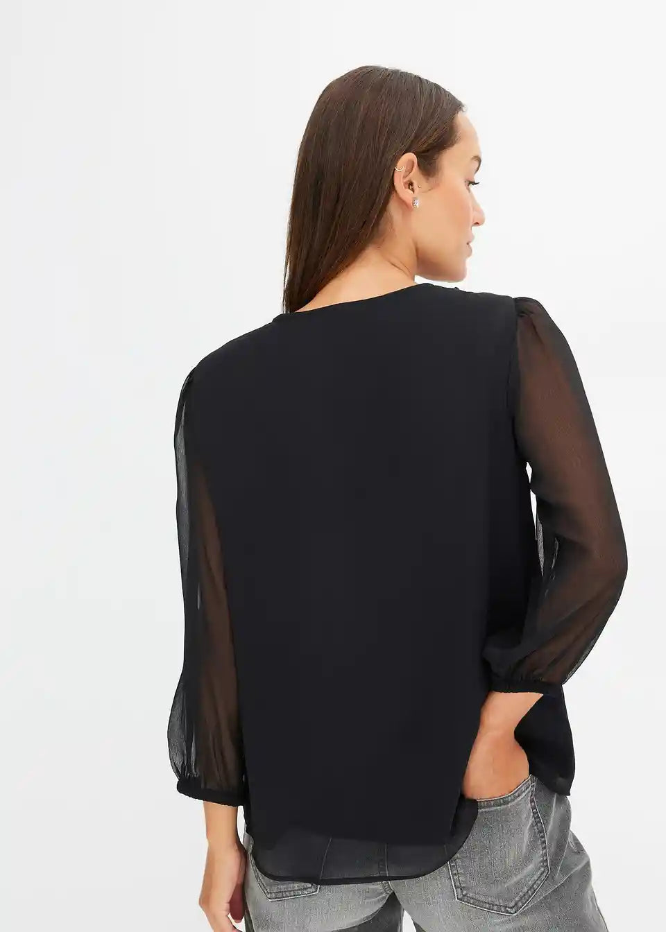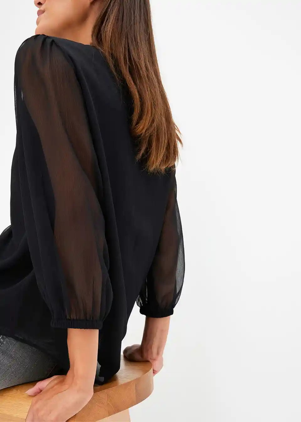 feminilna tunikina bluza z bisernimi aplikacijami in vezalko spredaj na izrezu
