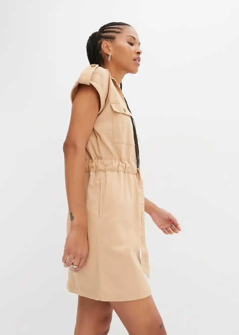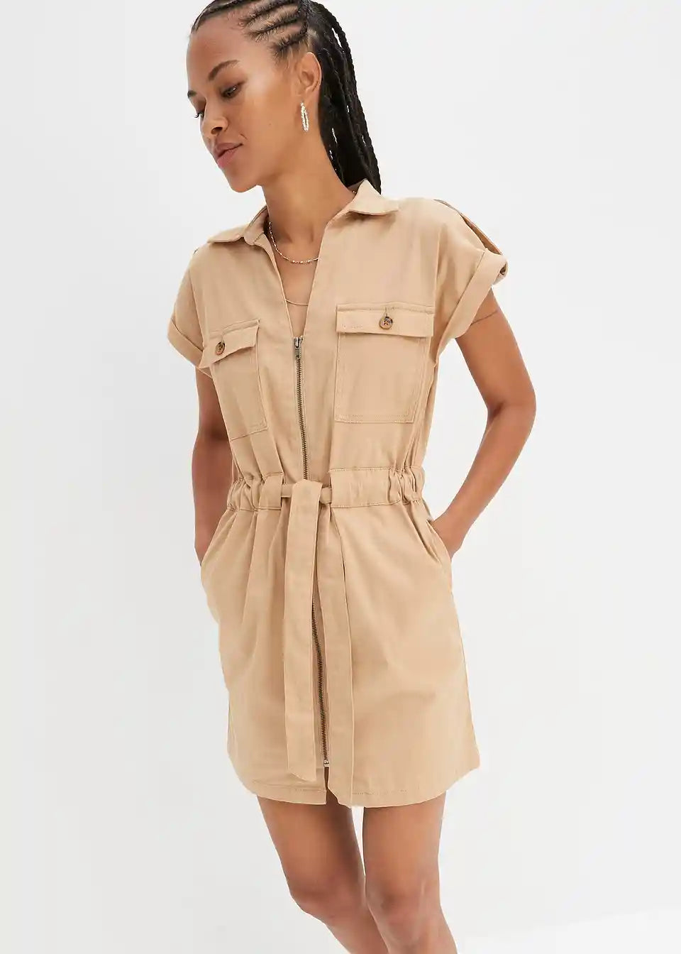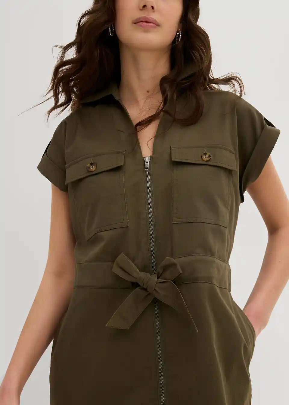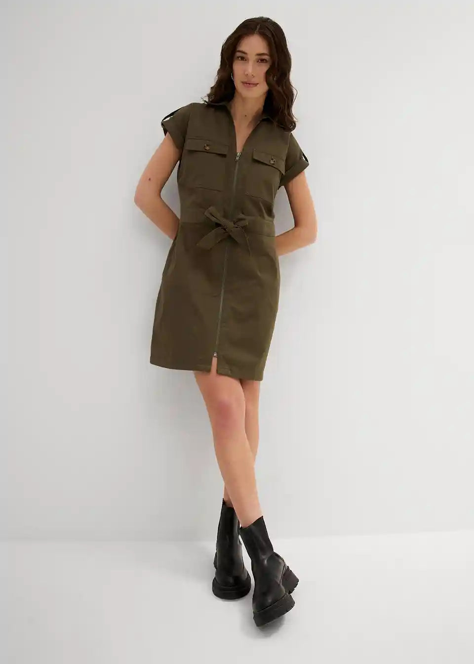 Trendovska twill obleka s cargo detajli in nastavljivim zavezovanjem v pasu v sproščenem kroju.