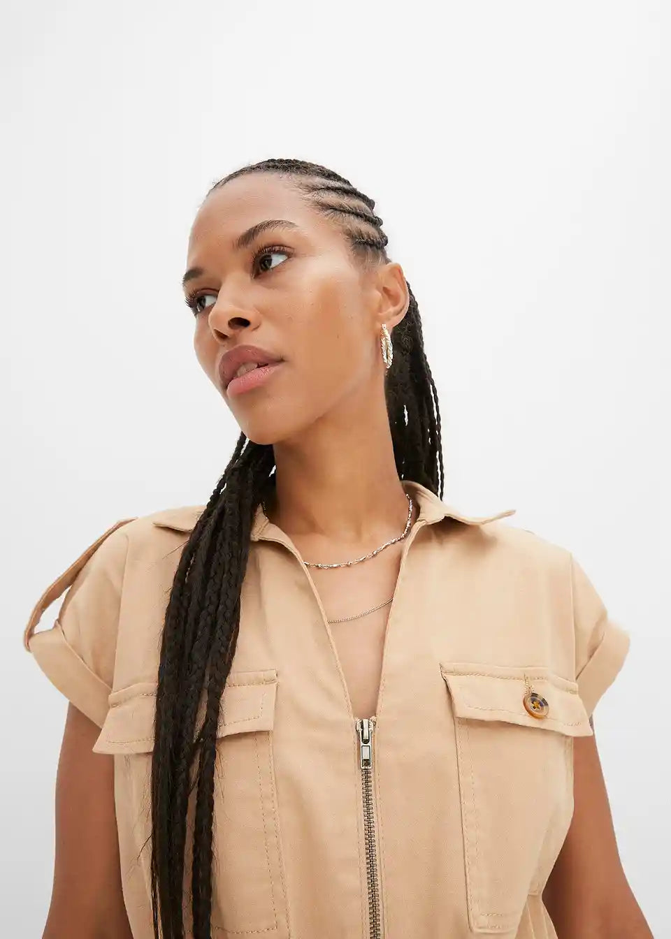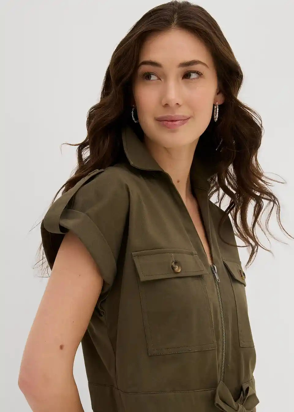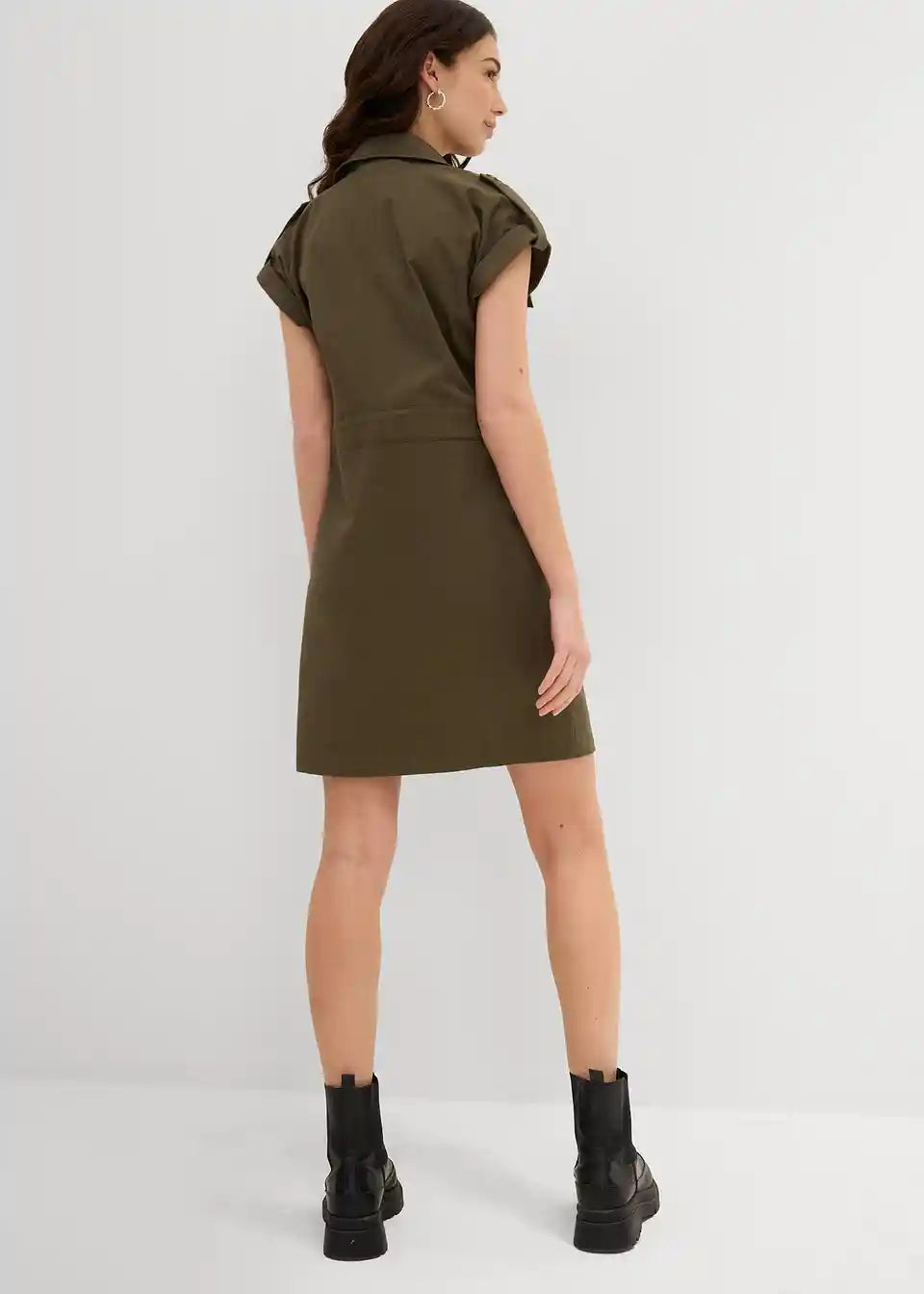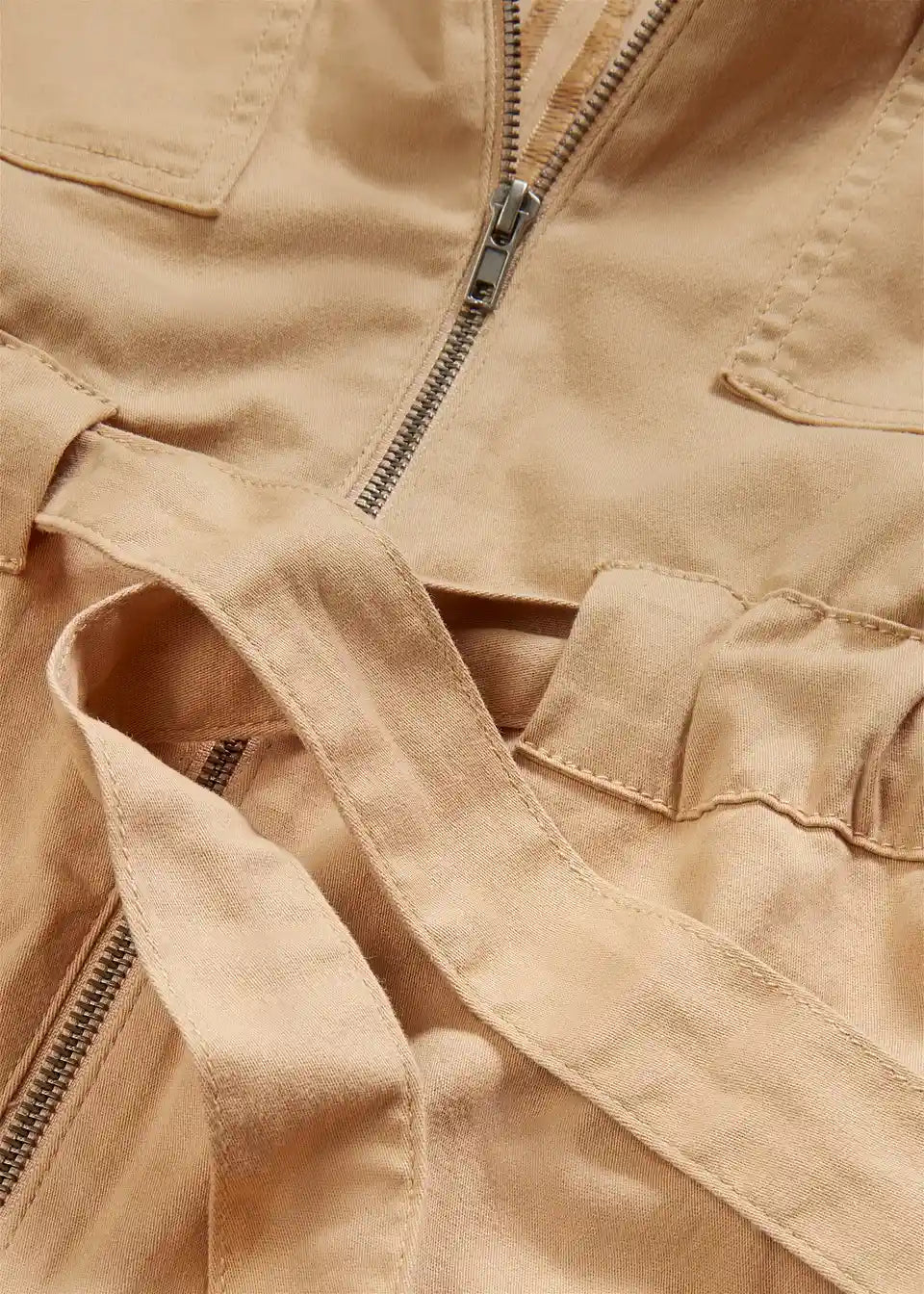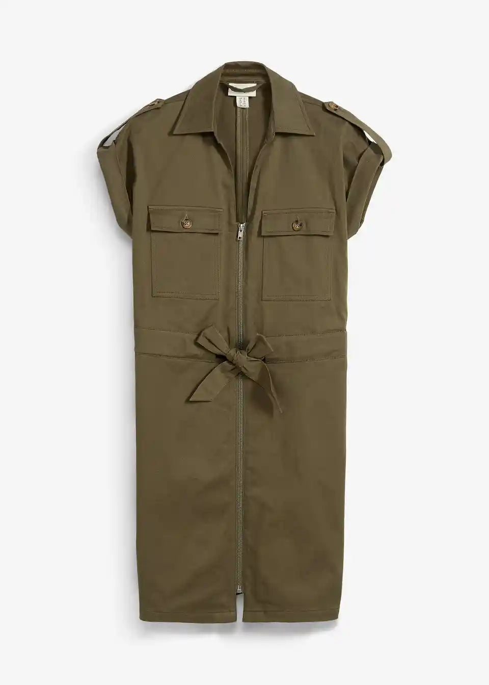 Trendovska twill obleka s cargo detajli in nastavljivim zavezovanjem v pasu v sproščenem kroju.