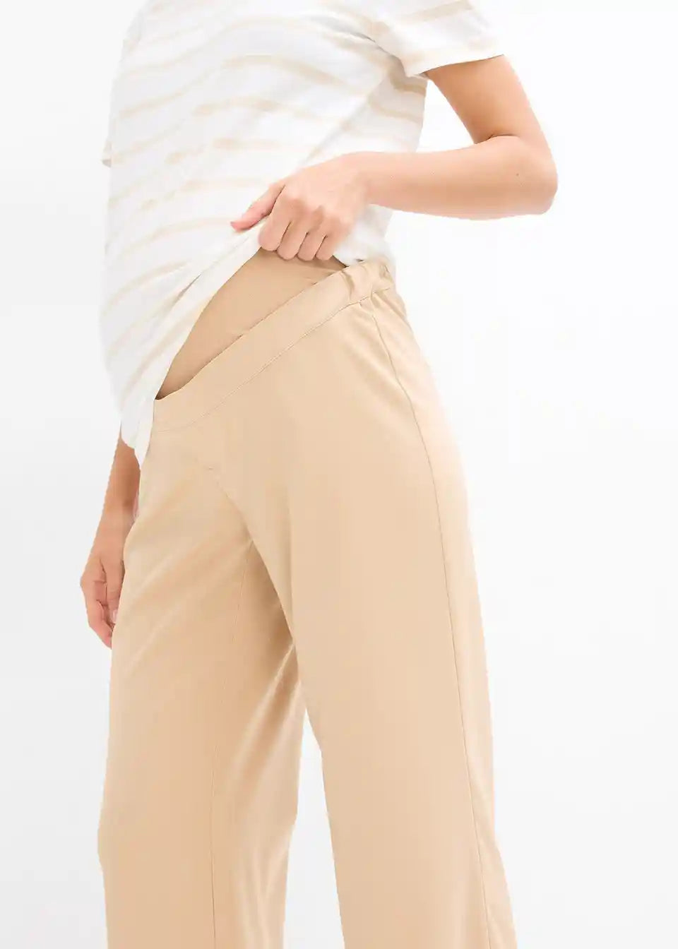 Ohlapno padajoče nosečniške hlače iz tkanine z širokimi hlačnicami. Elastičen pas na zadnjem delu se prilagaja obsegu trebuha in zagotavlja udobno prileganje. Z nakazanimi žepi zadaj.