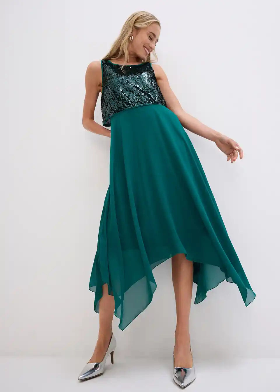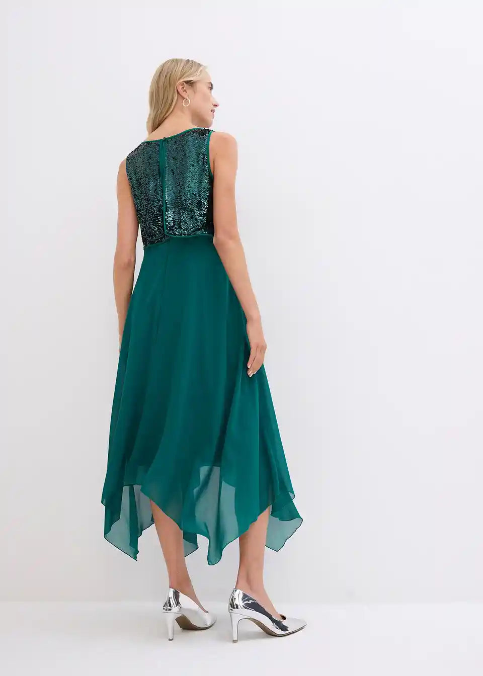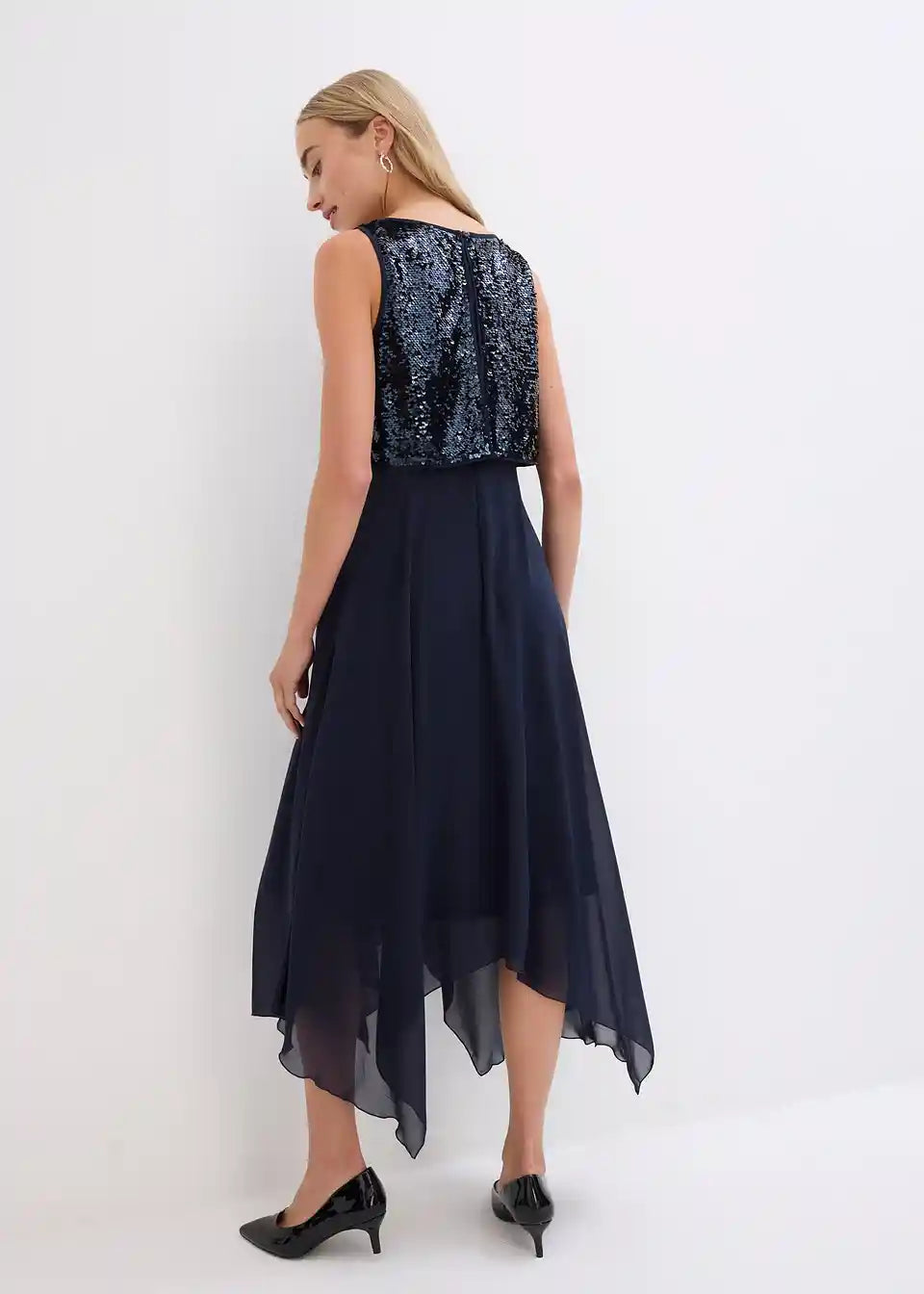 Elegantna večerna obleka s Pailletten zgornjim delom in razkošnim asimetričnim spodnjim delom