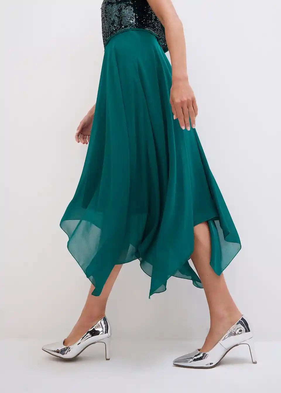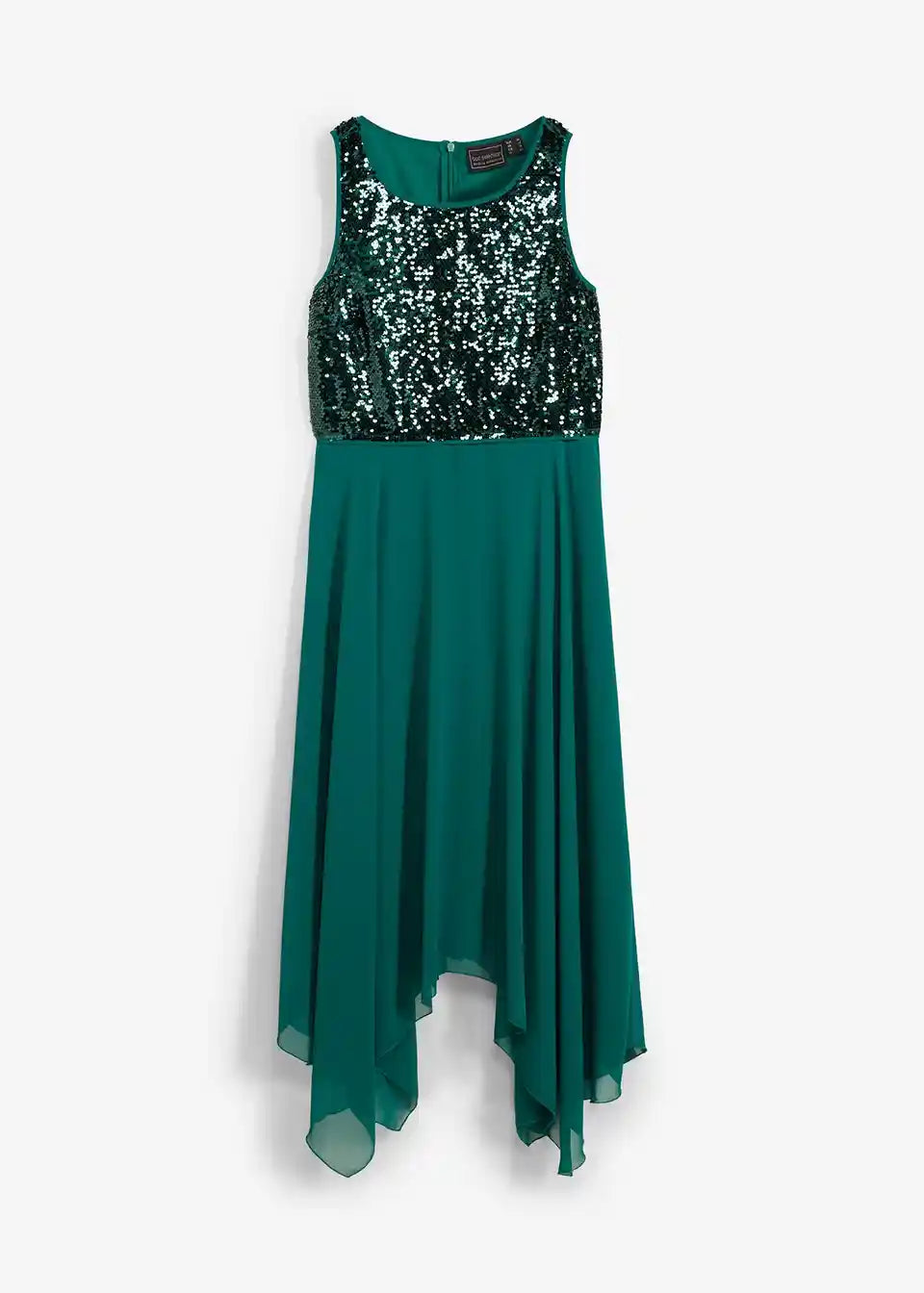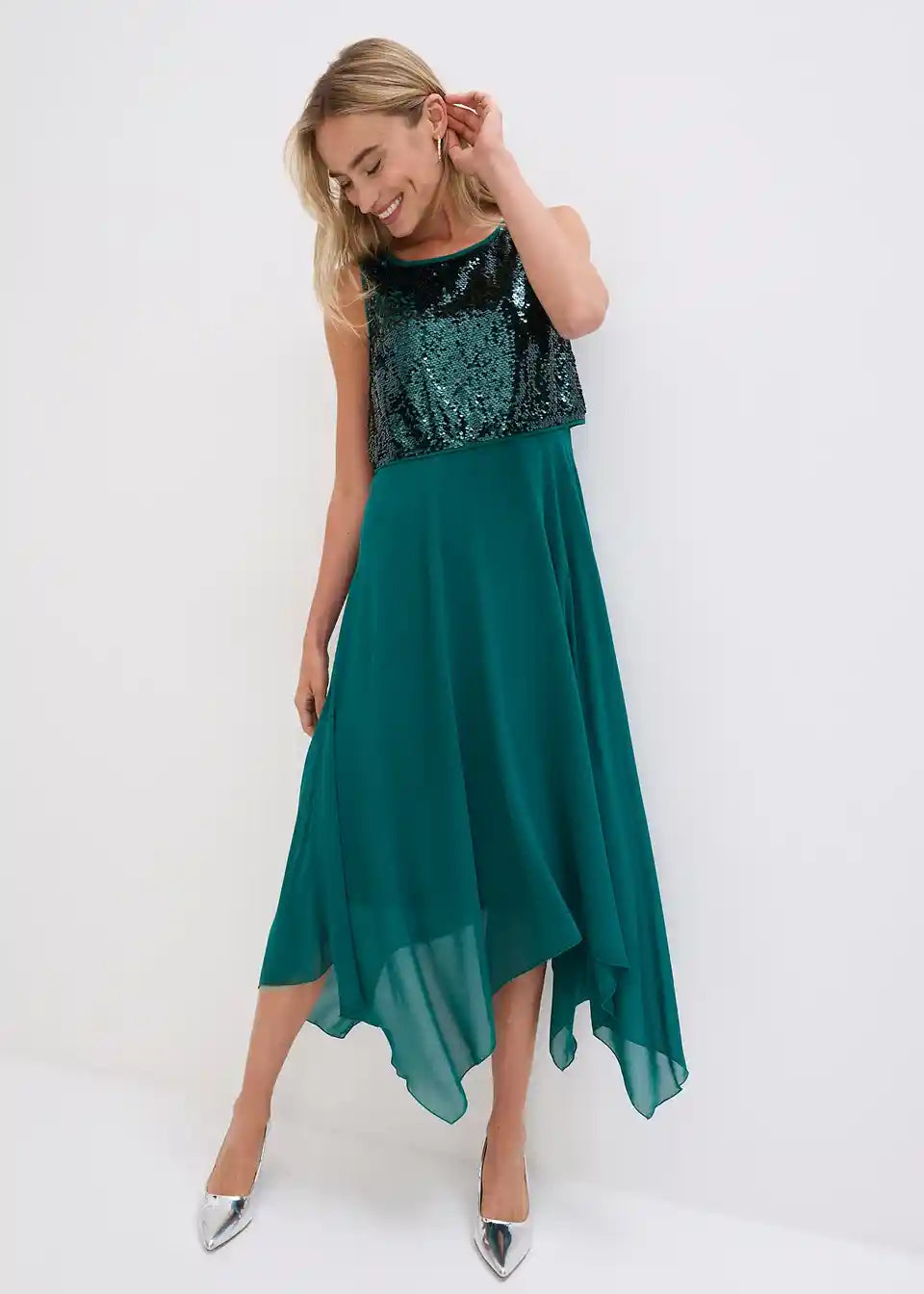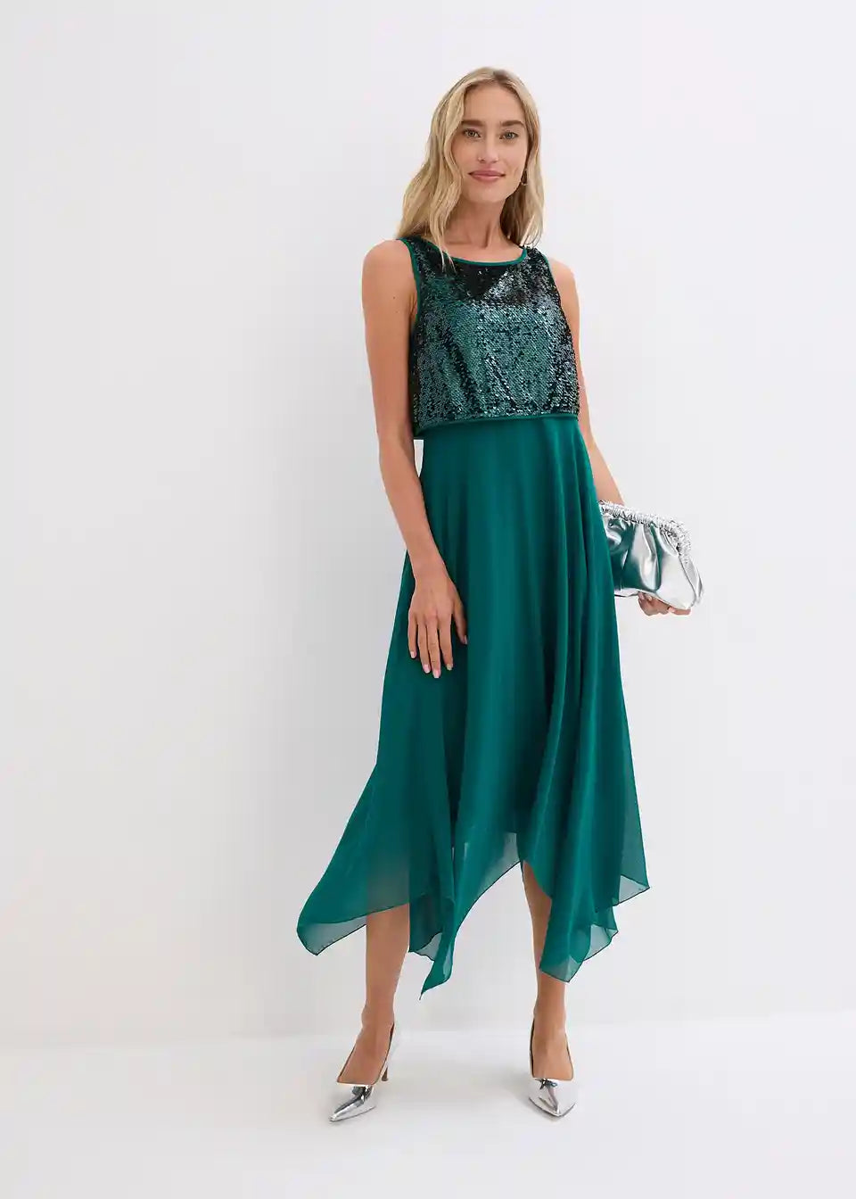 Elegantna večerna obleka s Pailletten zgornjim delom in razkošnim asimetričnim spodnjim delom