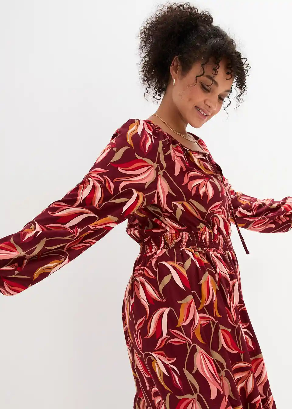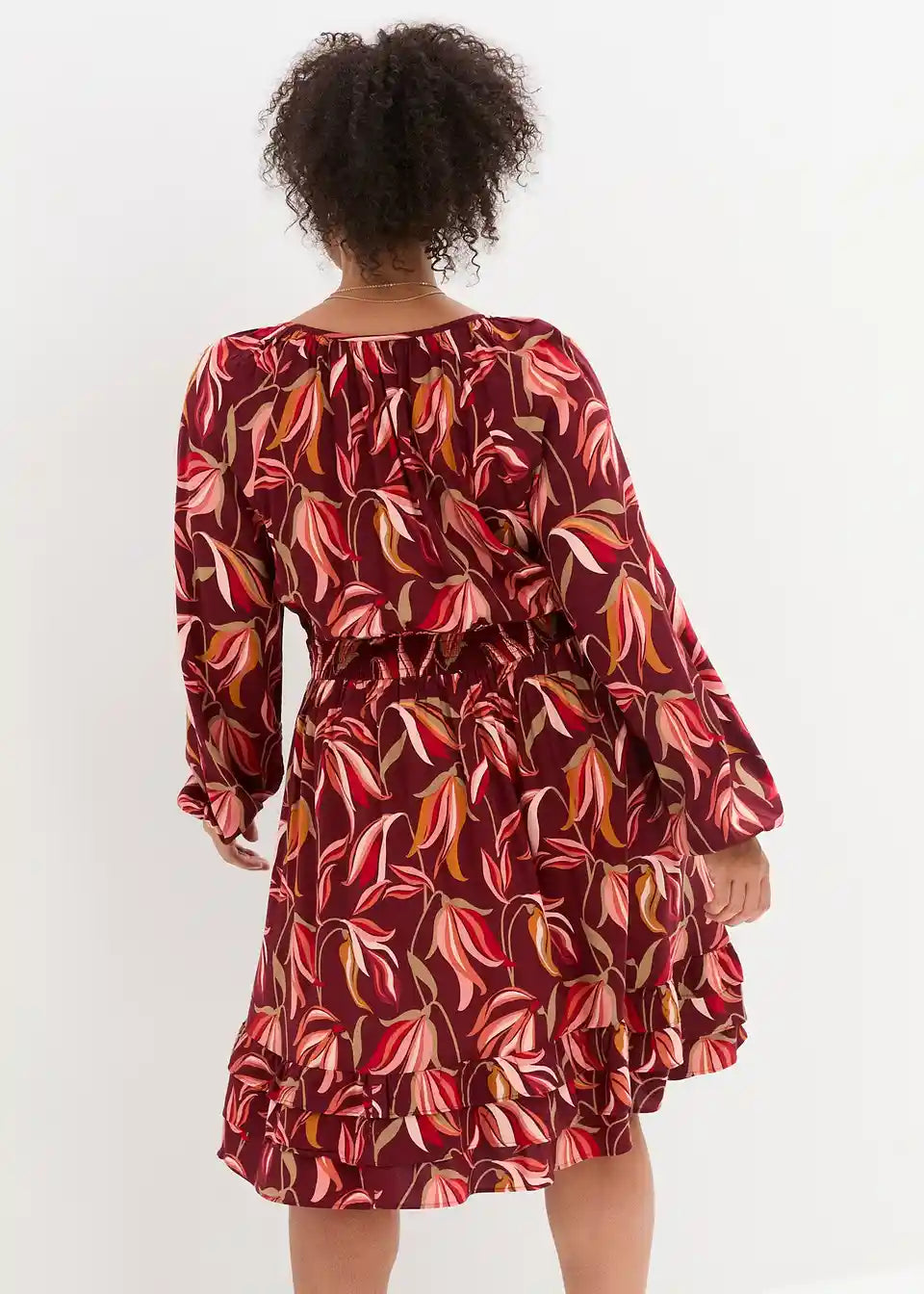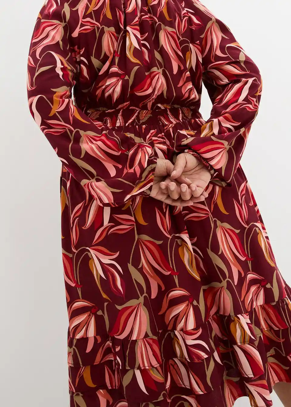 Tkana obleka iz viskoze z gostim naborkom v pasu v dolžini do kolen