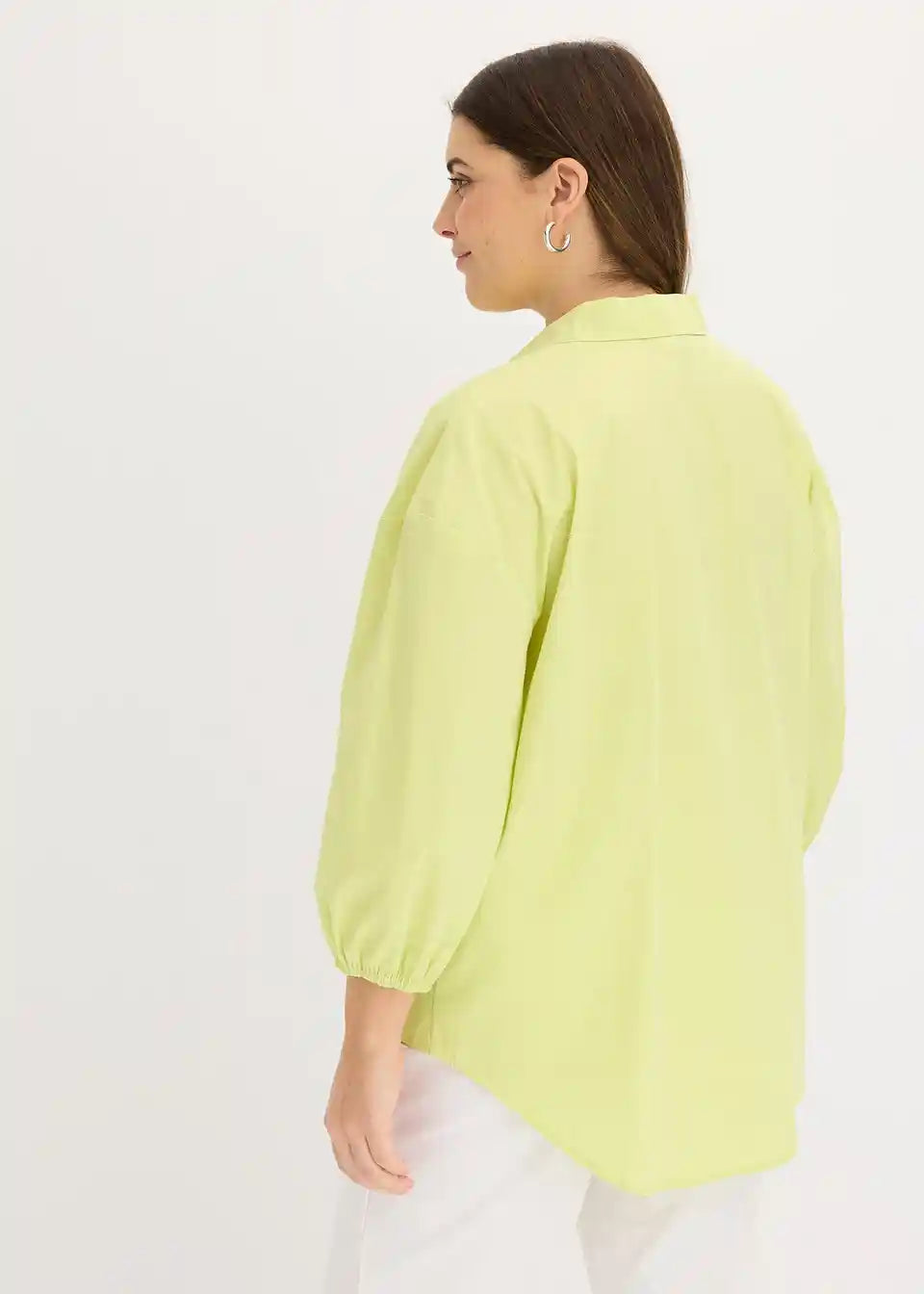 Prostorna bluza z daljšim hrbtnim delom, spuščeni rameni in balonastimi rokavi