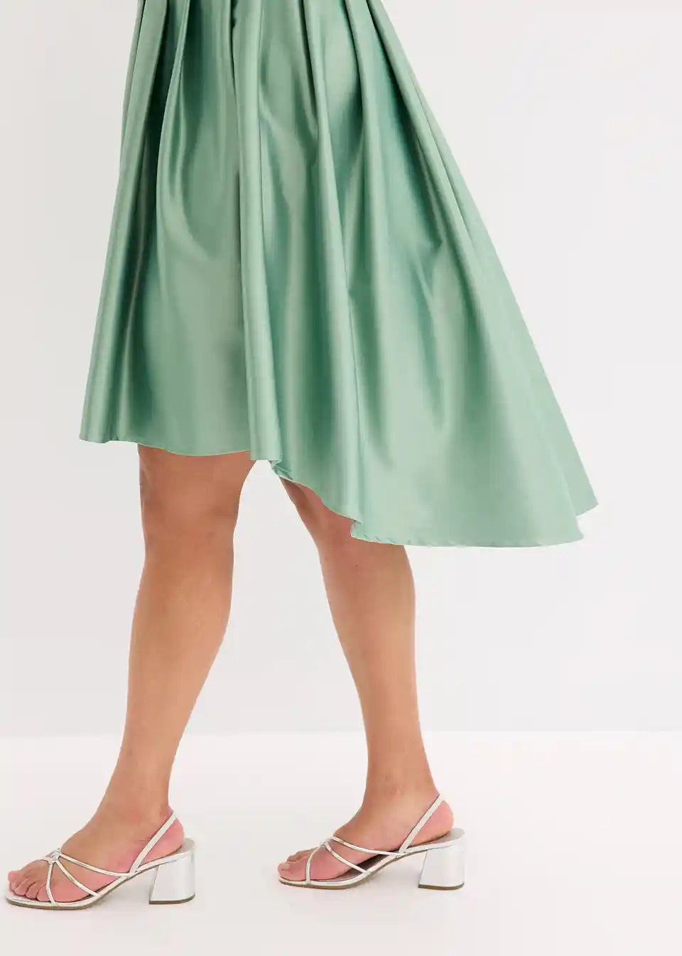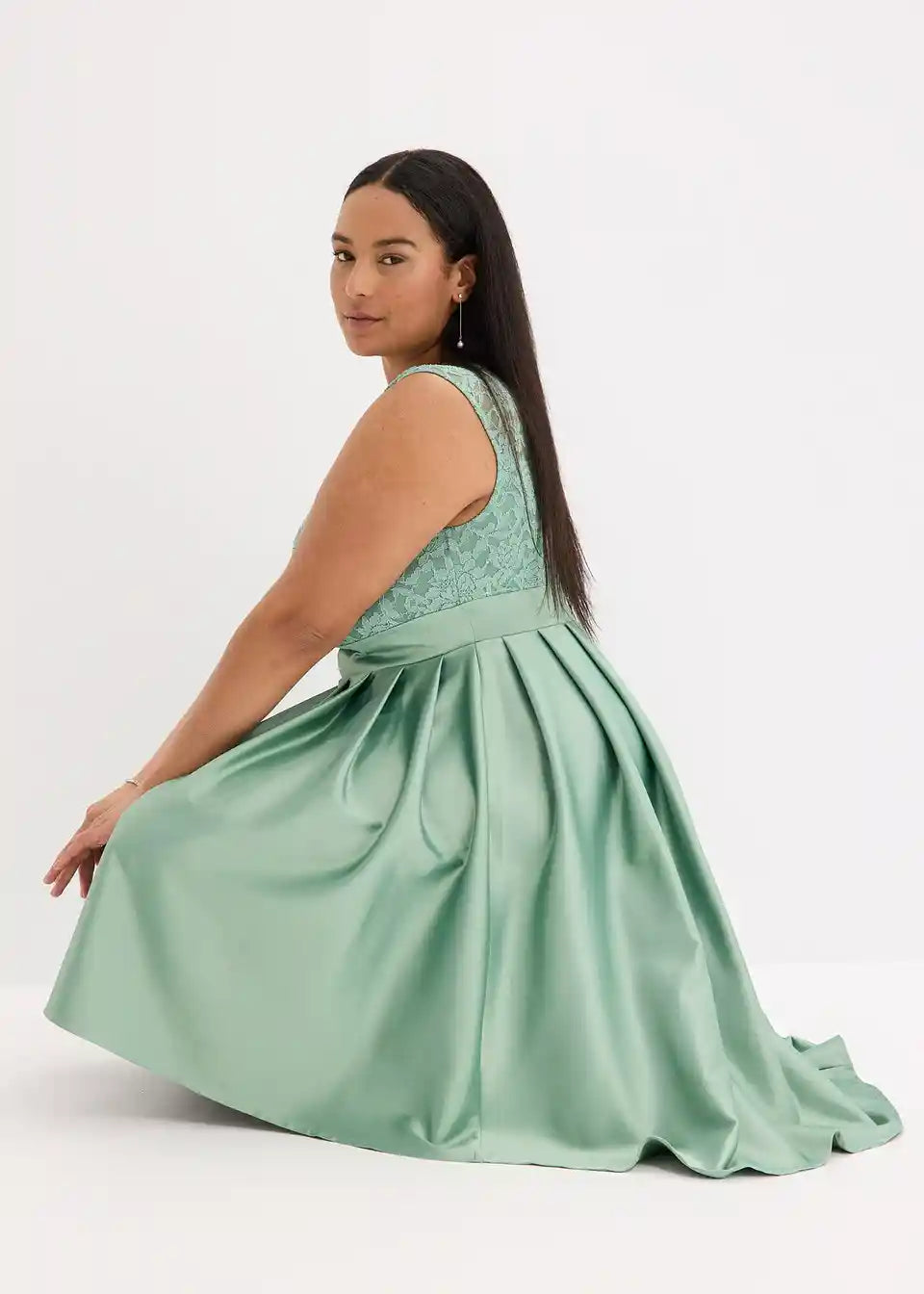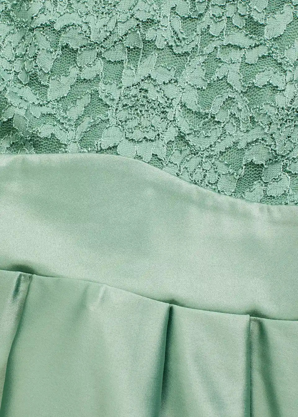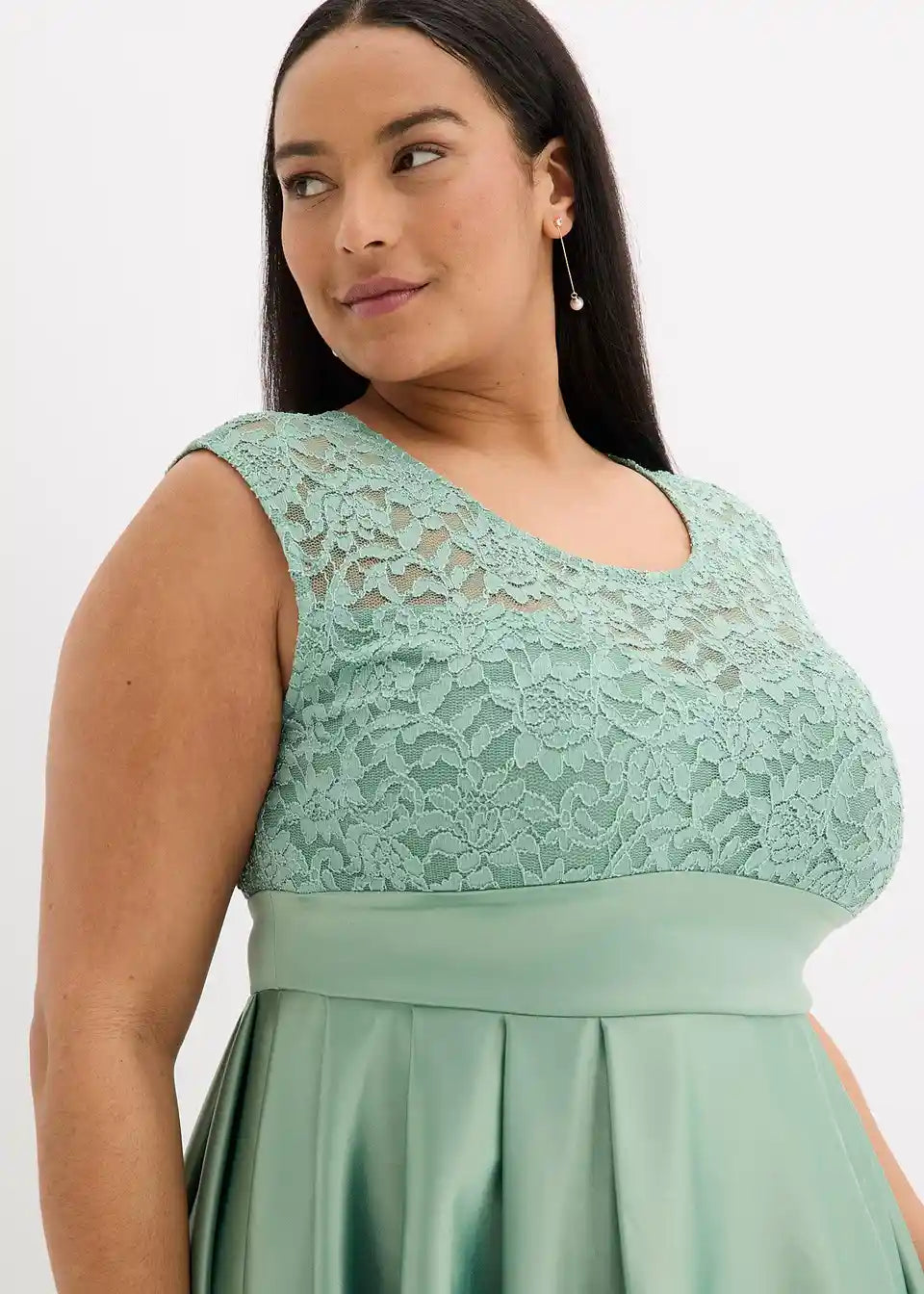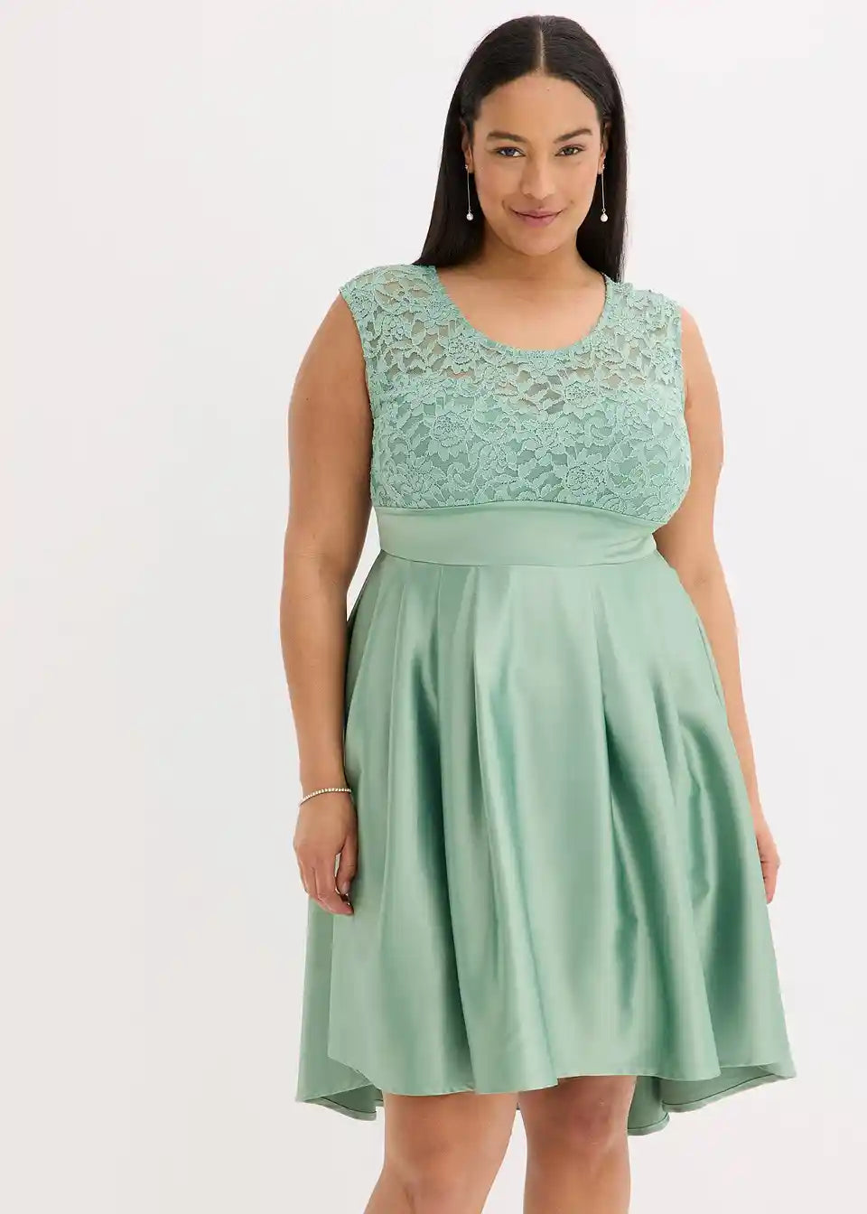Očarljiva koktajl obleka iz sijočega satena z vstavkom v pasu in čipko v zgornjem delu