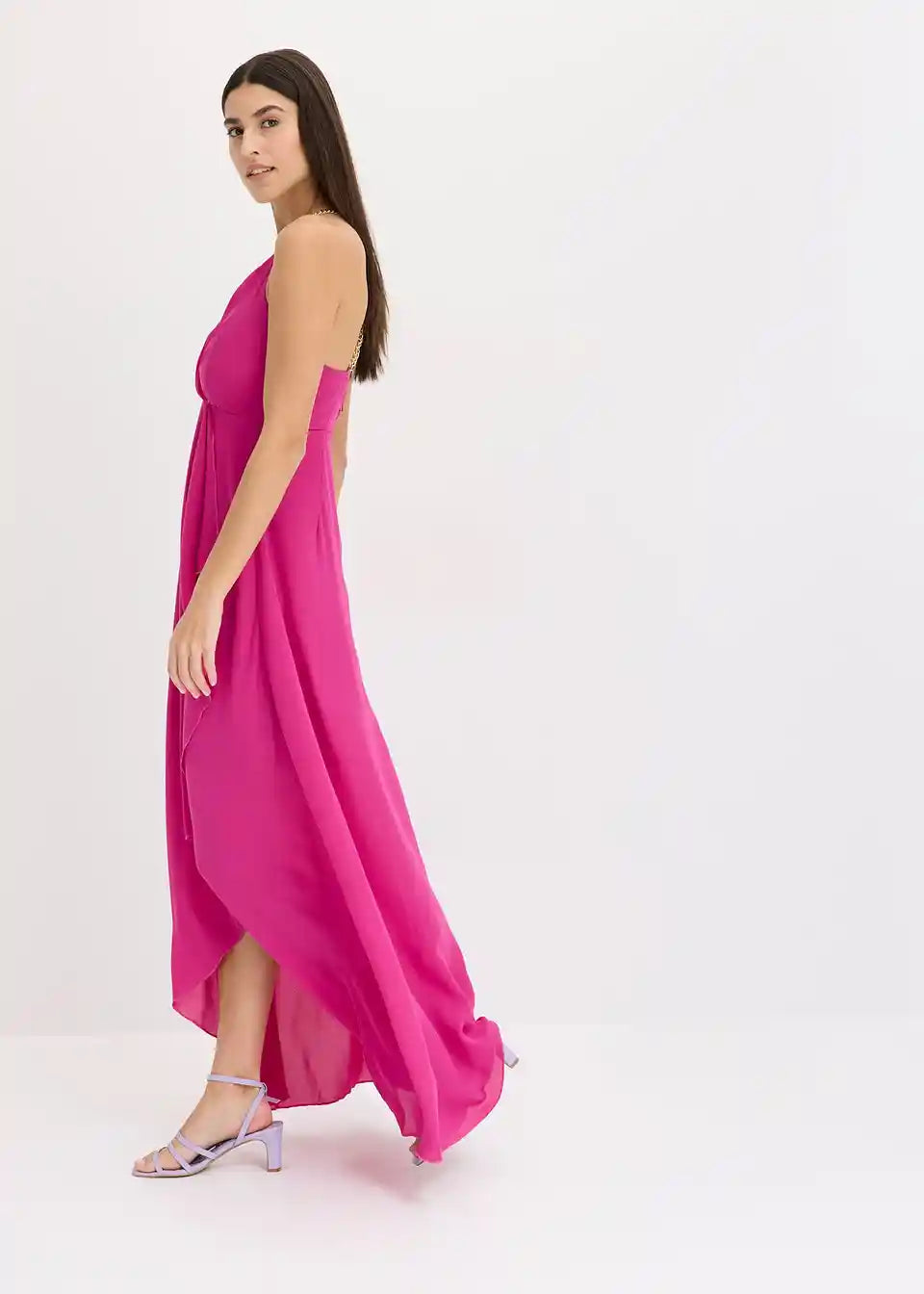 Moderna in ženstvena: Vokuhila obleka maksi dolžine iz tekočega materiala z nastavljivimi verižnimi naramnicami in krilom z videzom ovijanja