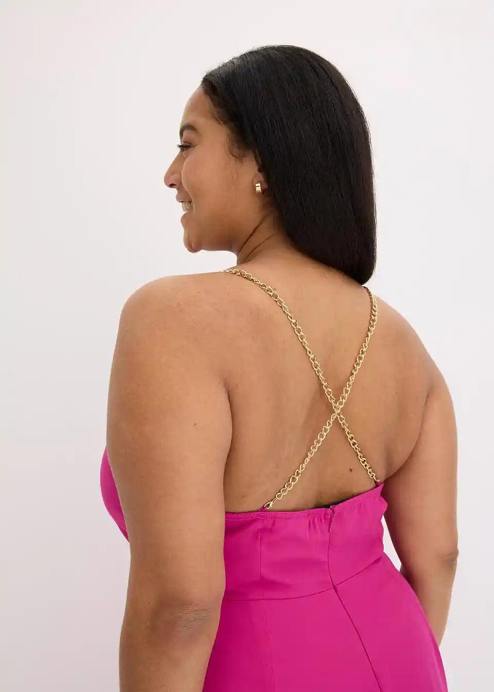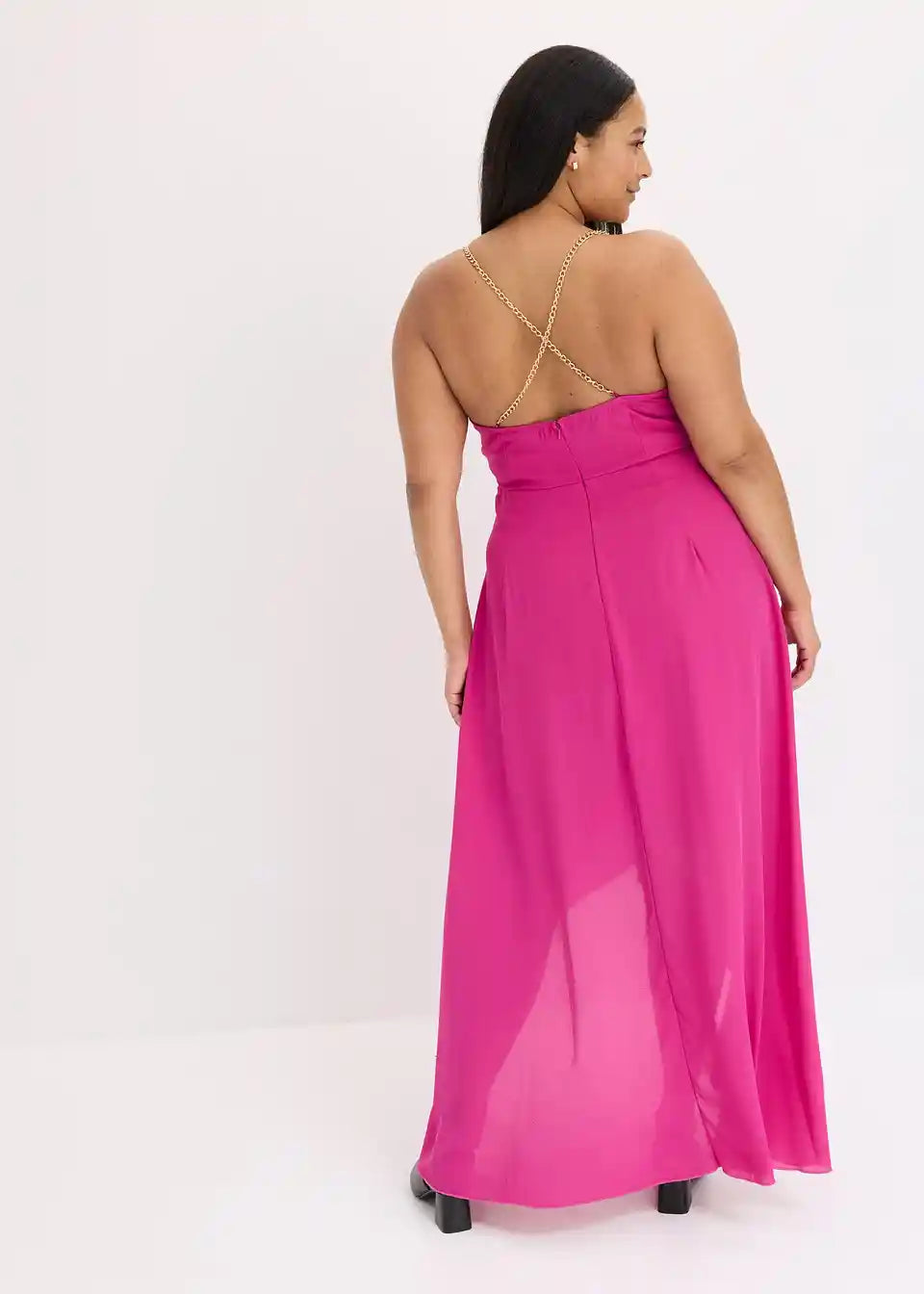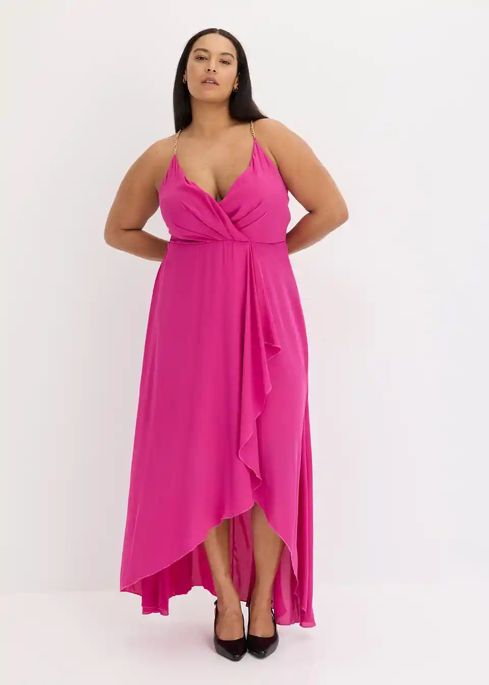Moderna in ženstvena: Vokuhila obleka v maksi dolžini iz tekočega materiala z nastavljivimi verižičnimi naramnicami in krilom z videzom ovijanja