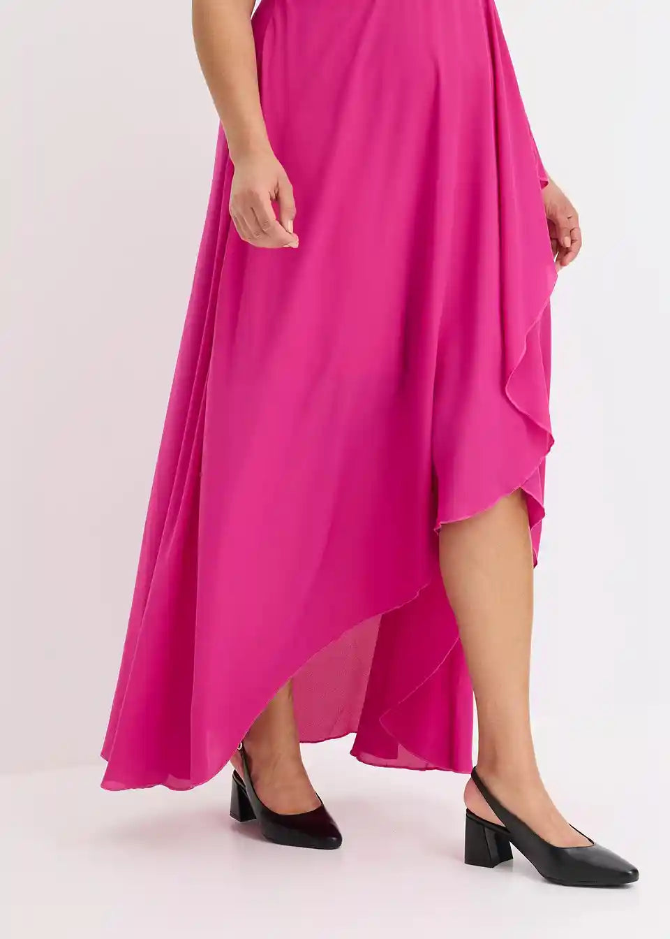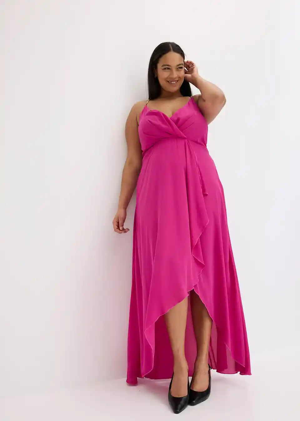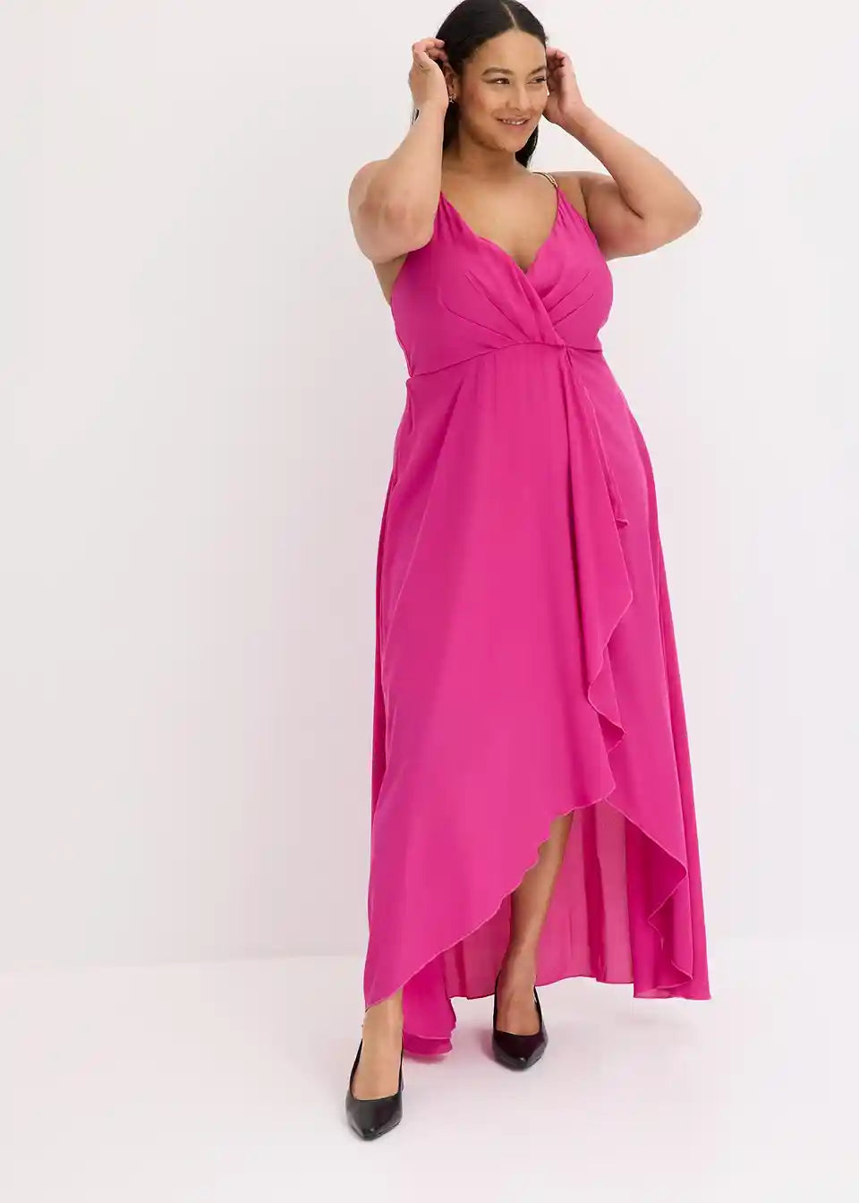 Moderna in ženstvena: Vokuhila obleka v maksi dolžini iz tekočega materiala z nastavljivimi verižičnimi naramnicami in krilom z videzom ovijanja
