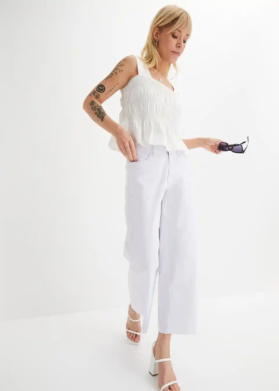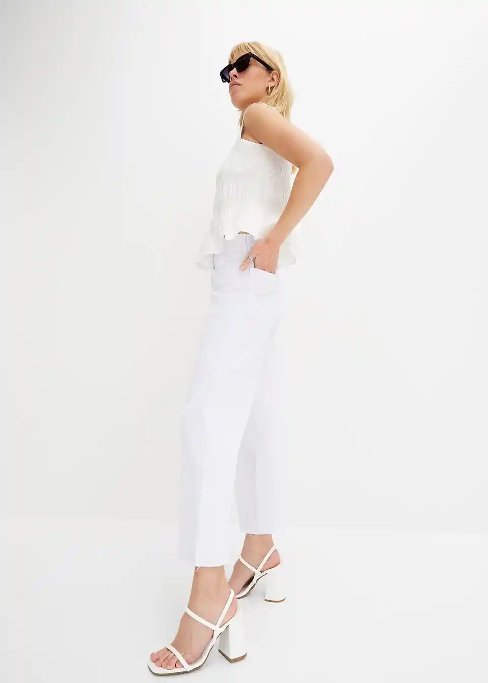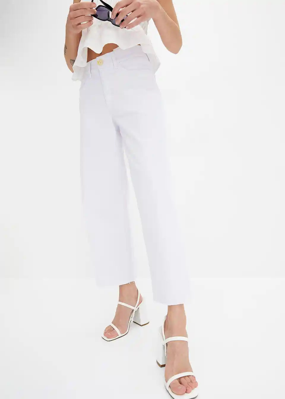 Kavbojke z visokim pasom in širokimi hlačnicami v krajšem kroju