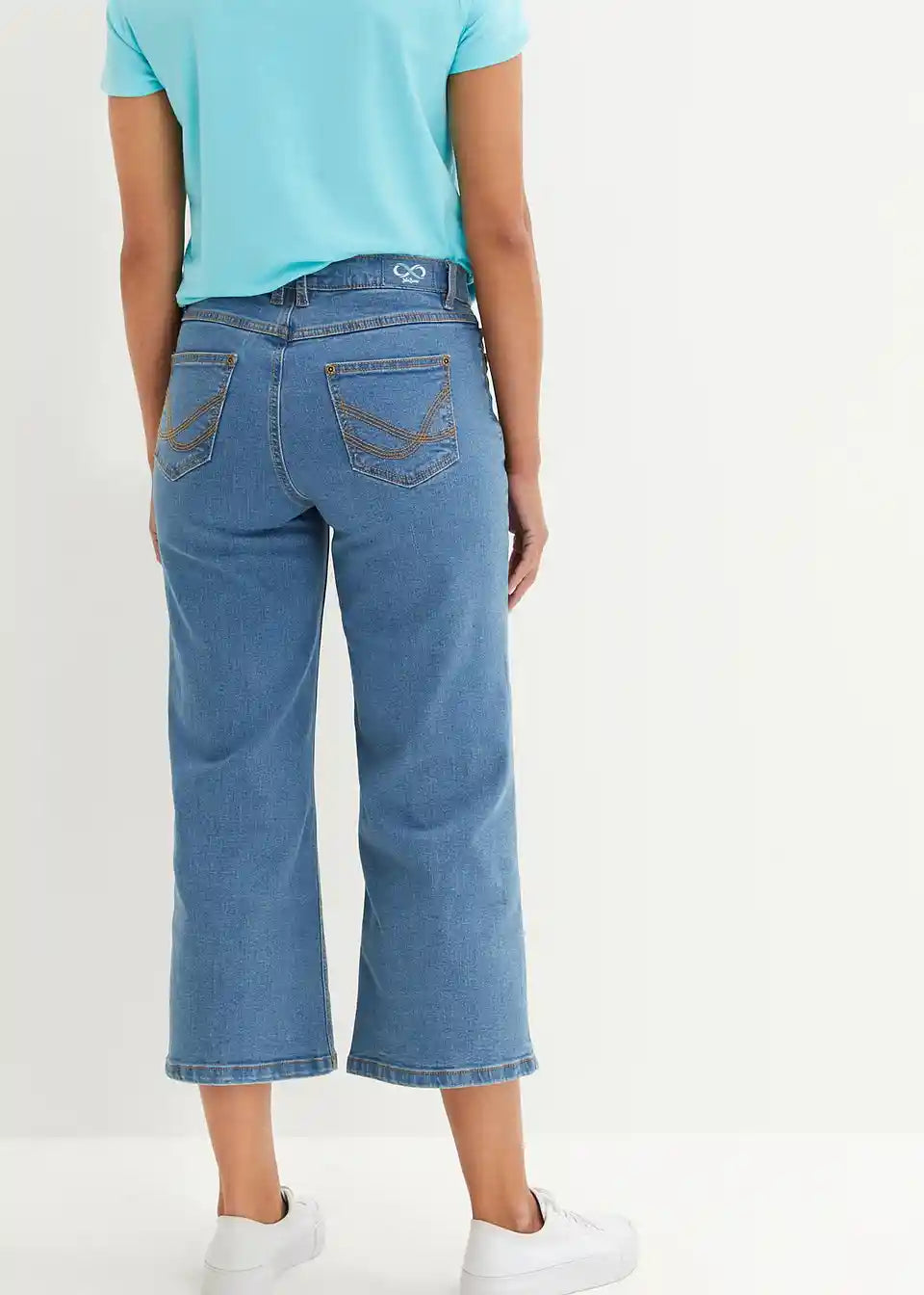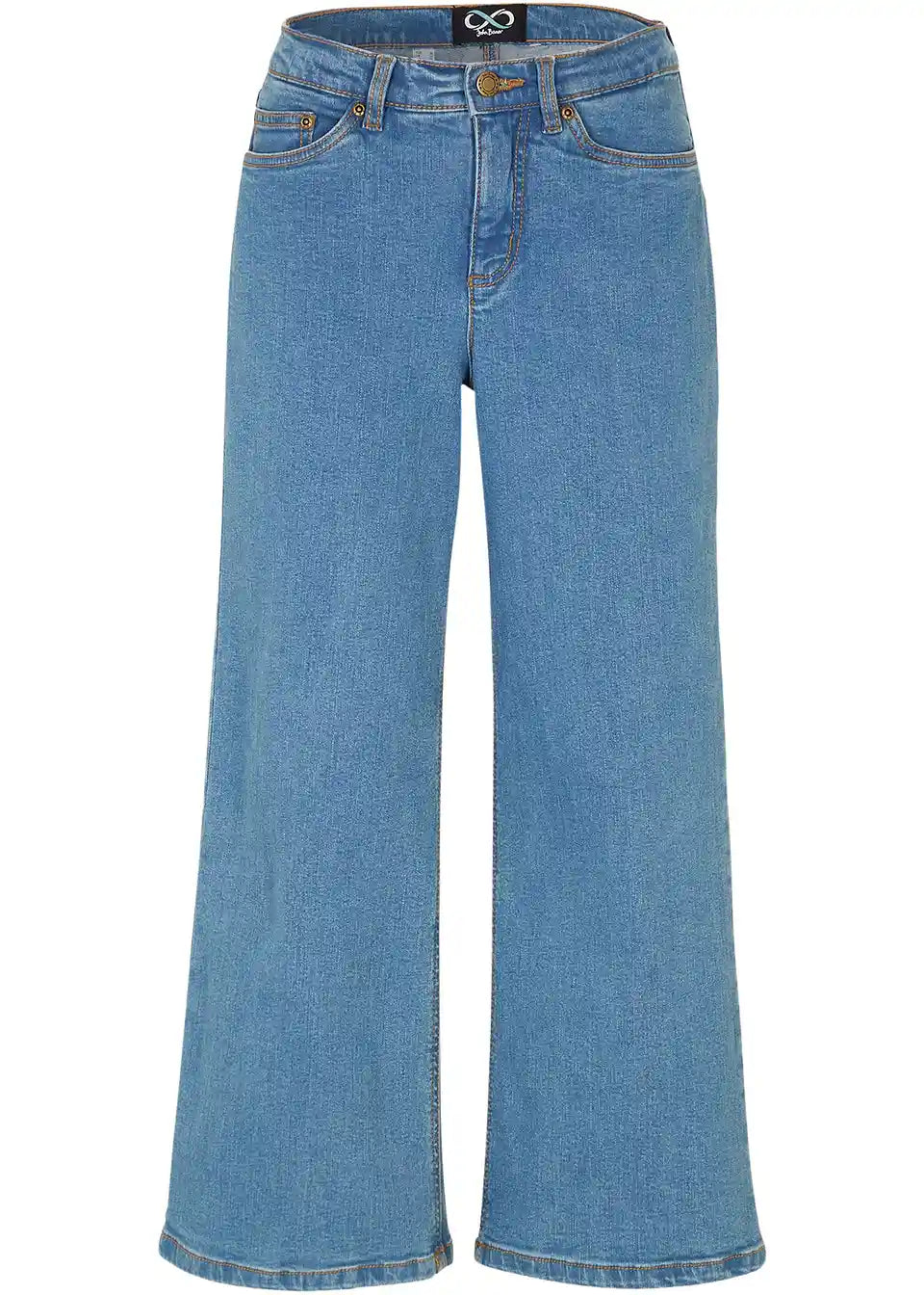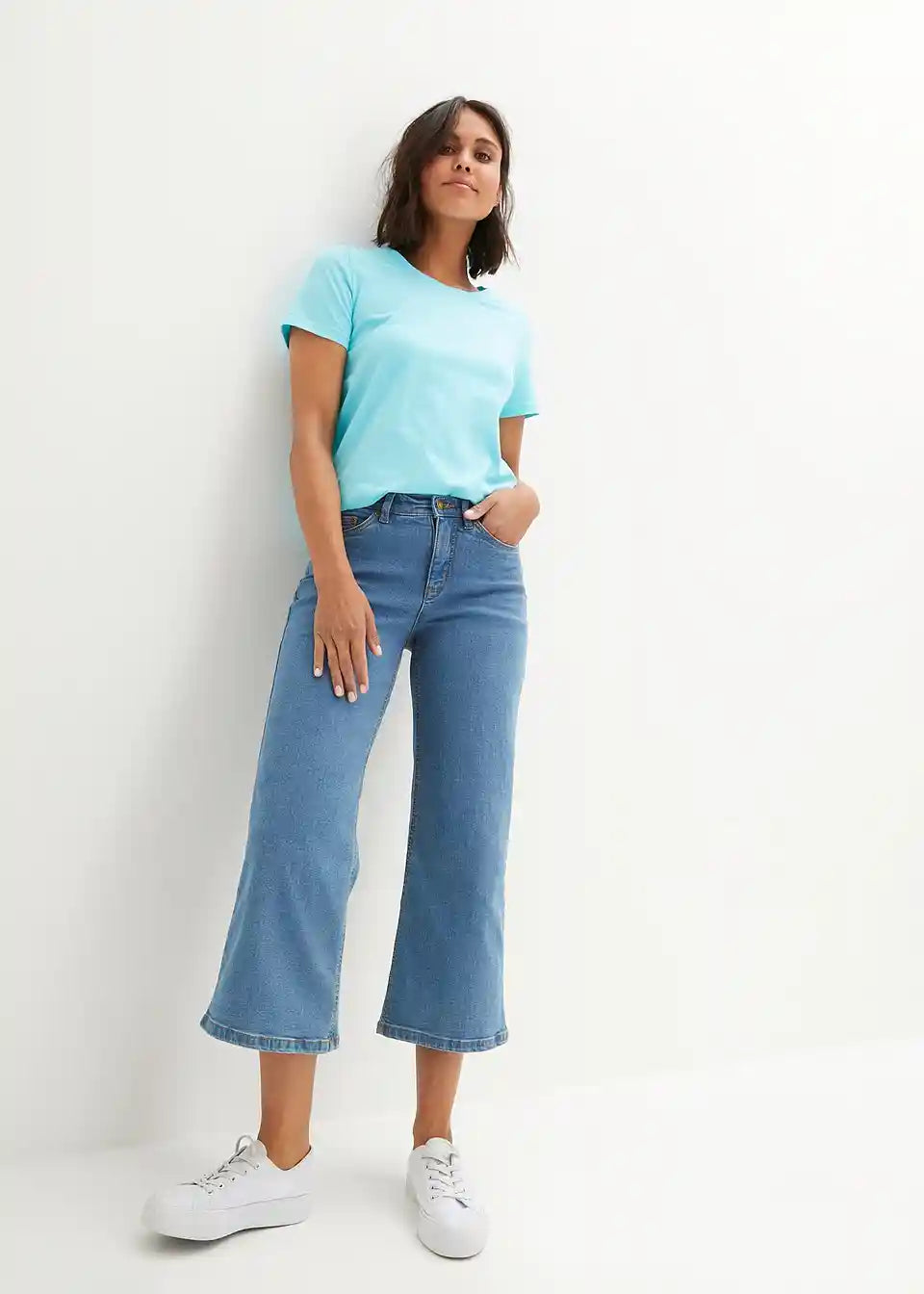 Kavbojke s širokimi hlačnicami in srednje visokim pasom v krajšem kroju