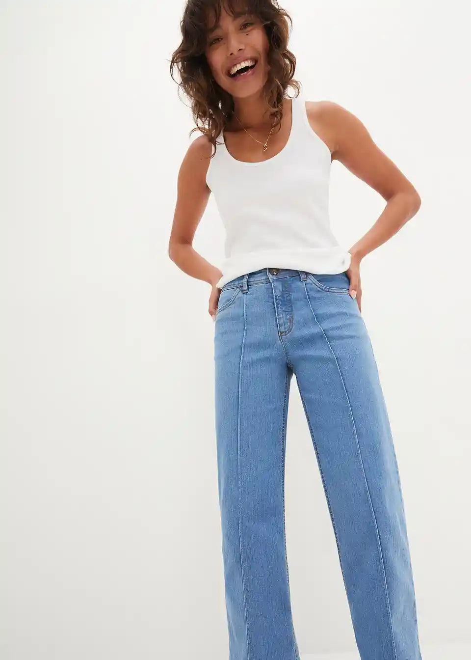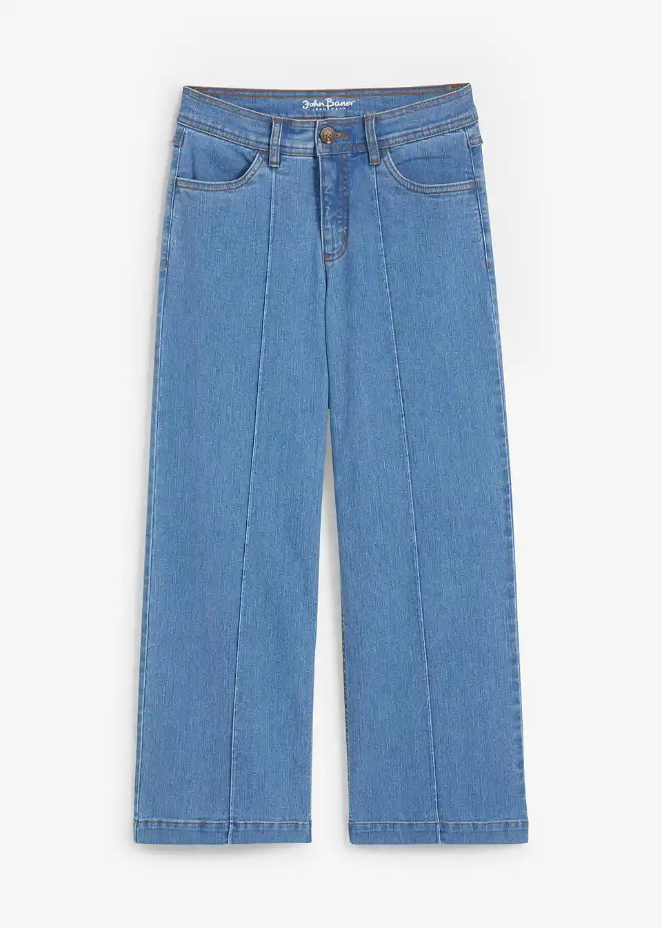 Kavbojke s širokimi hlačnicami in srednje visokim pasom v krajšem kroju