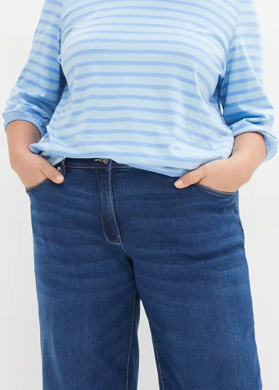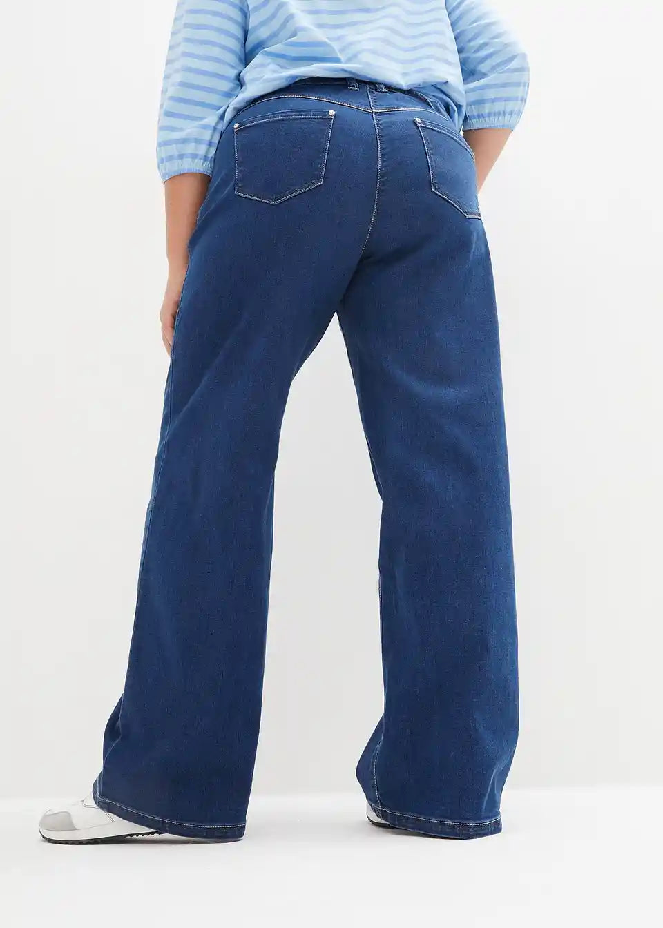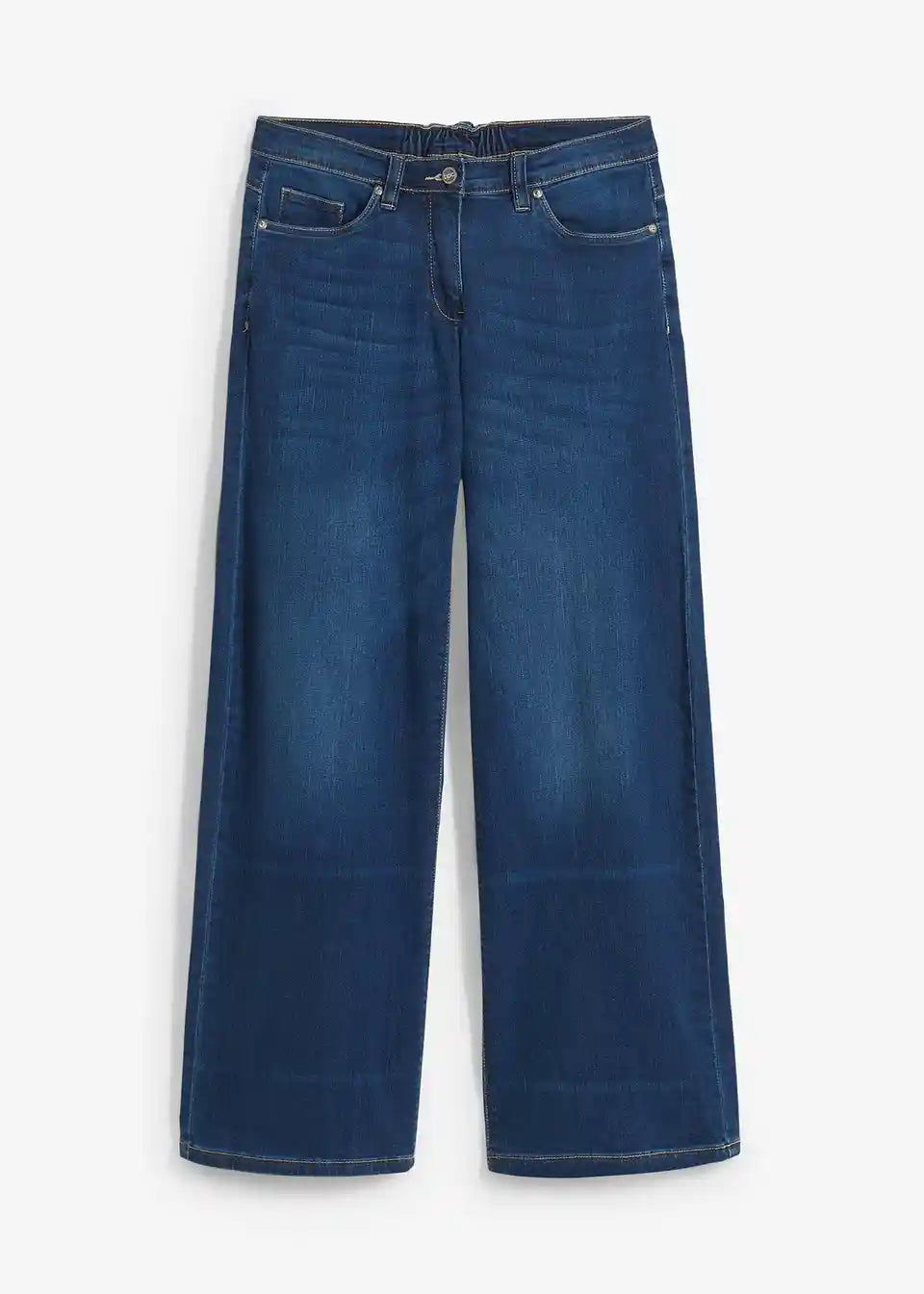 Jeans z visokim udobjem nošenja zaradi udobnega pasu in izjemno širokih hlačnic iz materiala z raztegljivostjo